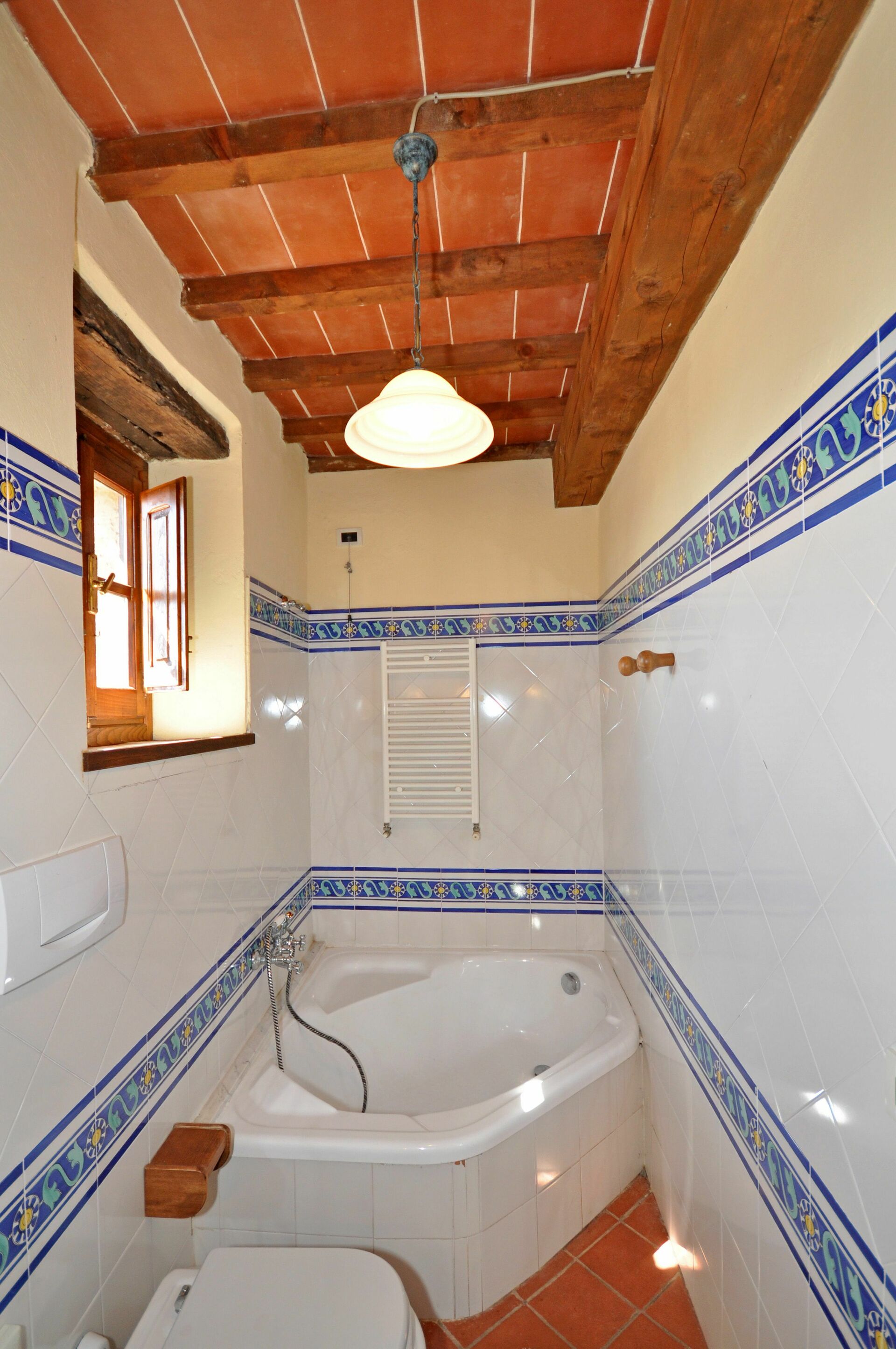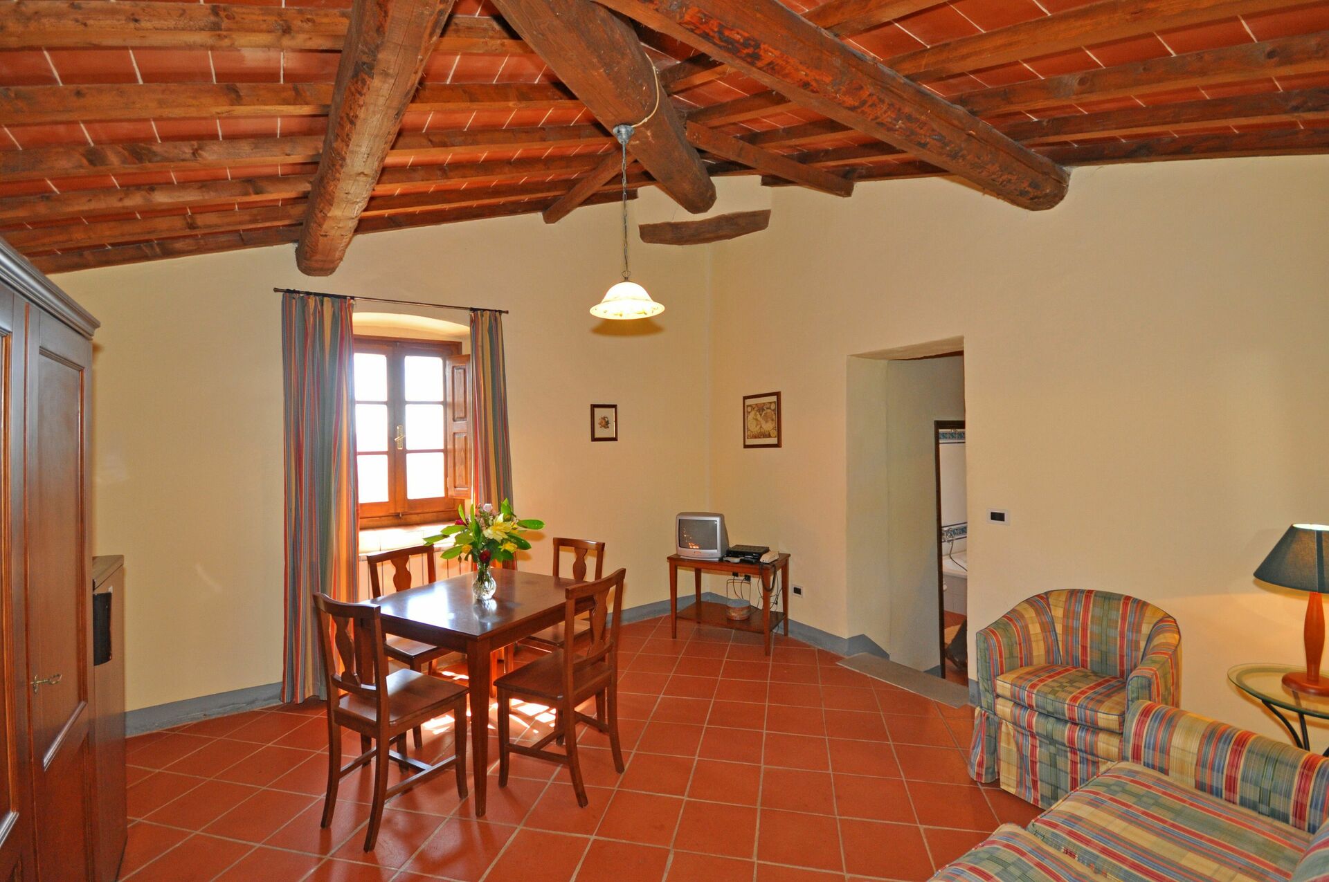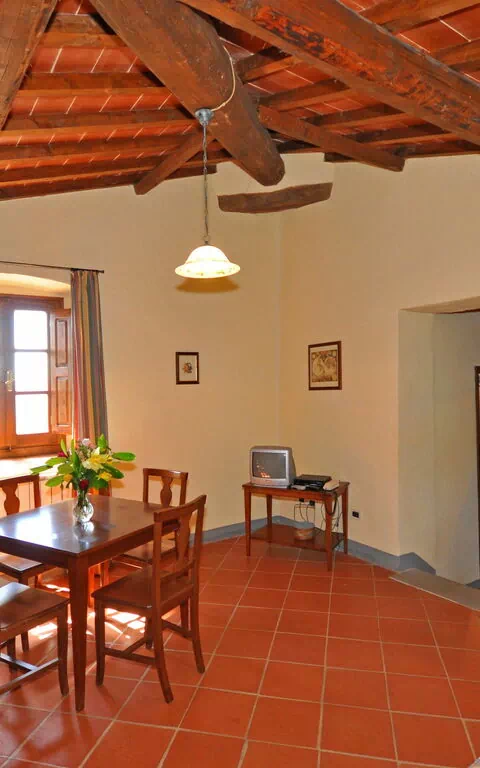 1st floor: living-room (satellite TV) with kitchen corner (2 electric plates) and dining area, small private, covered terrace with table.