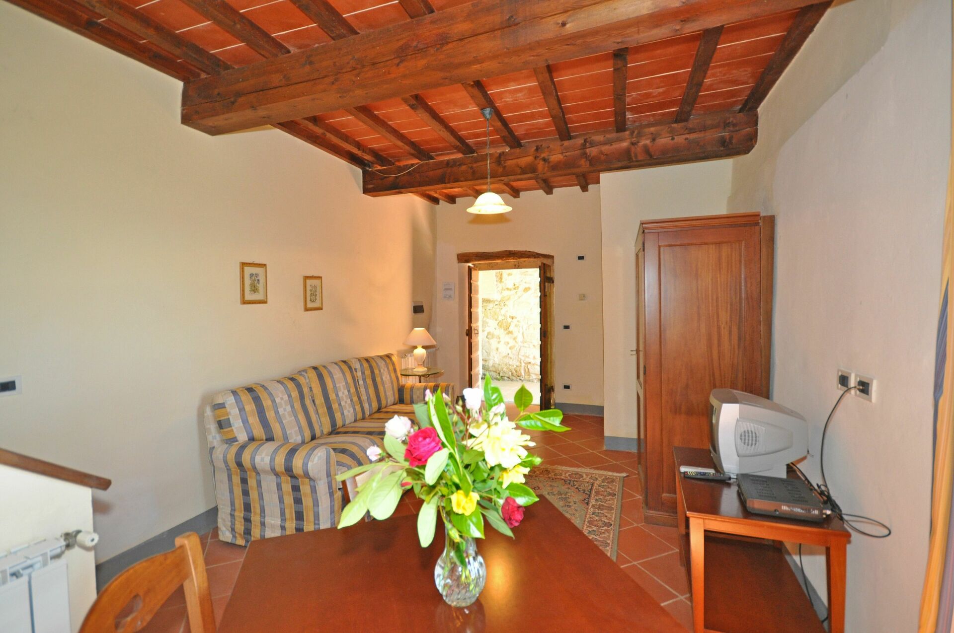 Ground floor: living-room (satellite TV) with kitchen corner (2 electric plates), dining area and access on to a small furnished terrace.