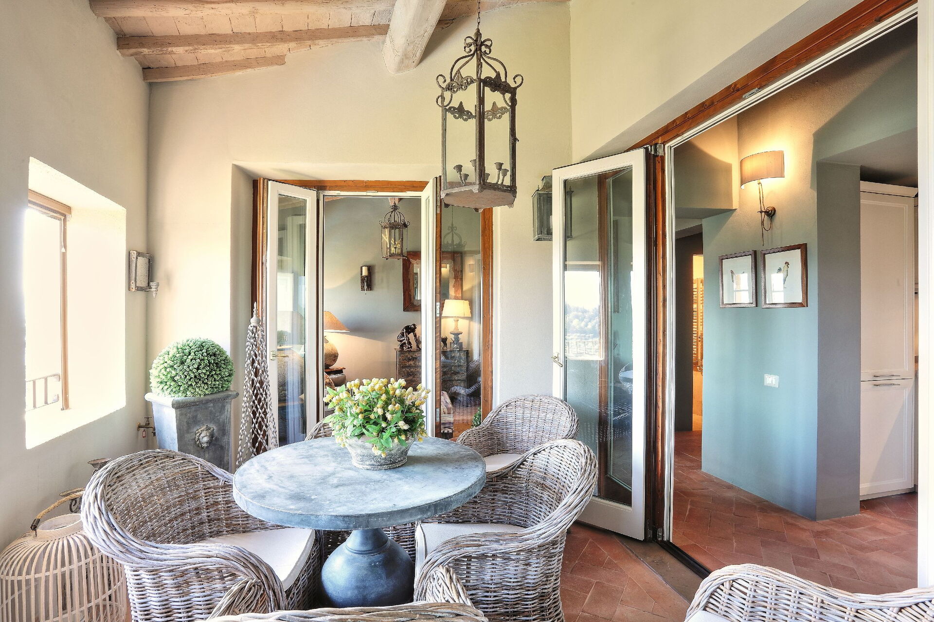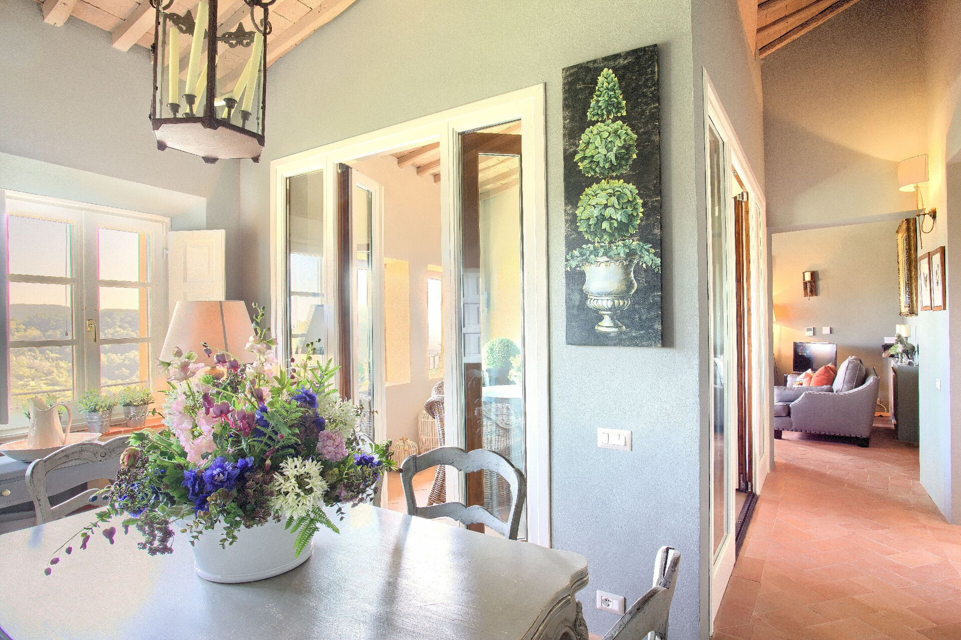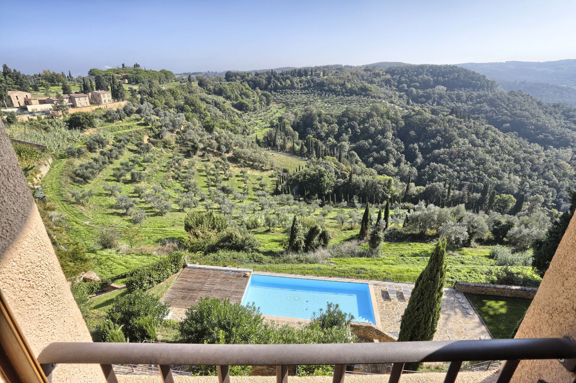 Anden sal: stue, spisestue, køkken ((komfur, køleskab, ovn, opvaskemaskine), badeværelse med bruser, overdækket loggia (lænestole og bord) med panoramaudsigt over bakkerne, swimmingpool og golfbane.