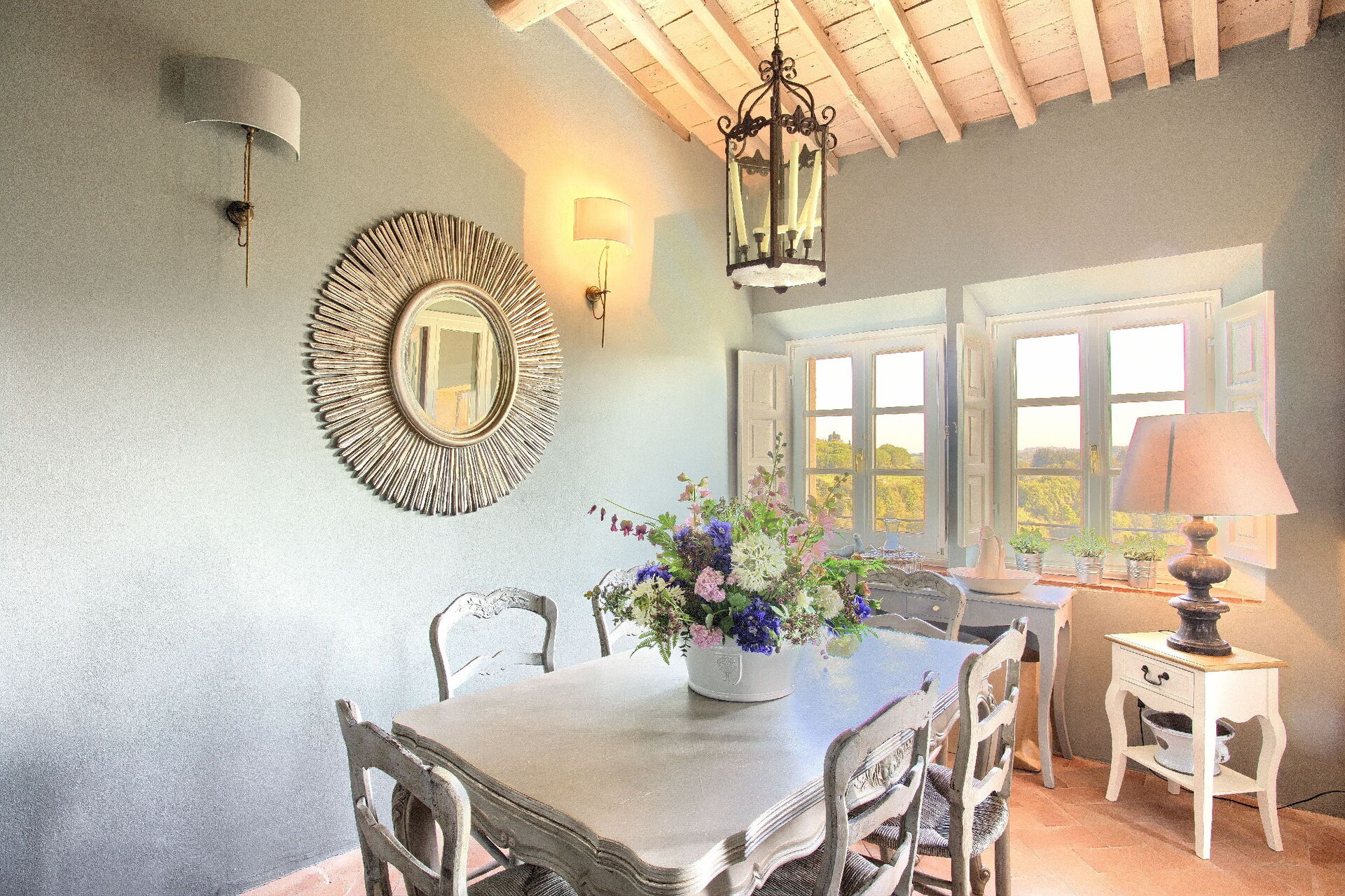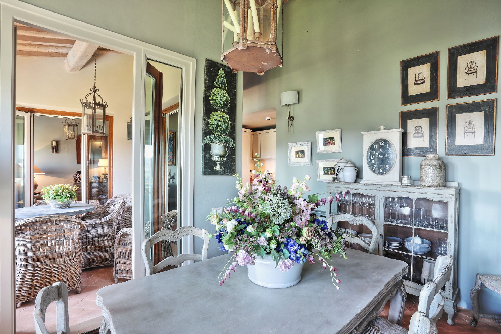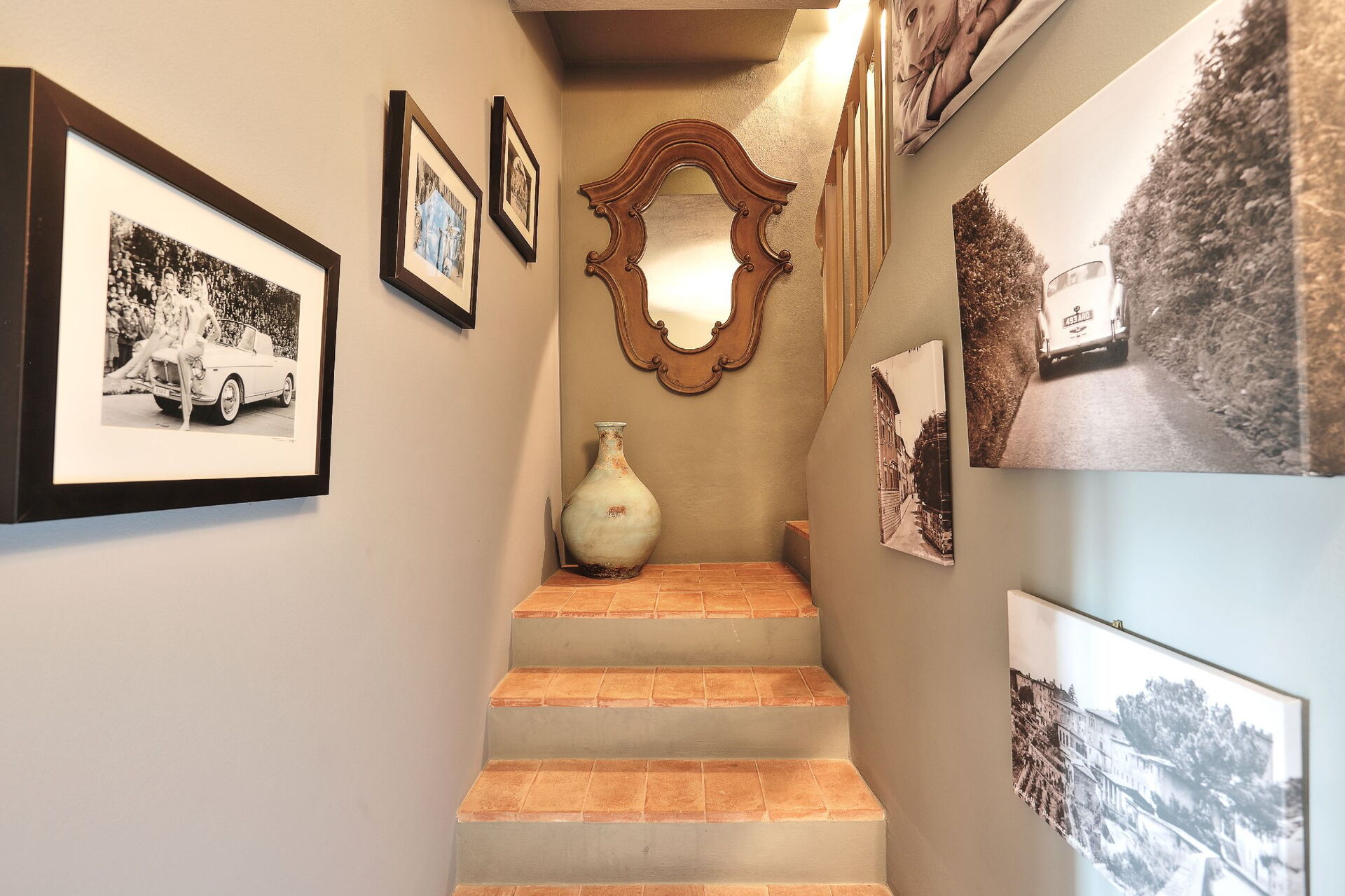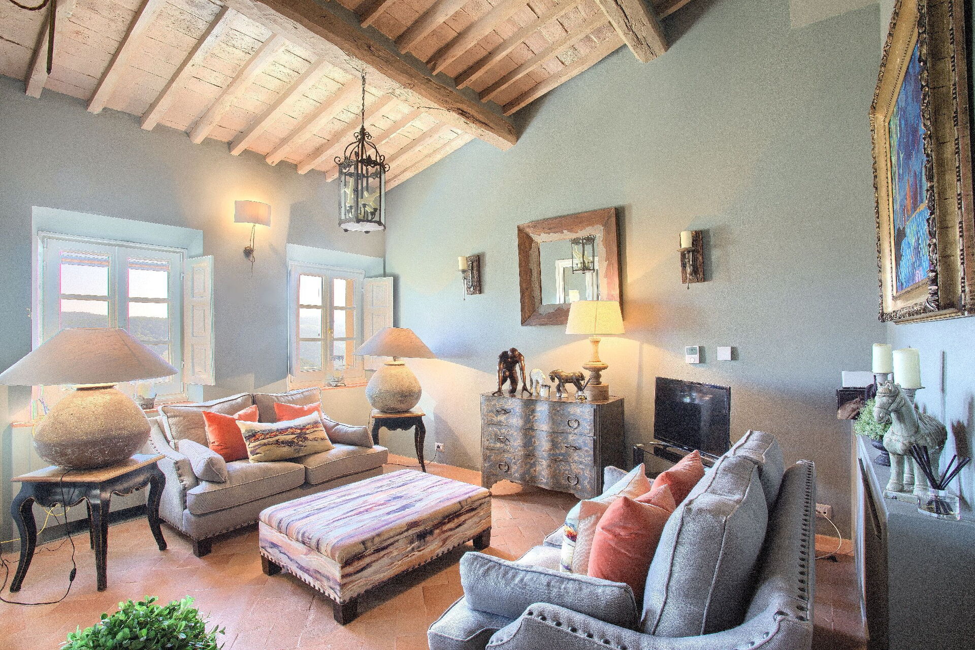 Anden sal: stue, spisestue, køkken ((komfur, køleskab, ovn, opvaskemaskine), badeværelse med bruser, overdækket loggia (lænestole og bord) med panoramaudsigt over bakkerne, swimmingpool og golfbane.