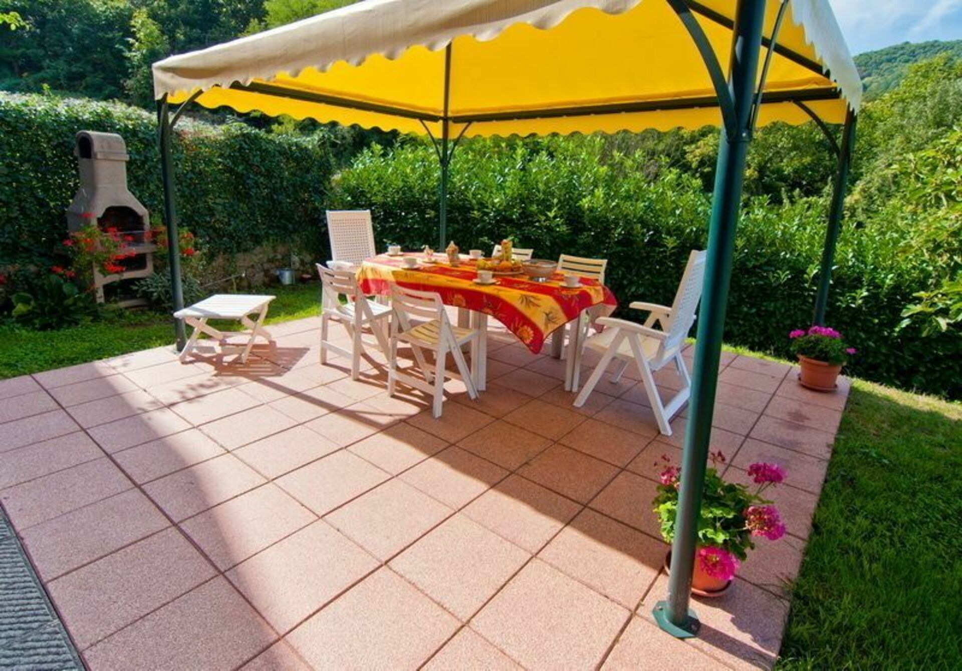 Privat udendørsområde med grill, pavillon, bord og stole.