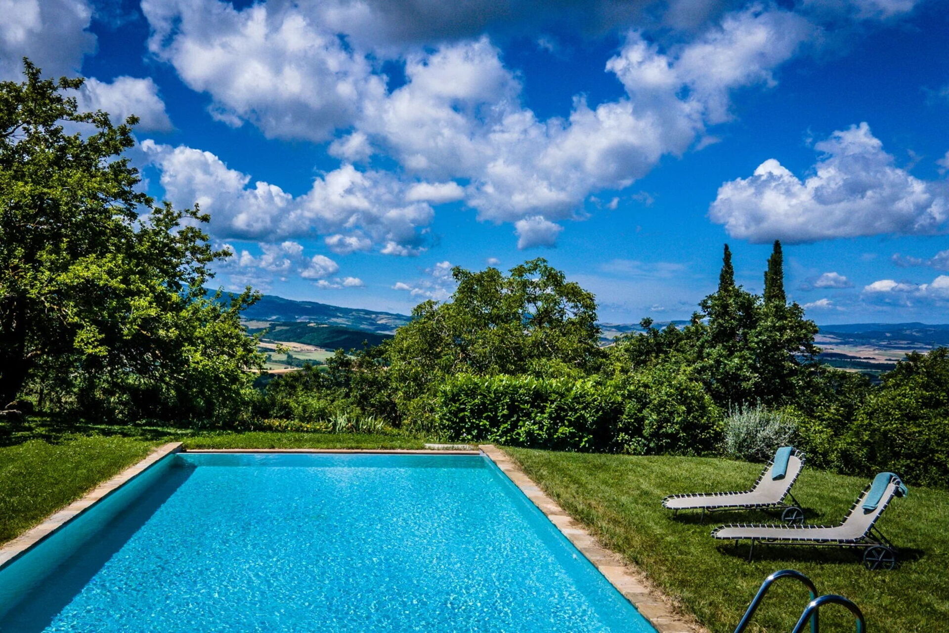 Outside on the grounds, there is a well tended garden with a private, fenced-in pool with panoramic views: there are sun loungers and umbrellas for relaxing and cooling off with friends and family.