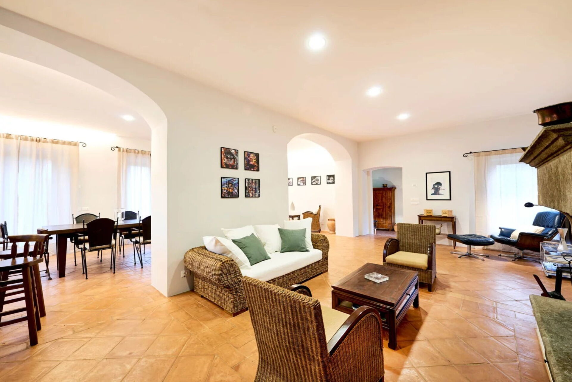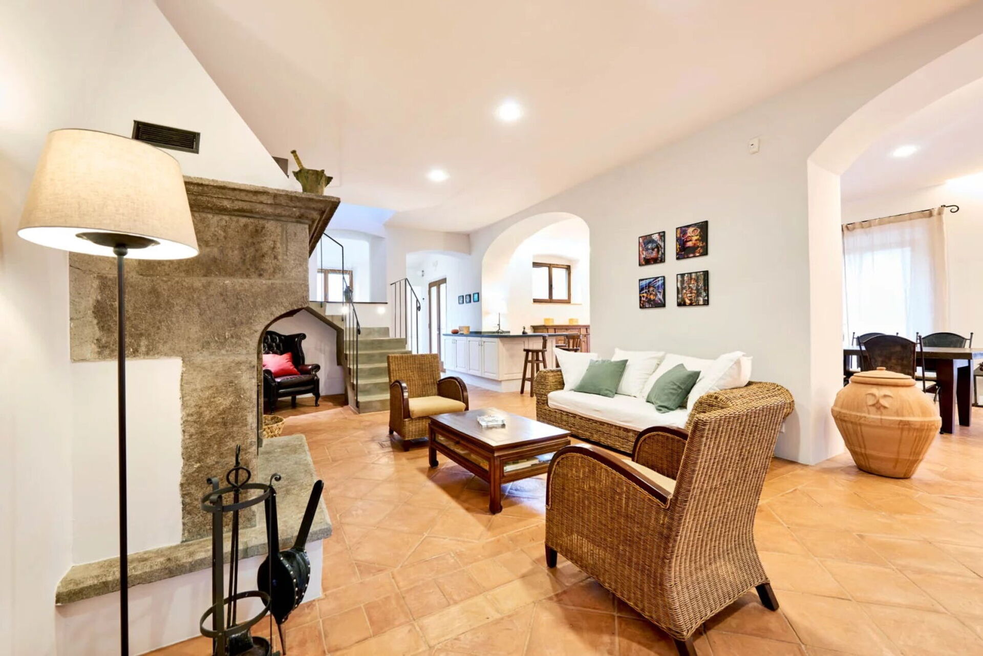 First floor: (accessible both from the inside and via an outdoor staircase); living room with fireplace, kitchen (oven, cook top, refrigerator, freezer), double bedroom with a private bathroom with shower, double bedroom, bathroom with a bathtub and shower, 1 double bedroom, bathroom with shower, double bedroom.