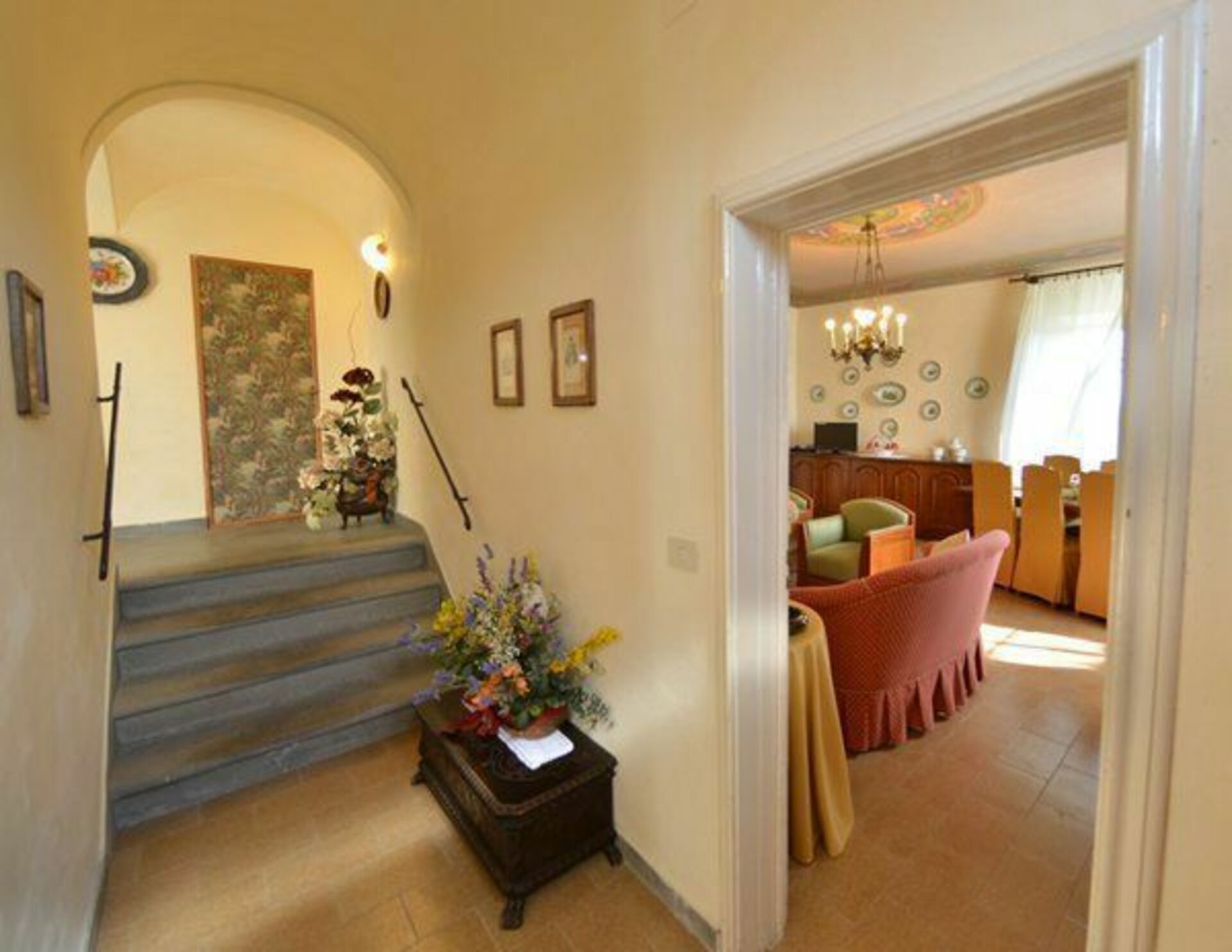 Stueetage: indgang, et stort køkken komplet møbleret med pejs, et vaskerum (vaskemaskine, strygejern, strygebræt), en stor stue med fresco loft, stor spisestue, 1 badeværelse med bruser.