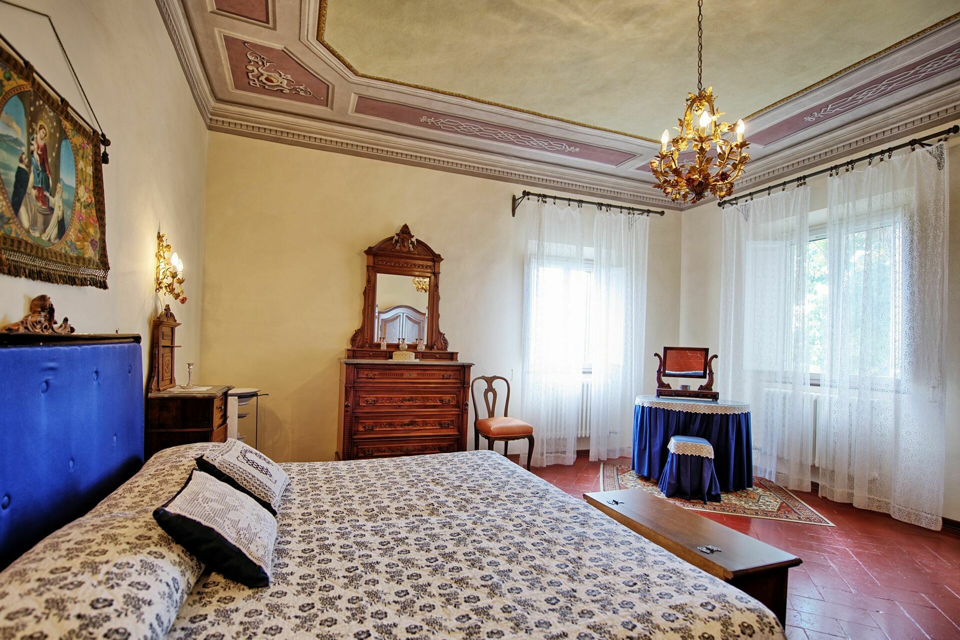 Første sal: 1 soveværelse med fresco loft med en dobbeltseng, 2 soveværelser (fresco loft) med en dobbeltseng (konverteres til to), 1 soveværelse med to enkeltsenge. 2 badeværelser: et med bruser og et med badekar.