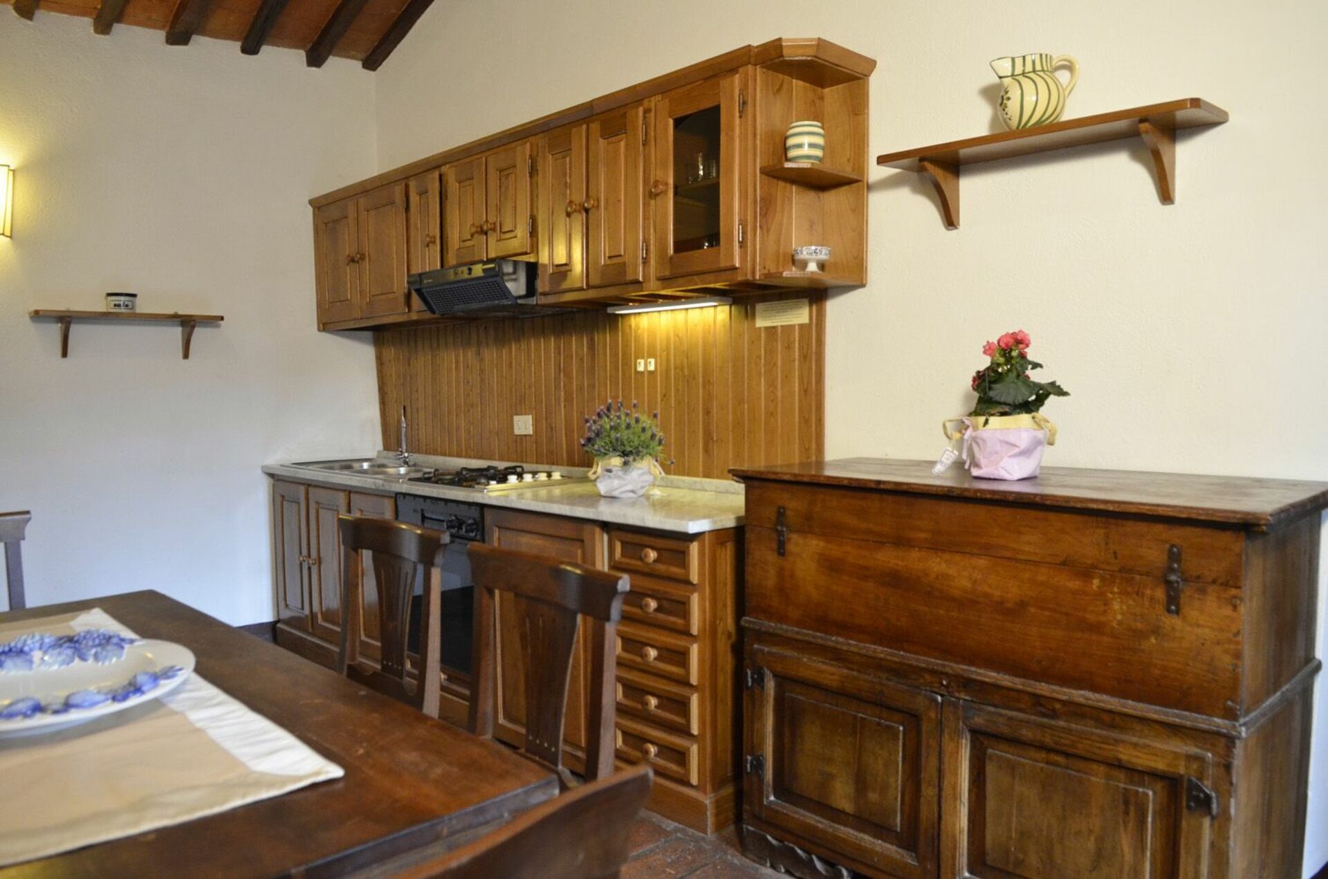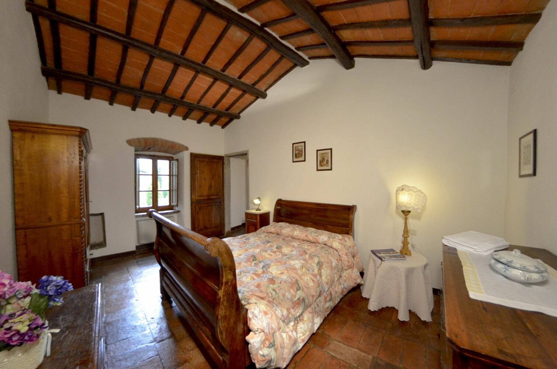 Første sal: opholdsstue med spiseplads og køkkenniche, 1 dobbeltværelse, 1 værelse med 3 enkeltsenge, badeværelse med bruser.