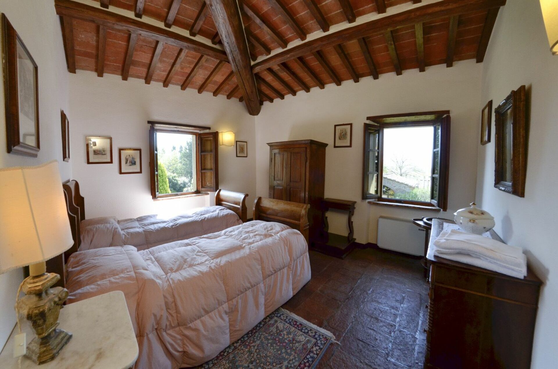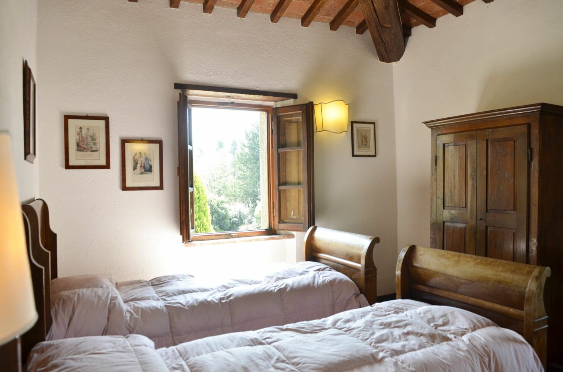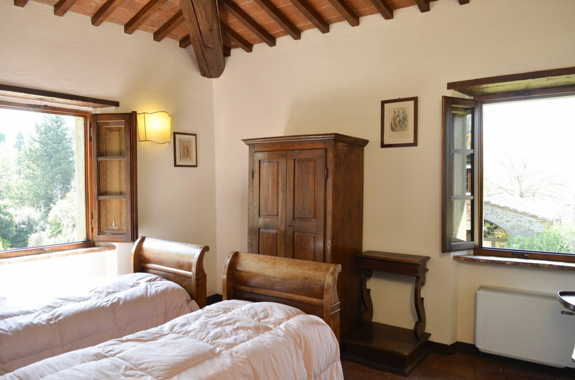 Første sal: dobbeltværelse, værelse med 2 enkeltsenge, badeværelse med bruser.