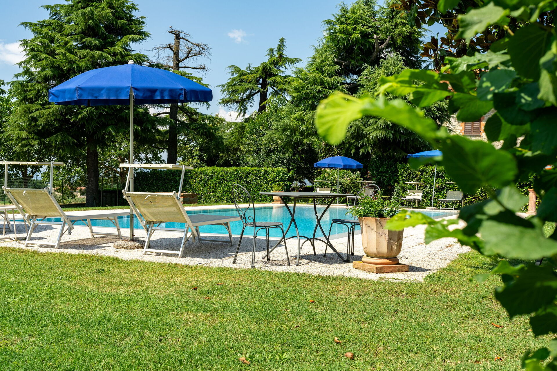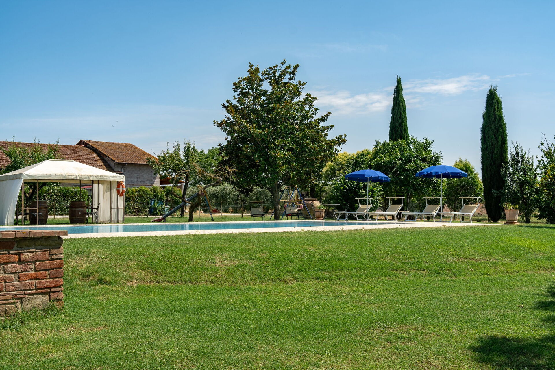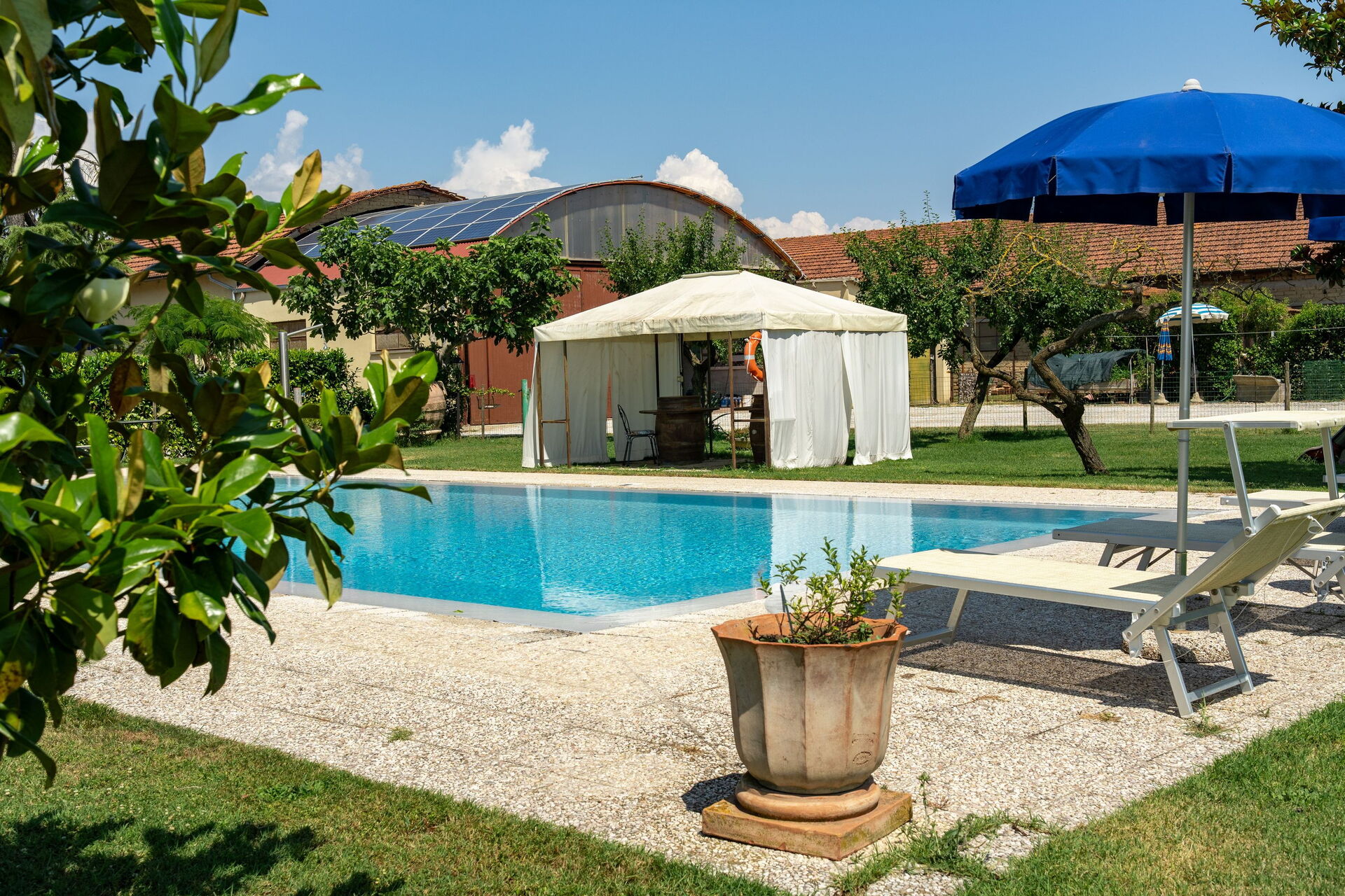 Swimmingpoolen ligger 30 meter fra huset, og på trods af ejerne og gårdens tætte placering er poolen kun til eksklusiv brug.