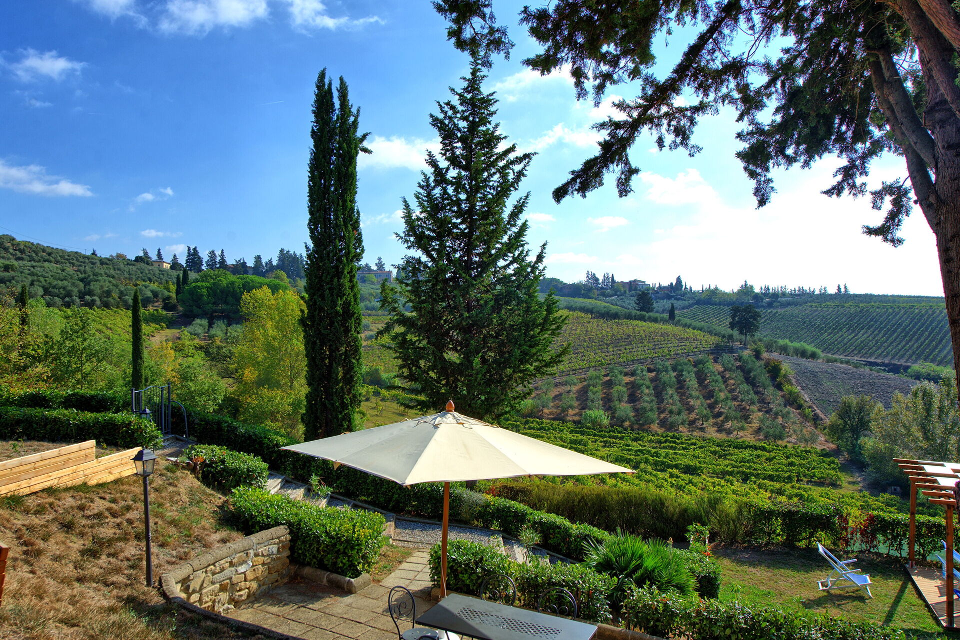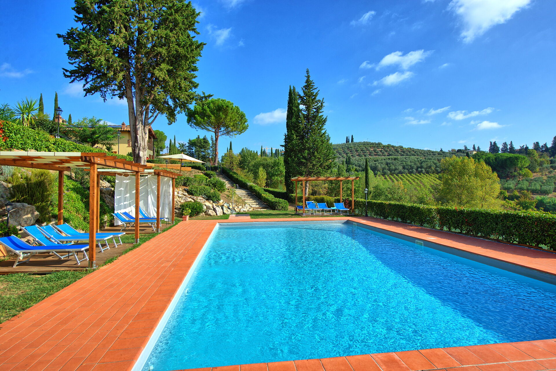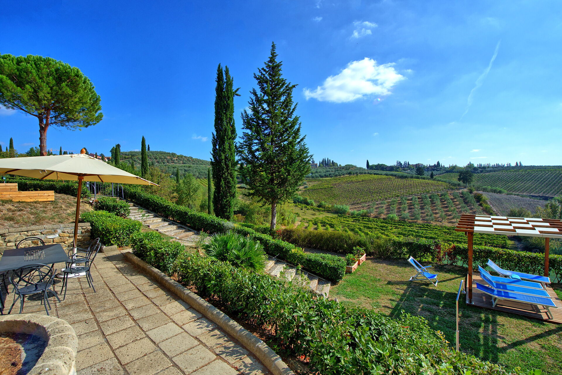 Udlejningsejendommen er beliggende i panoramiske omgivelser på bakkerne i Chianti Fiorentino regionen.