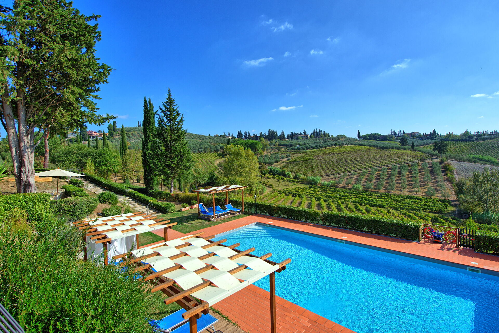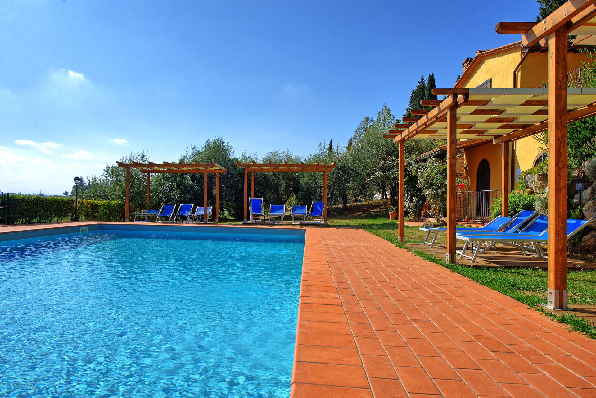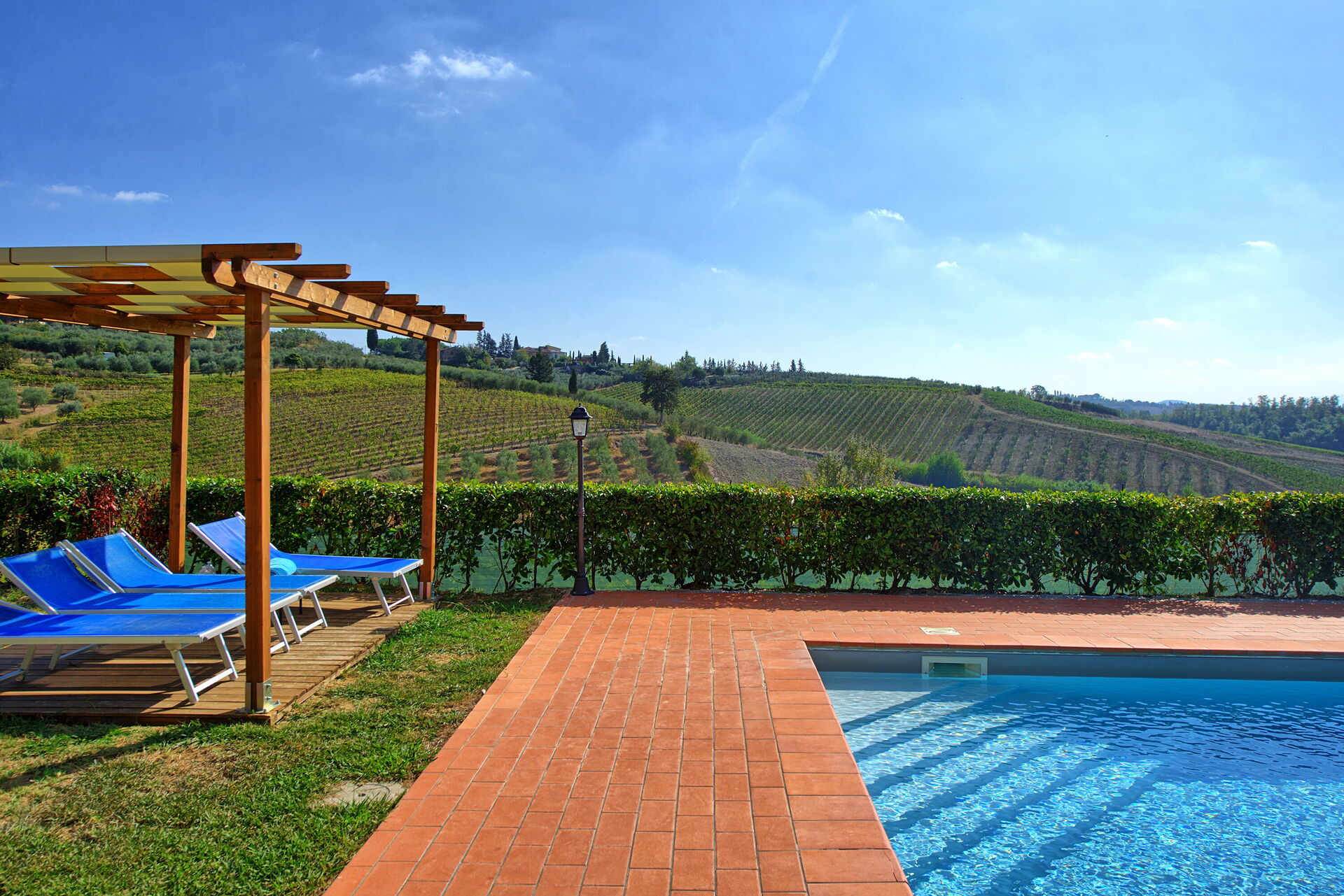 Udlejningsejendommen er beliggende i panoramiske omgivelser på bakkerne i Chianti Fiorentino regionen.