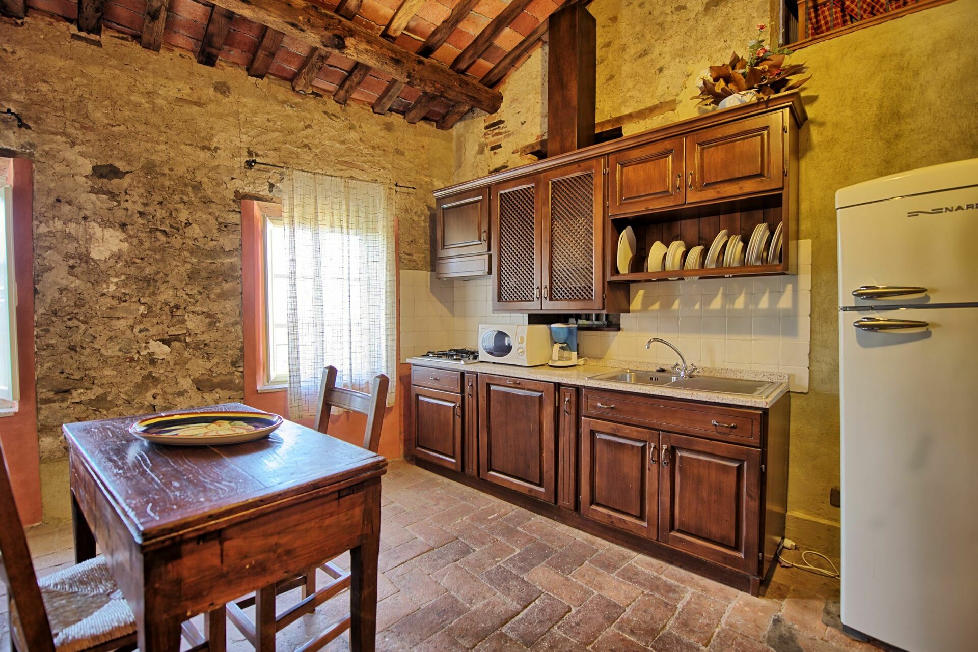 Anden sal: Spiseplads med tekøkken (opvaskemaskine, mikroovn, fryser, kaffemaskine) og pejs, badeværelse med bruser.