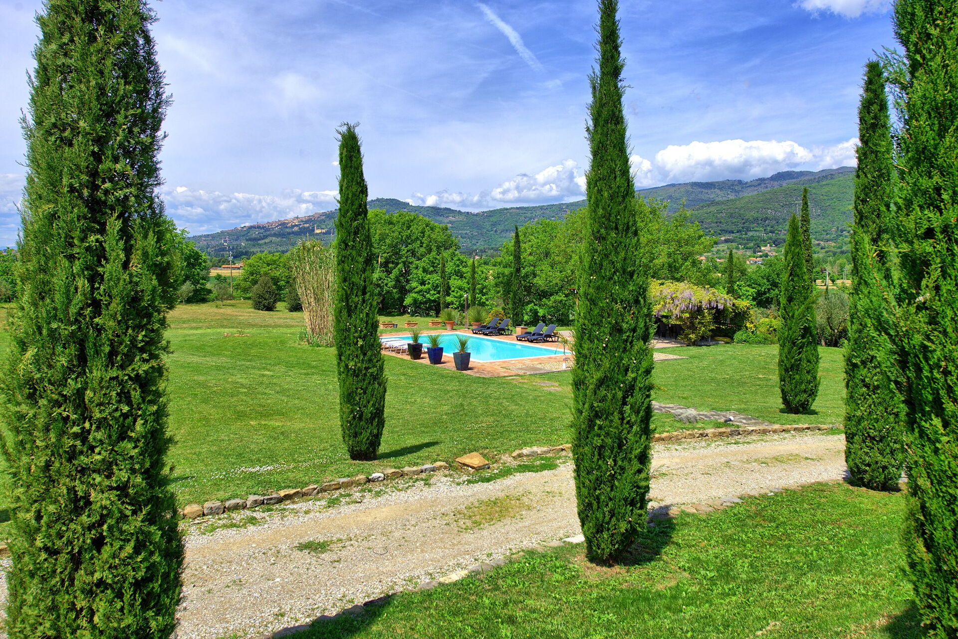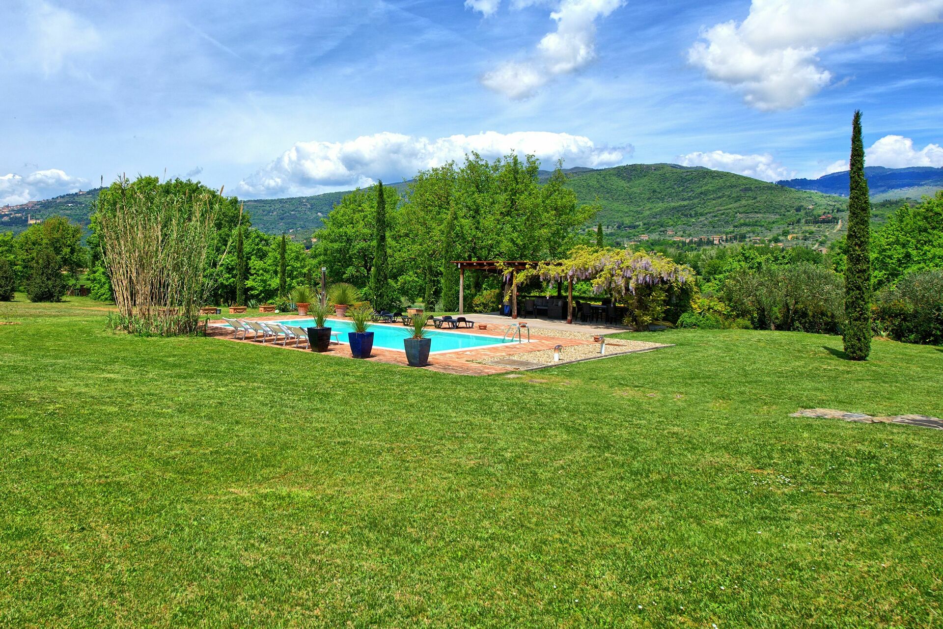 Luksus sommerhus til leje i nærheden af den smukke by Cortona i Toscana. Luksusvillaen har en privat swimmingpool og dejlig panoramaudsigt til de omkringliggende bakker og Cortona.