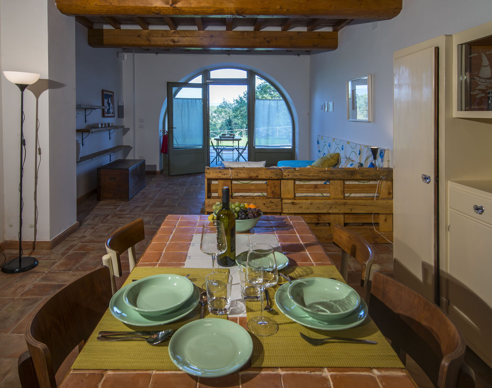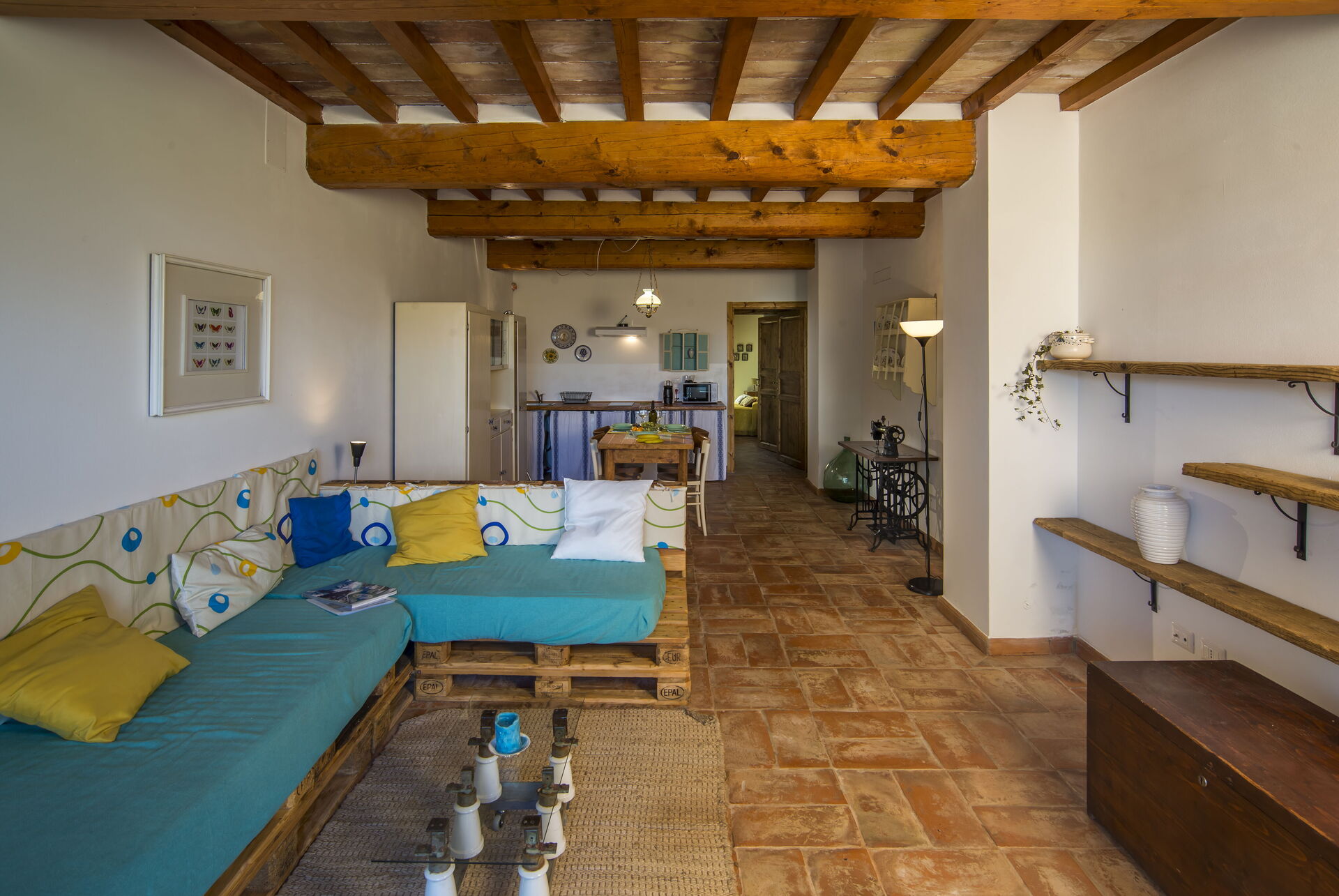 Stue (med 2 ekstra sovesofaer, på forespørgsel) og spiseplads med køkken (opvaskemaskine, ovn, køleskab, induktionskogeplade, mikroovn, kaffemaskine, ventilator), 1 dobbeltværelse, badeværelse med bruser.
