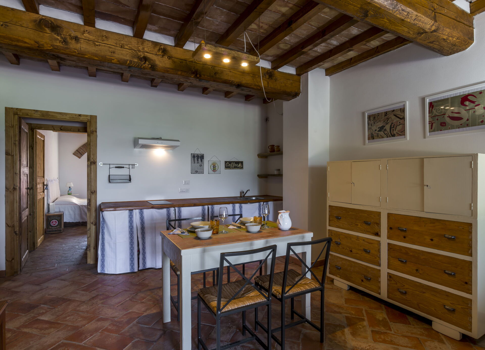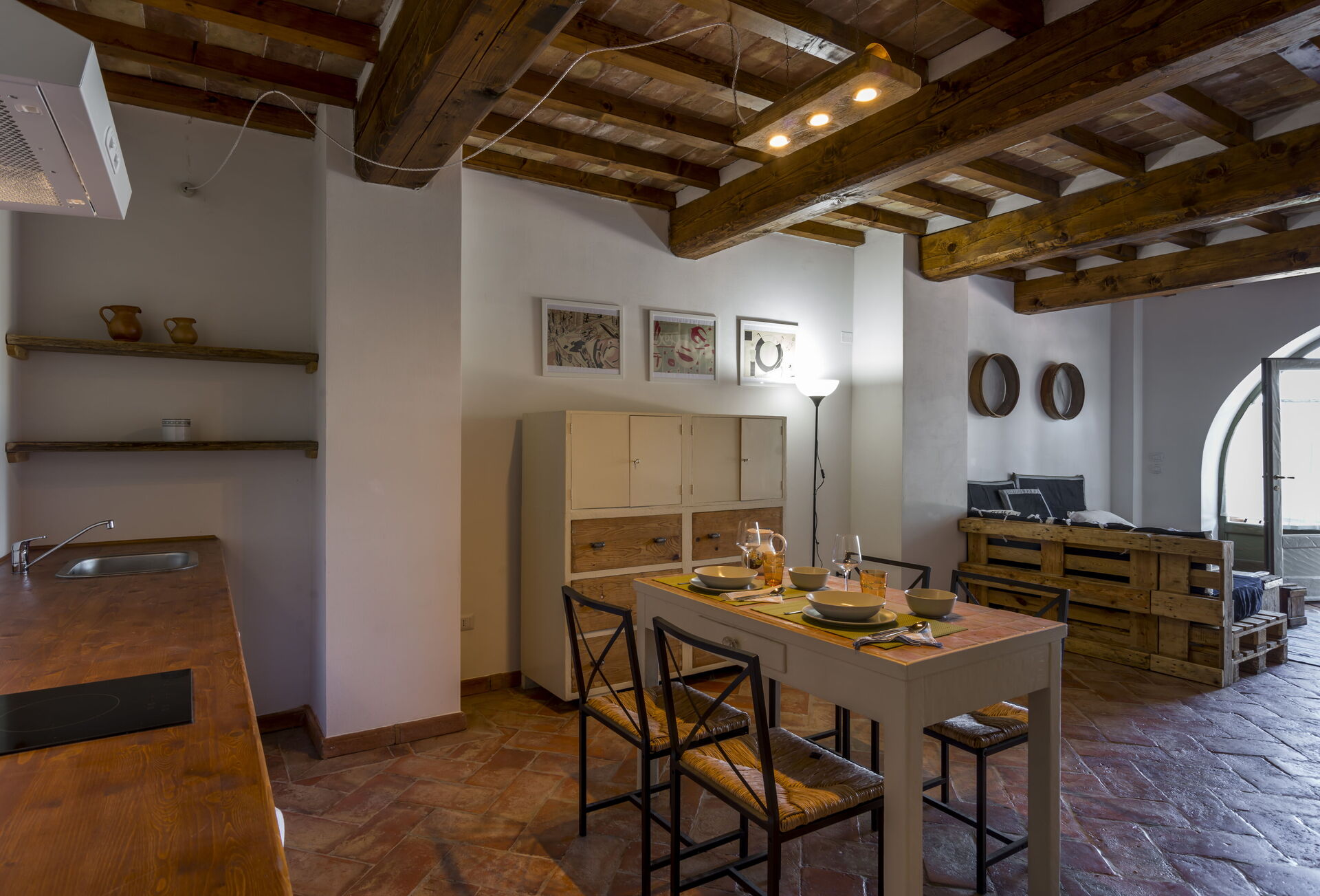 Opholdsstue (med 2 ekstra sovesofaer, på forespørgsel) og spiseplads med køkken (opvaskemaskine, ovn, køleskab, induktionskogeplade, mikroovn, kaffemaskine, ventilator), 1 dobbeltværelse, badeværelse med bruser.