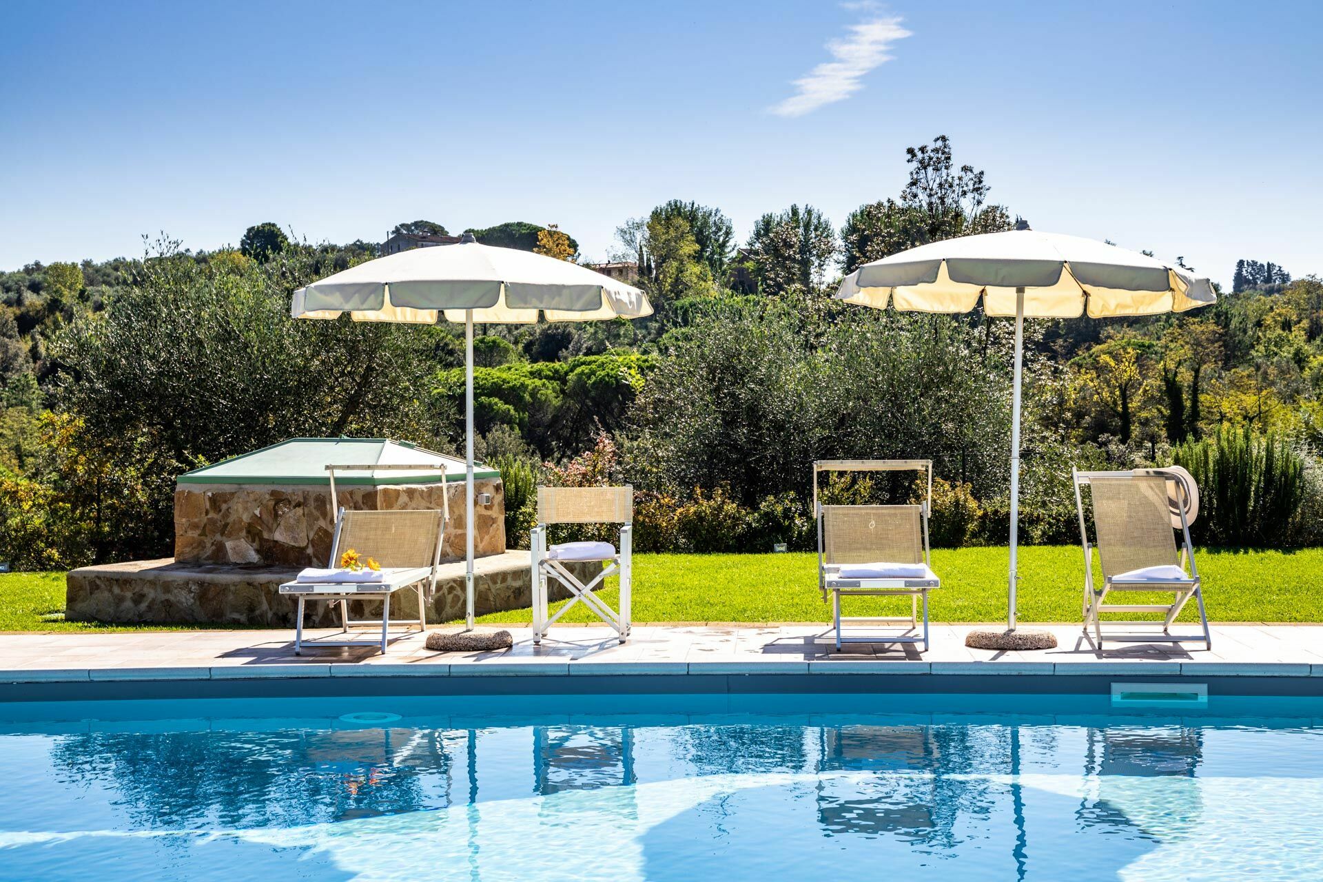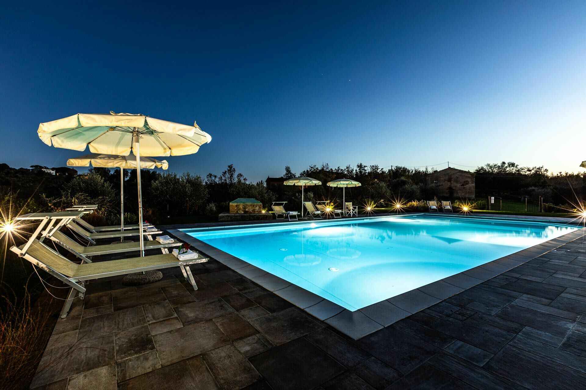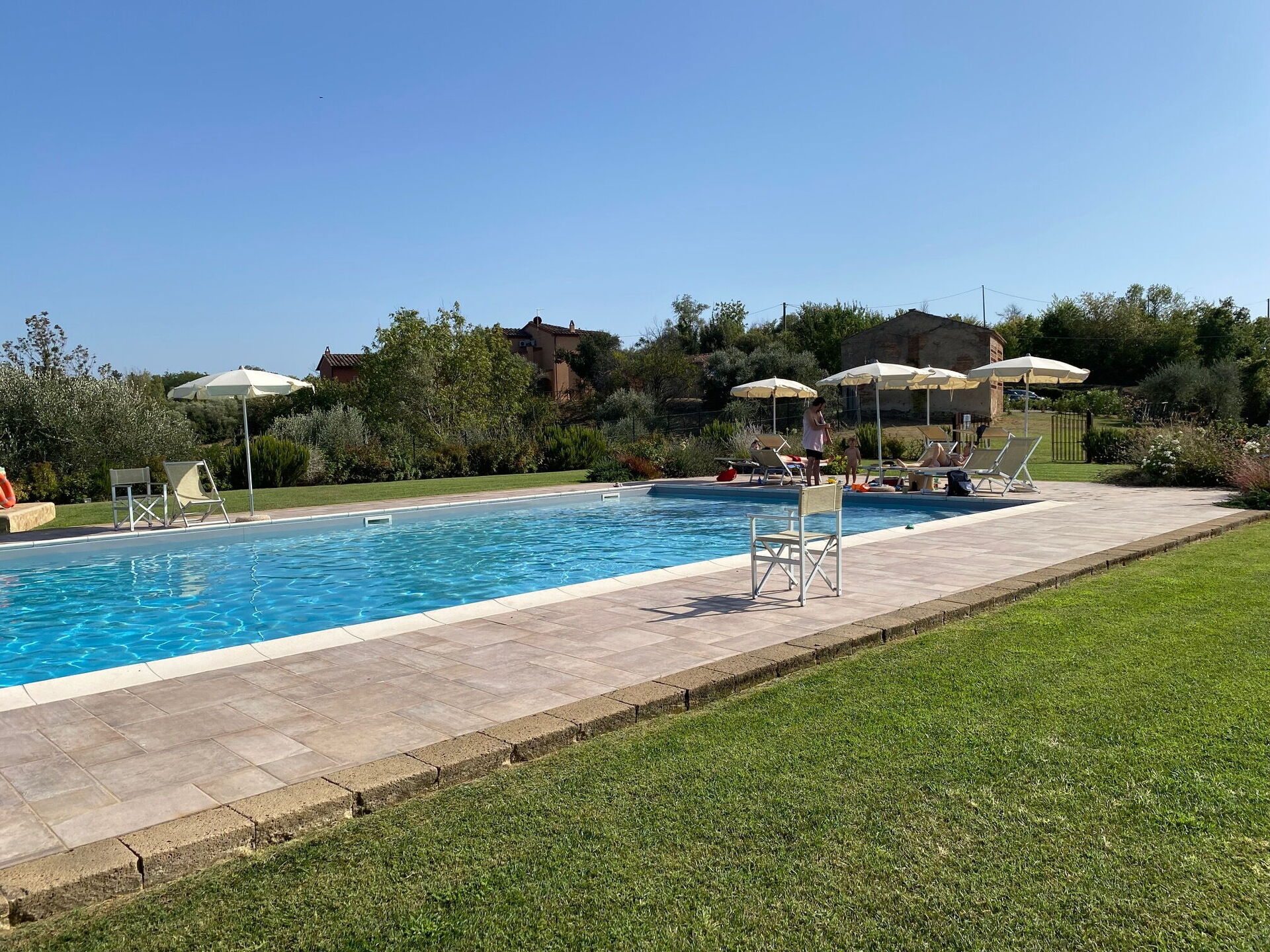 Poolen ligger cirka 100 meter fra huset, med smuk udsigt over bakkerne og byen Montefoscoli.