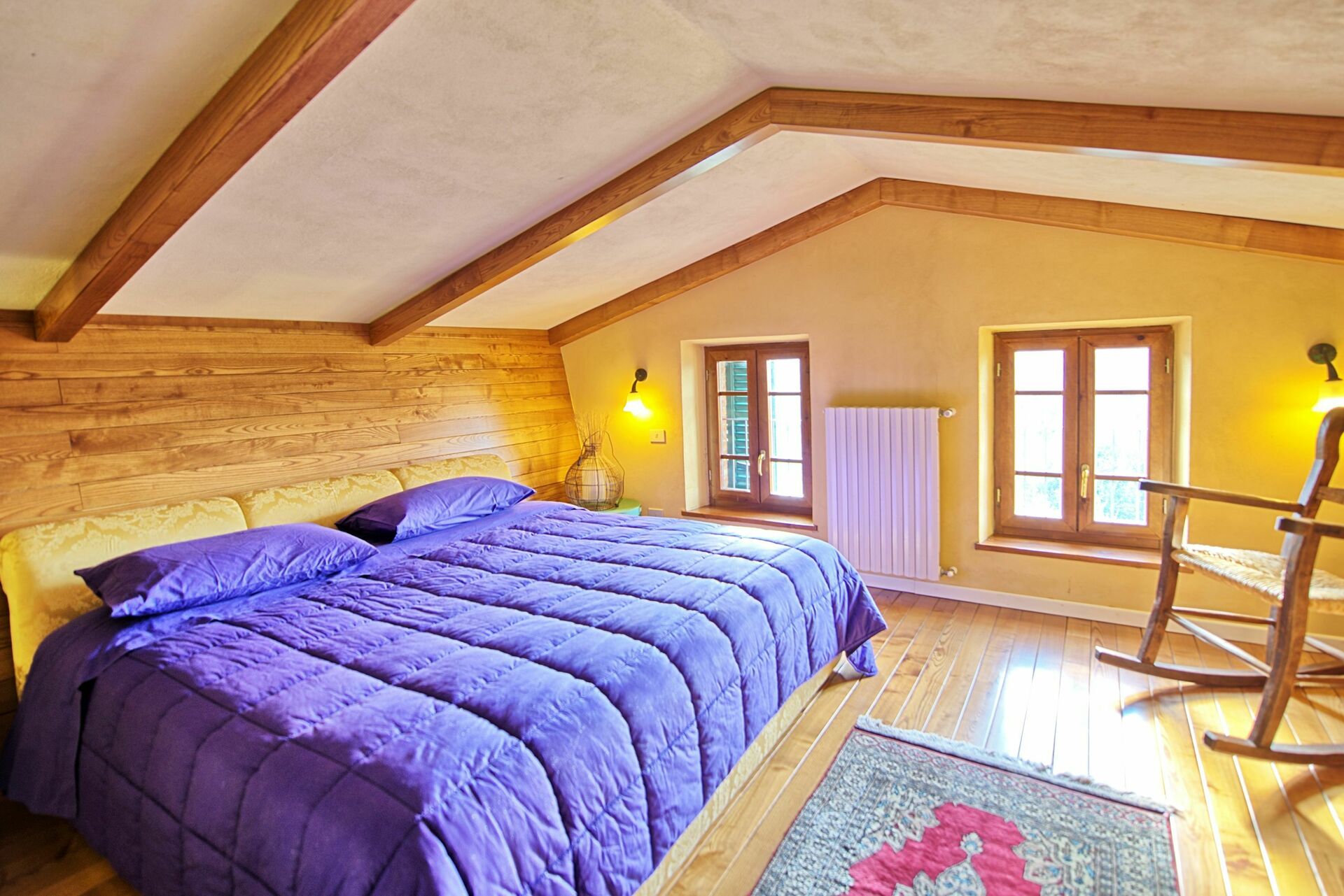 Første sal (hems delvis åben over stuen nedenfor): soveværelse med dobbeltseng
