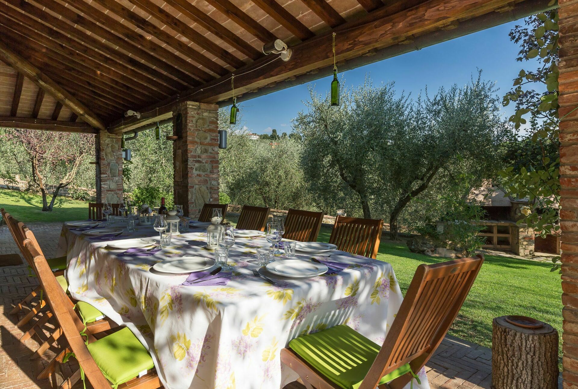 Udenfor er der et smukt møbleret overdækket område, perfekt til udendørs spisning. Her er der også en grill og en brændeovn.
