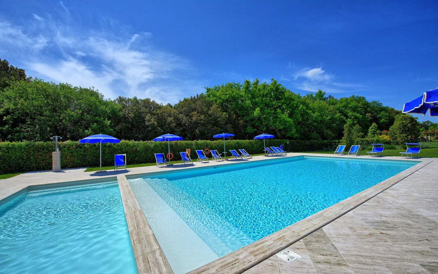 En stor swimmingpool med liggestole er til rådighed for gæsterne.