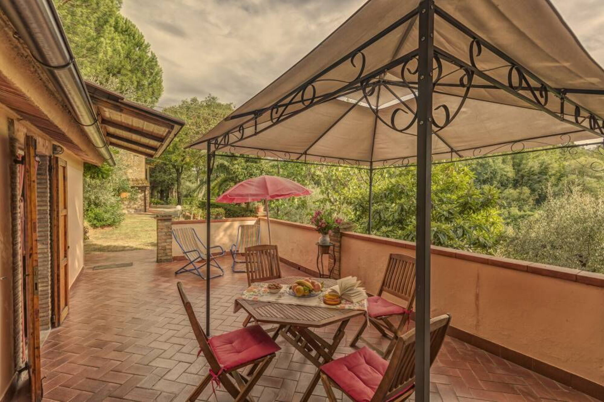 Panoramisk solterrasse på 25 m2 med havepavillon, bord og stole