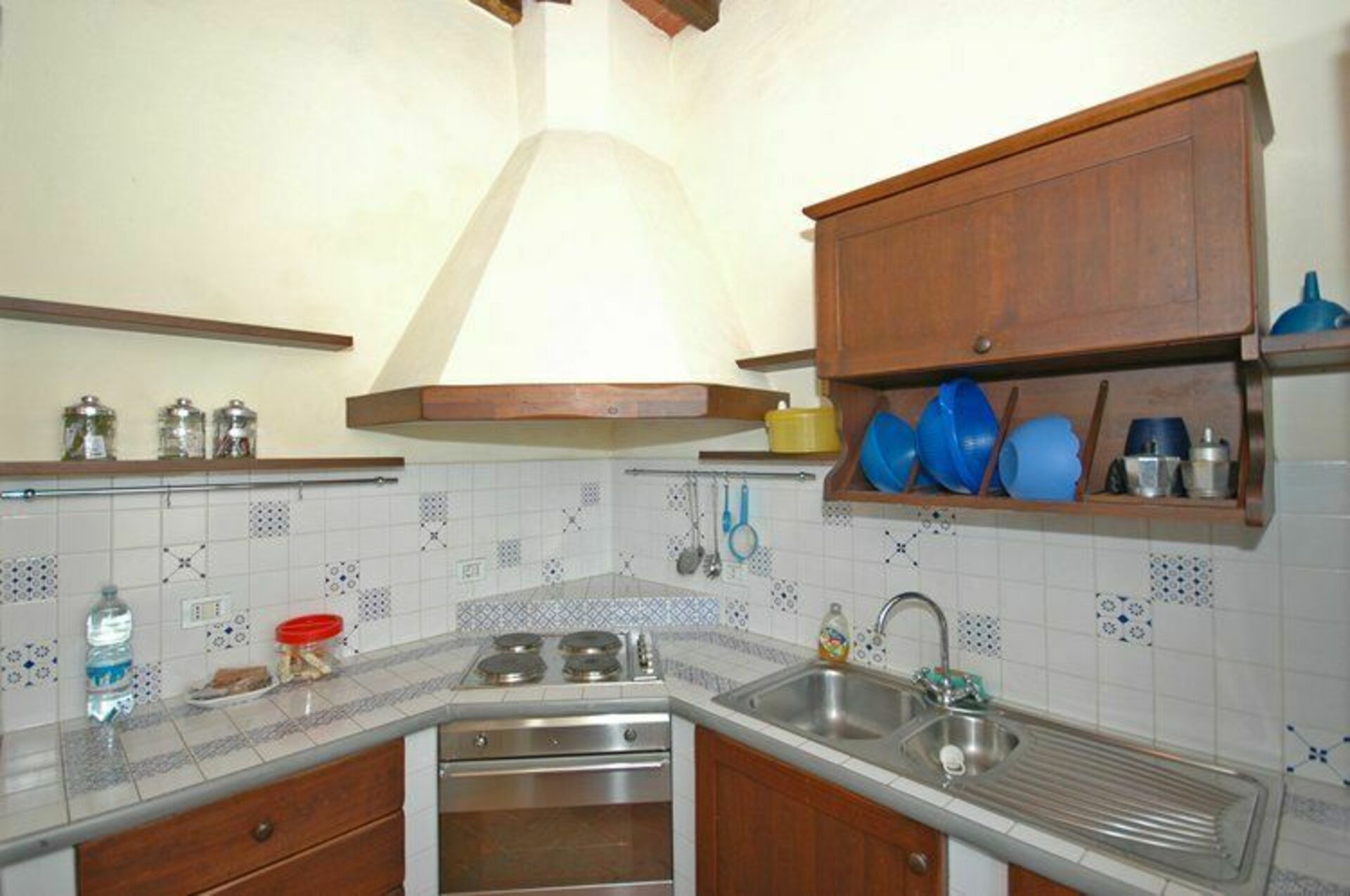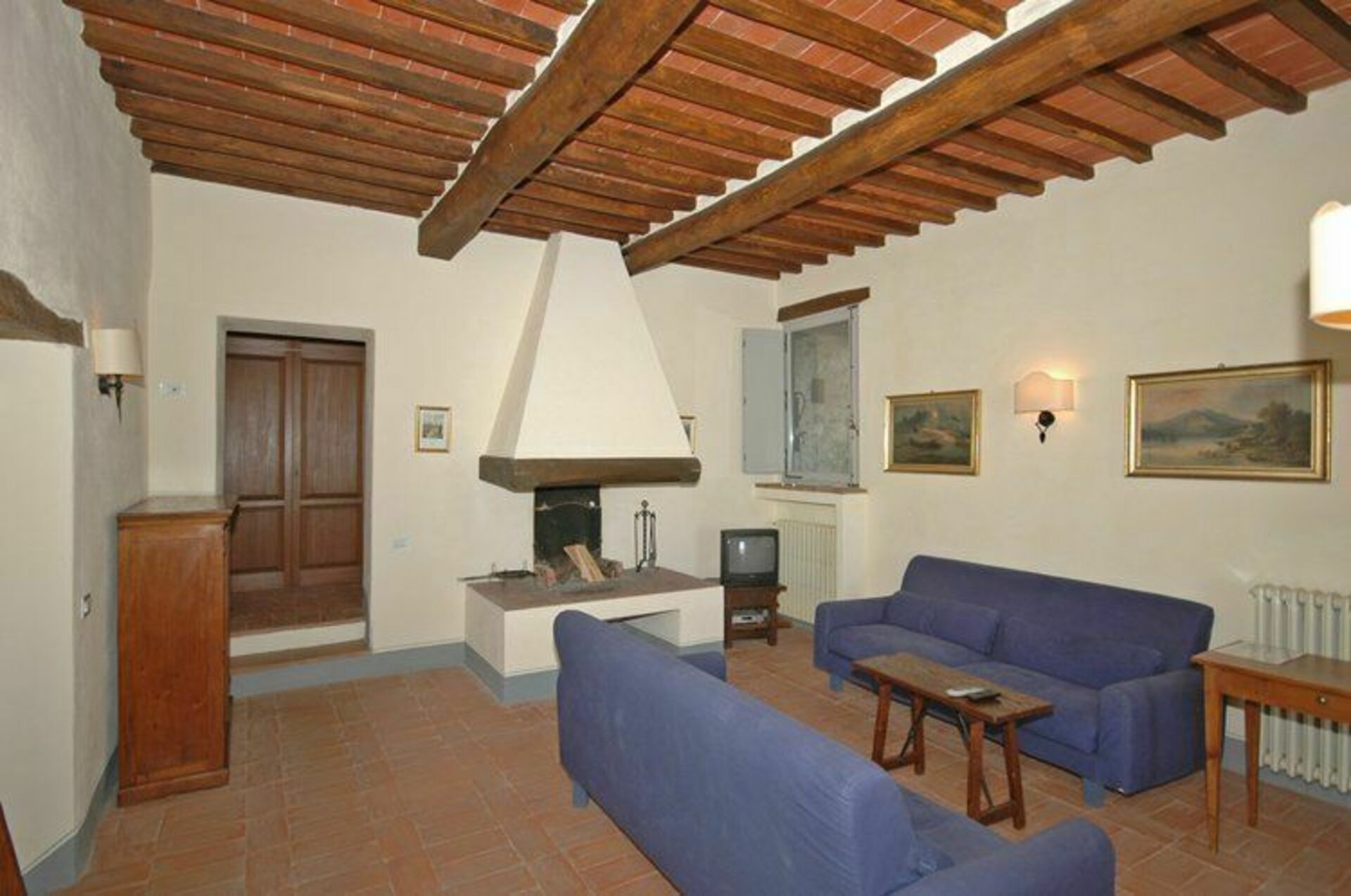 Stueetage: stue (satellit-tv) med stor pejs, spiseplads og køkkenhjørne (ovn, fryser, opvaskemaskine) åben ud til opholdsstuen og med adgang til haven, badeværelse med badekar ( hårtørrer).