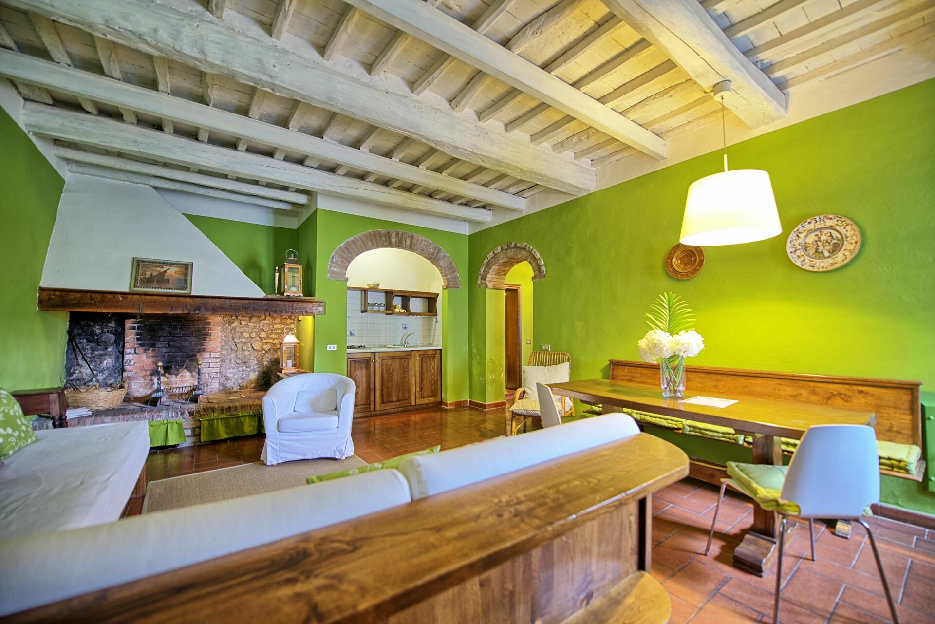 Stor stue med spiseplads, charmerende pejs, køkkenhjørne og 2 sovesofaer, 1 dobbeltværelse, badeværelse med bruser