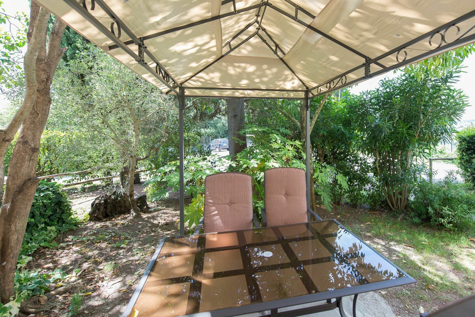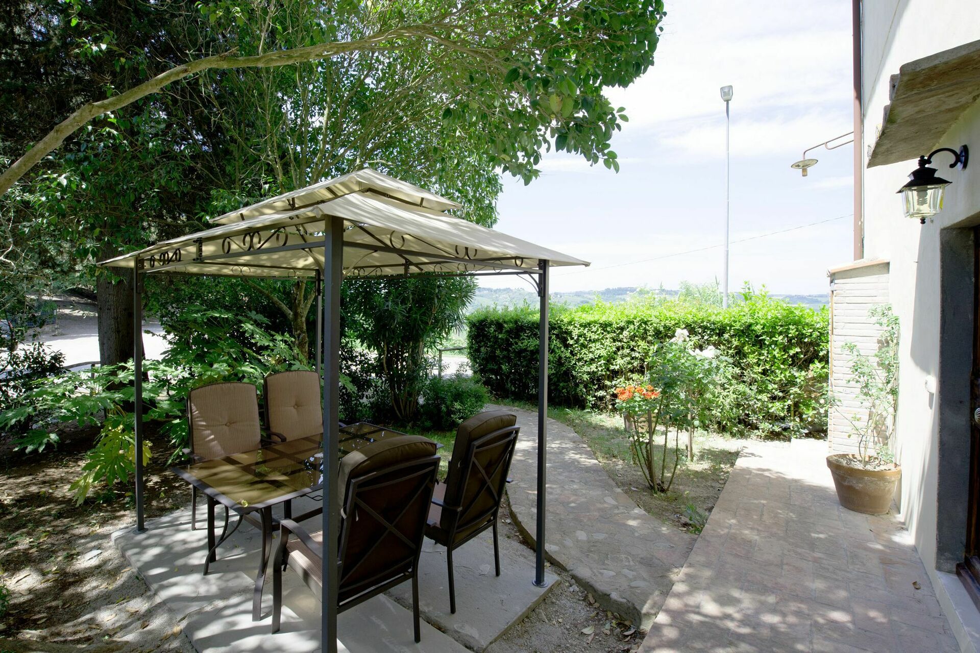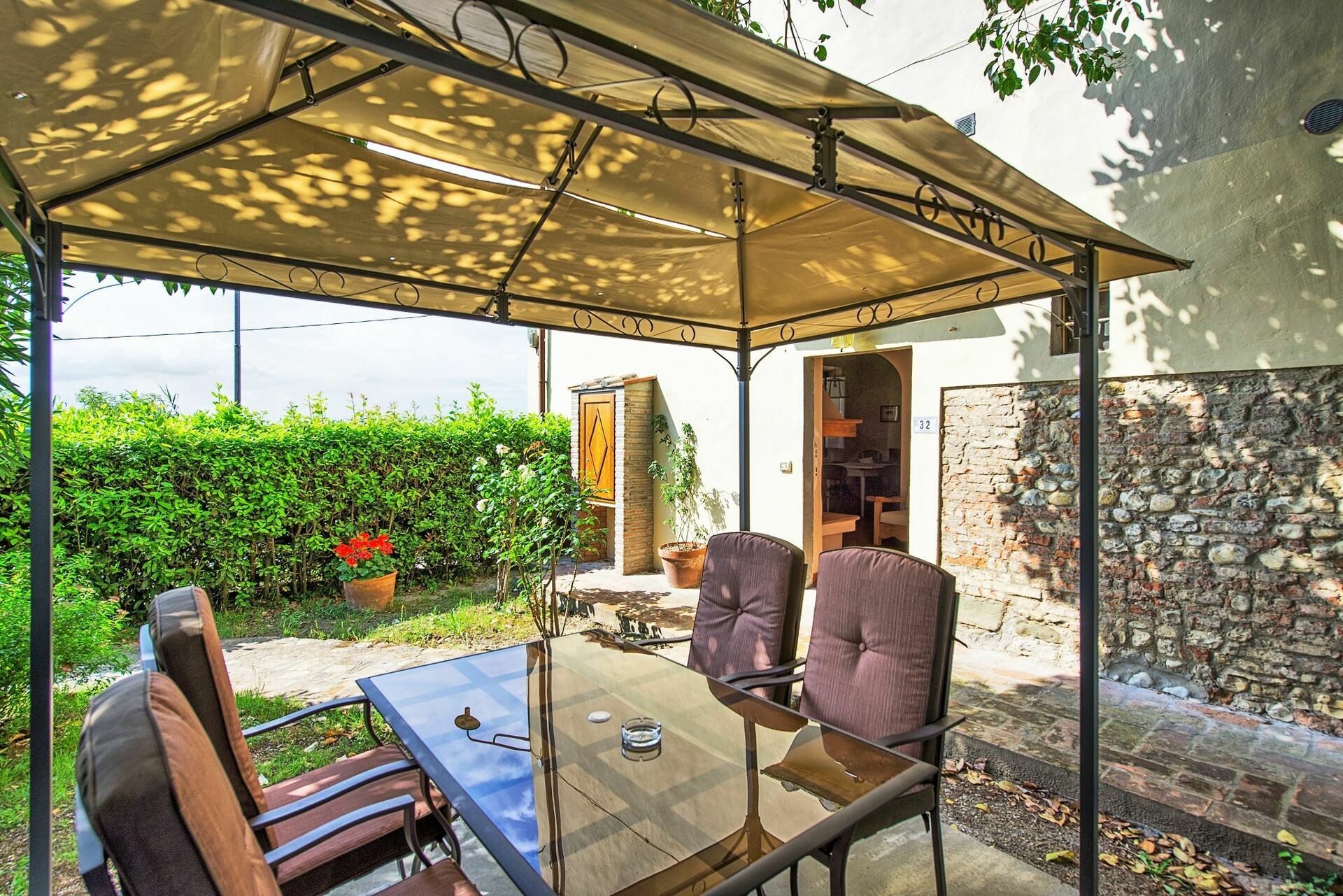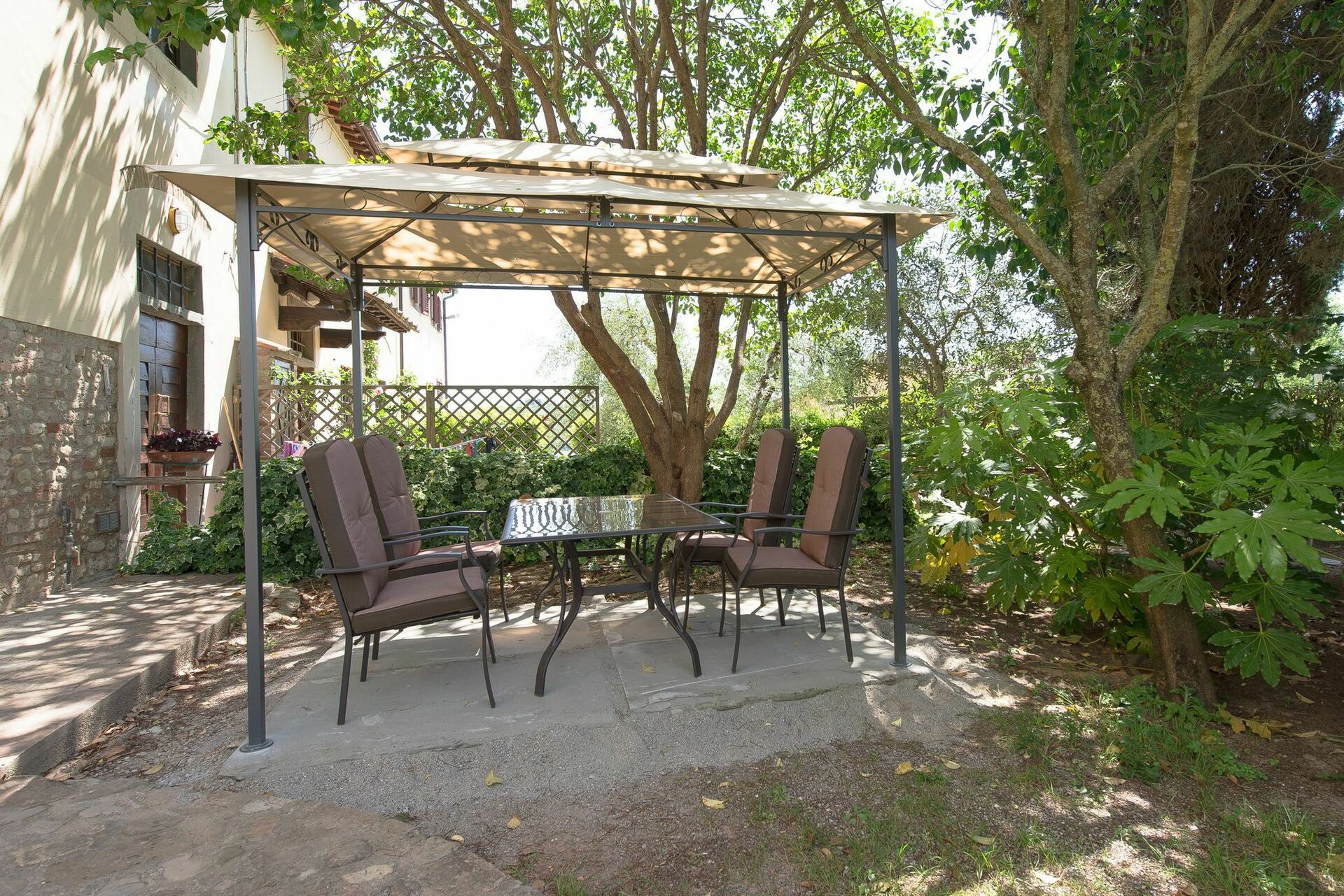 Personligt, møbleret udendørs område med havepavillon, bord og stole