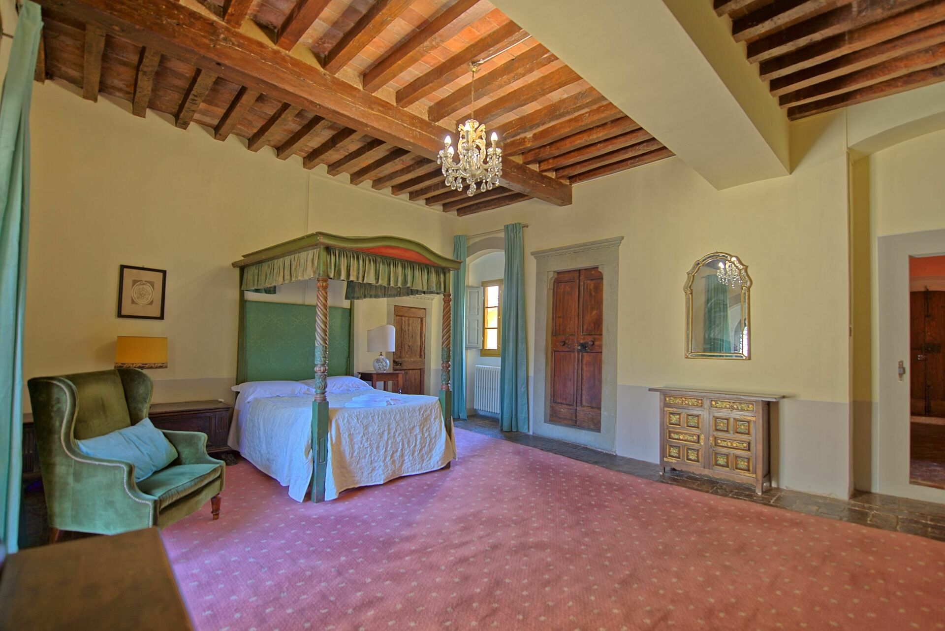 Stor og lys stue med køkkenhjørne og spisestue, læsesal, 2 dobbeltværelser (baldaquin seng), 1 dobbeltværelse (fransk seng), badeværelse med bruser, badeværelse med badekar