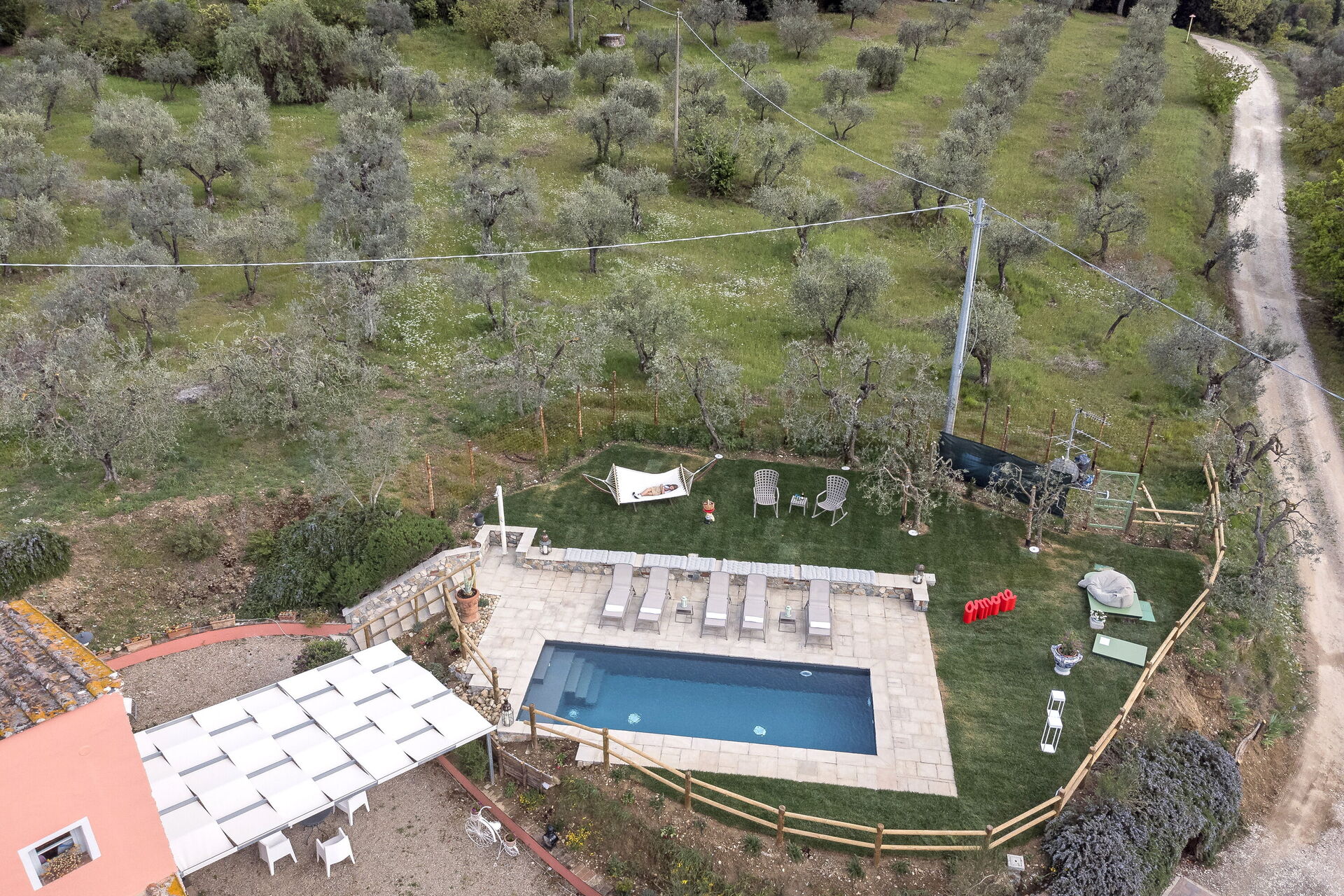 Feriehuset har en fantastisk swimmingpool med hydromassagehjørne! Tilbring dagene udendørs i den store have, eller spis med stil på den lyse veranda, mens du nyder den fantastiske udsigt over det fredfyldte toscanske landskab.