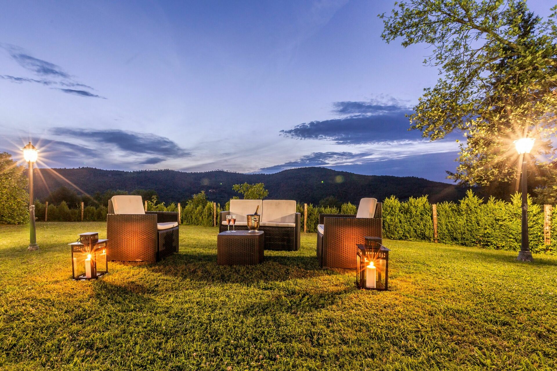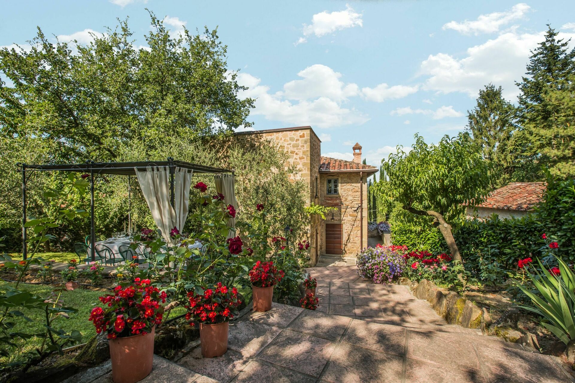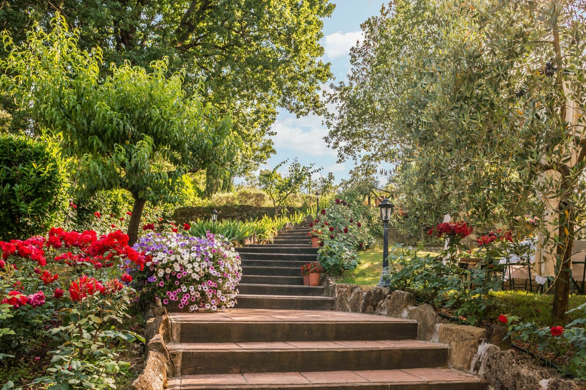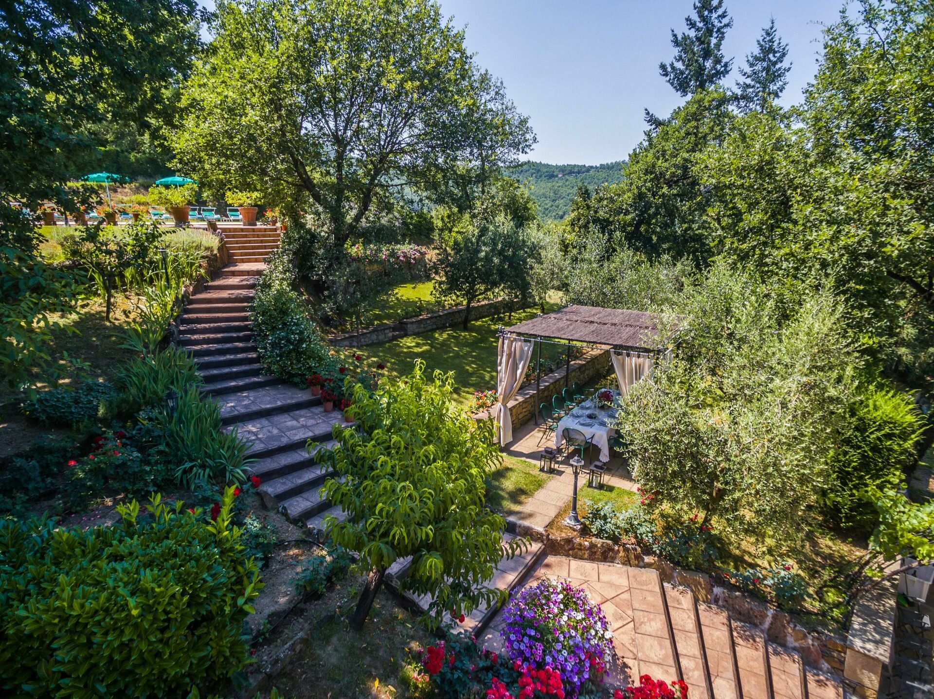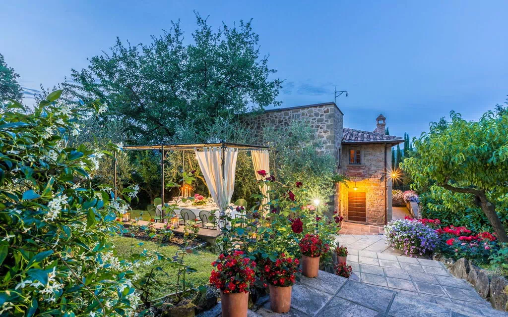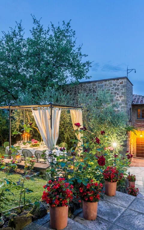 I haven på et niveau over huset finder du en ny swimmingpool (12 x 6 m dybde 1,5 m, åben fra 1. maj til 1. oktober) og smukke planter som roser, lavendel, jasmin, cypress og oliventræer. I poolområdet finder du også et stort lysthus, bord, stole og grill. Her kan du nyde udendørs måltider med middelalderbyen Monterchi og de frodige, grønne toscanske bakker som baggrund.