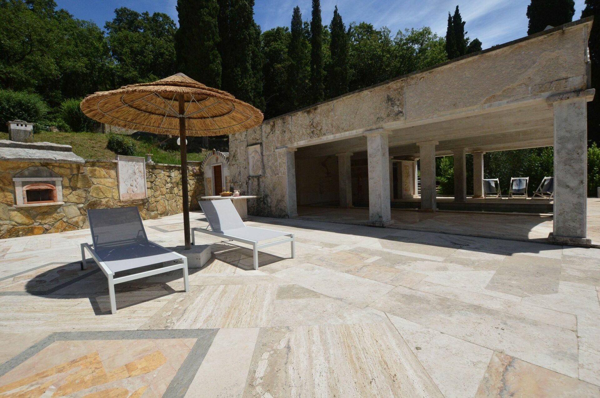 • stor solterrasse i travertin med solsenge, parasoller og bruser (varmt vand)