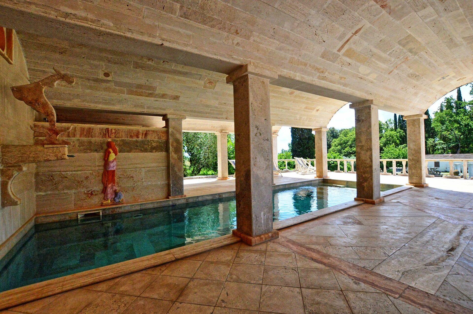 • opvarmet pool (vandet er 36° ved ankomst) med travertinhvælvet tag (9 x 3 meter – dybde 1,4 meter – åben året rundt)