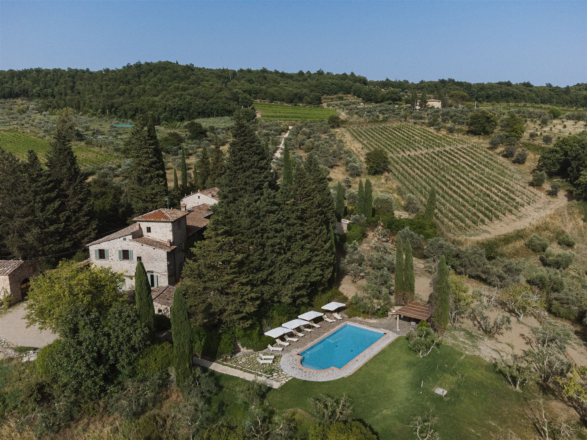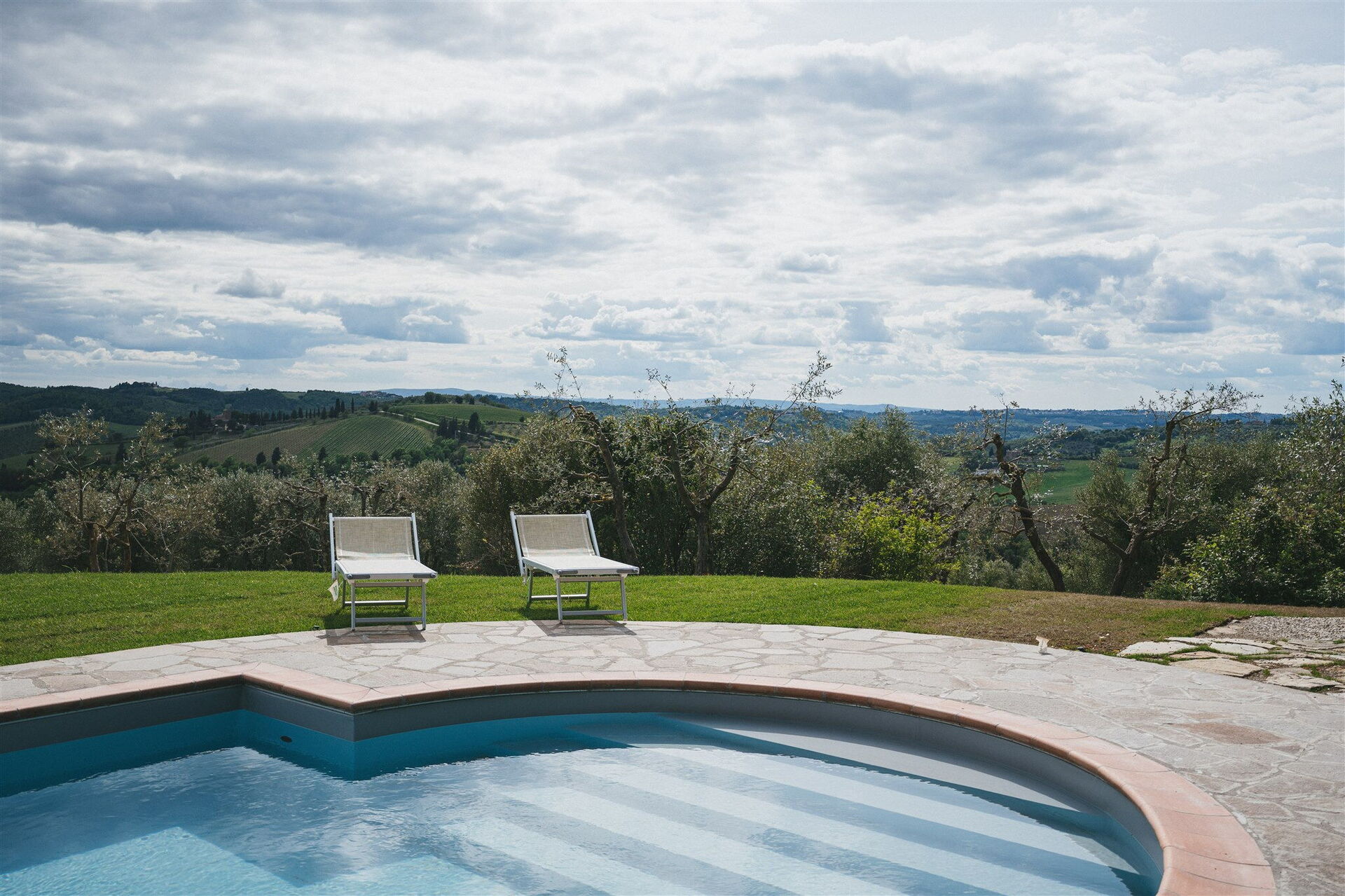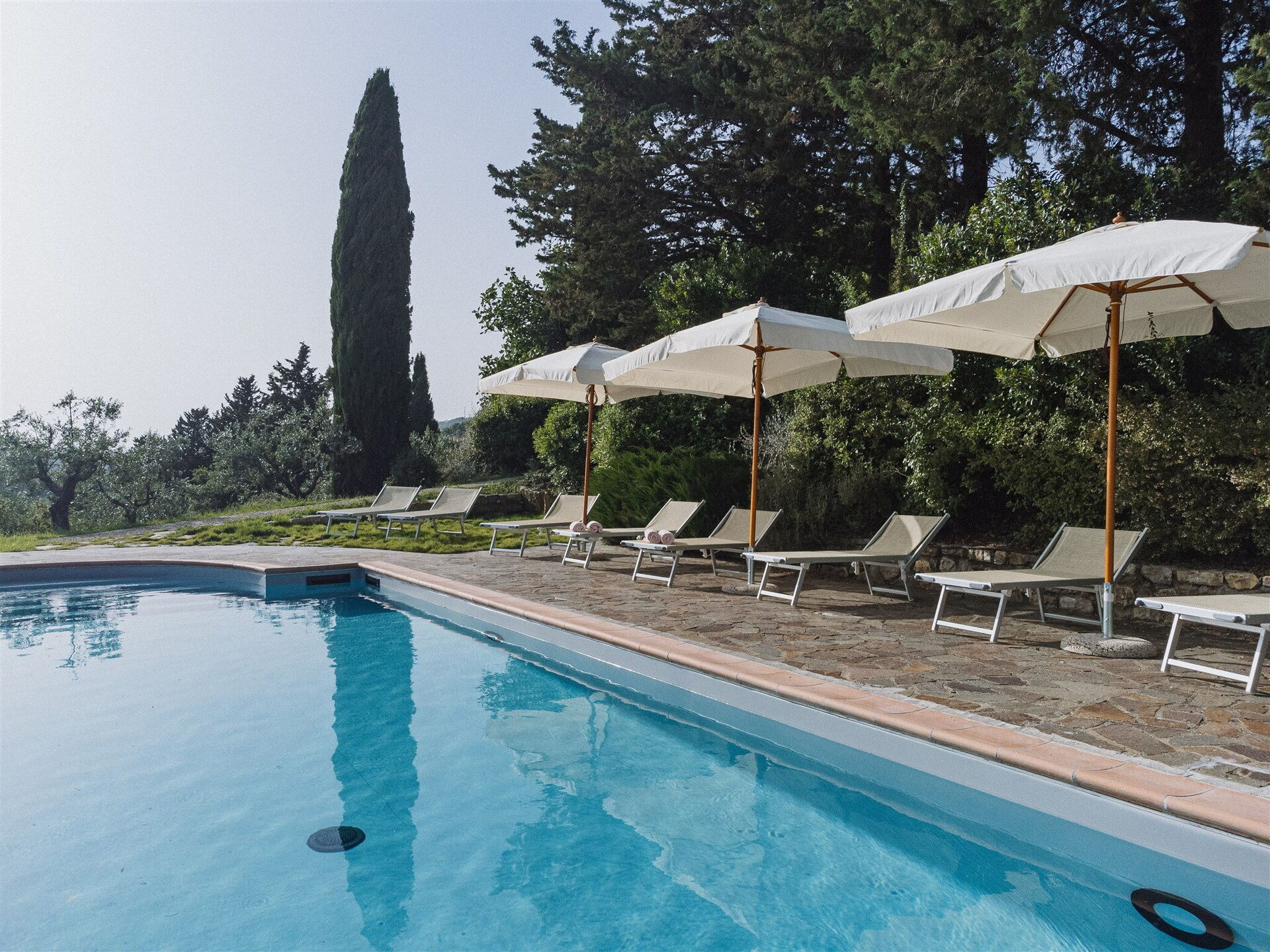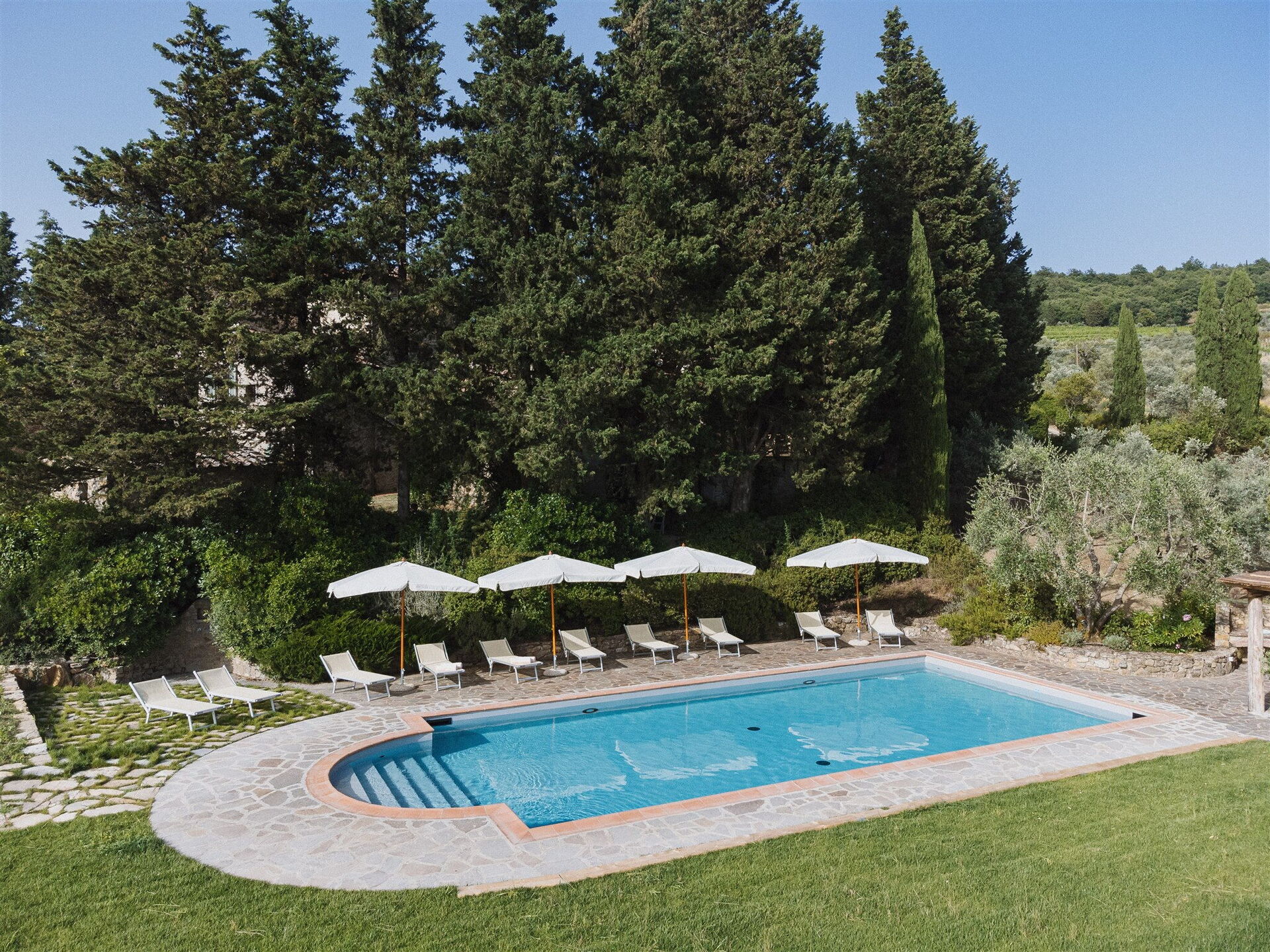 På det store udendørsareal er der en dejlig pool med pragtfuld panoramaudsigt, som deles mellem alle gæster på ejendommen; poolen vender ud mod de storslåede vinmarker i Chianti Classico, verdenskendt for sit smukke landskab og sine fremragende vine fra de mange kendte vingårde her.