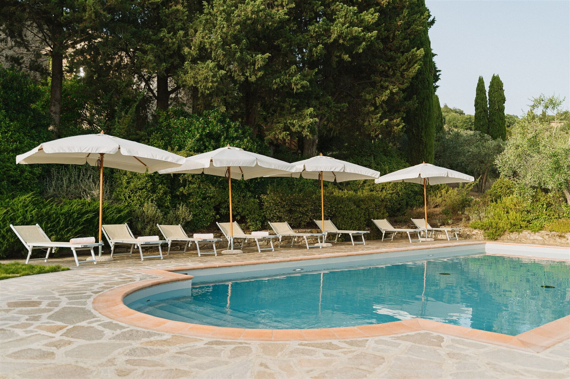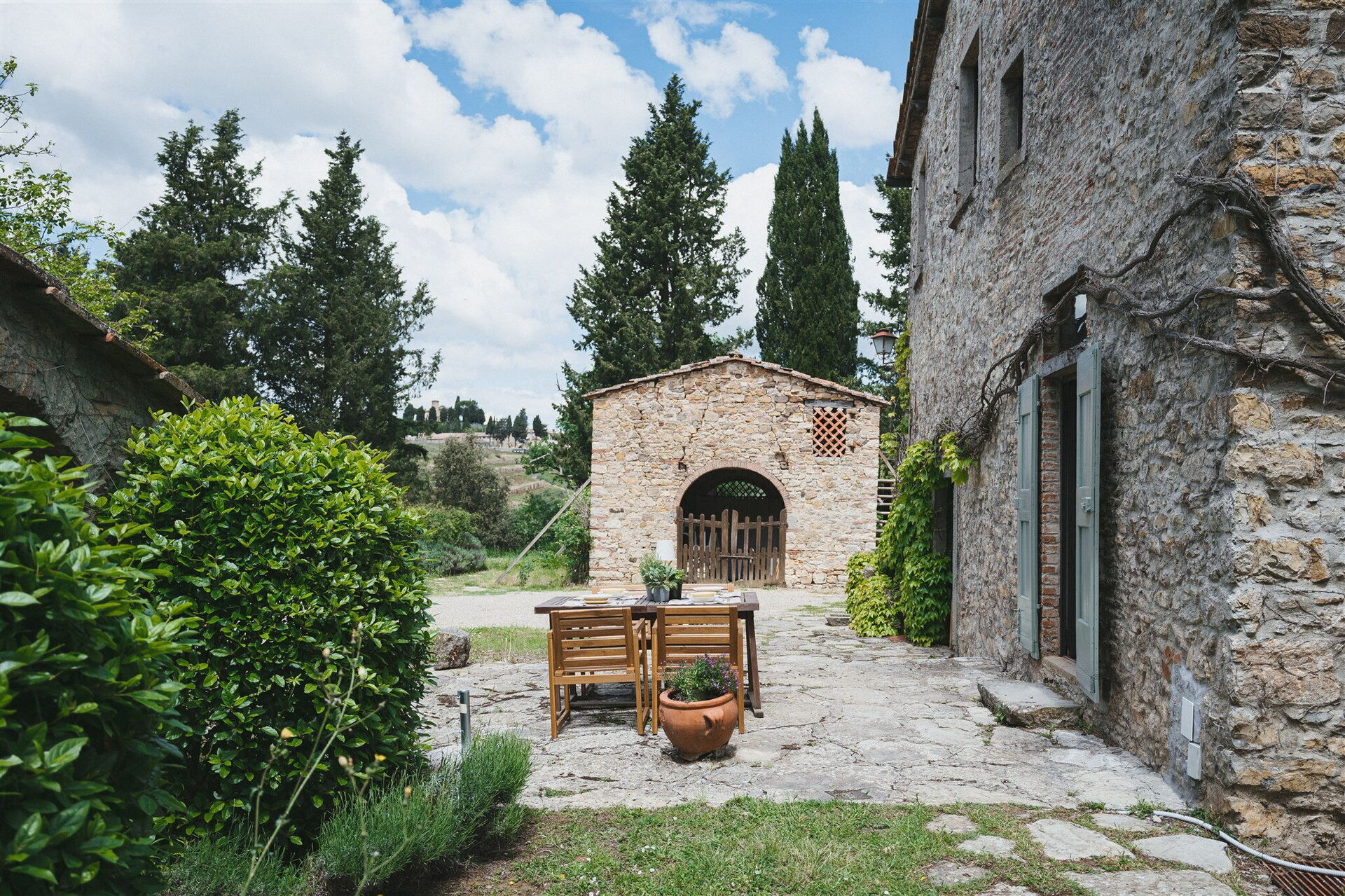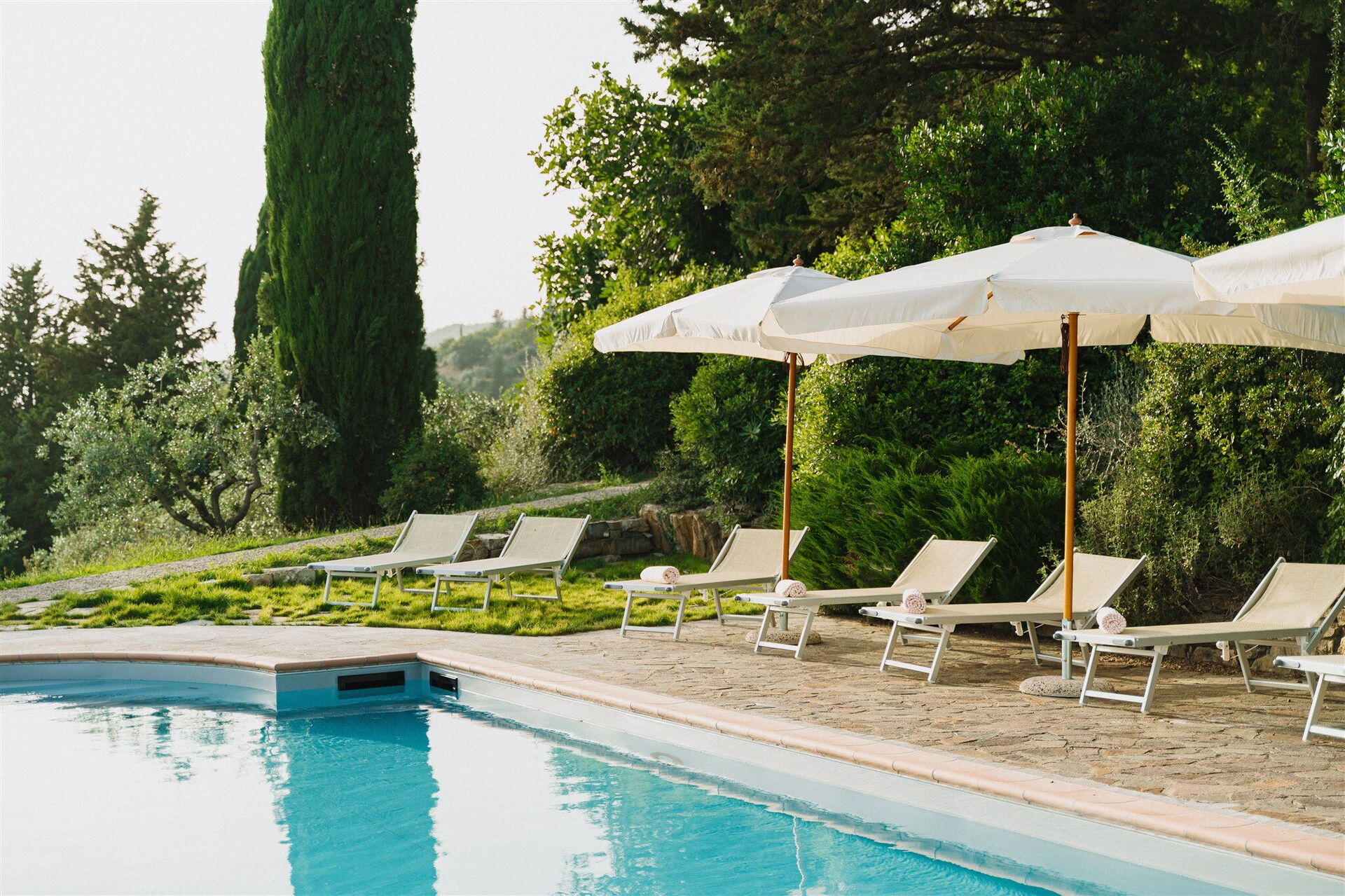 På det store udendørsareal er der en dejlig pool med pragtfuld panoramaudsigt, som deles mellem alle gæster på ejendommen; poolen vender ud mod de storslåede vinmarker i Chianti Classico, verdenskendt for sit smukke landskab og sine fremragende vine fra de mange kendte vingårde her.