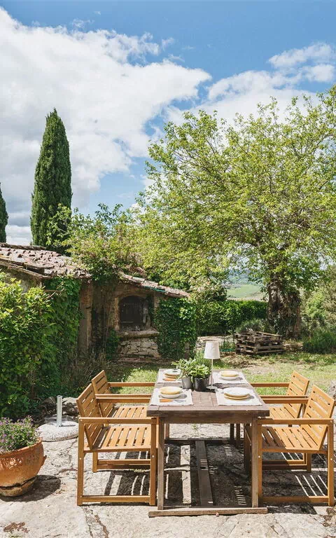 Privat udendørsområde møbleret med bord, stole og grill.