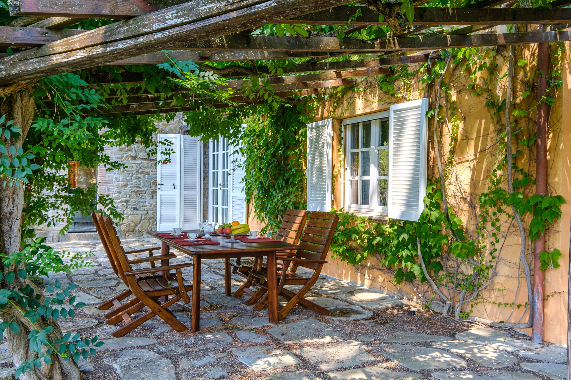- Veranda med træpergola udstyret til udendørs spisning