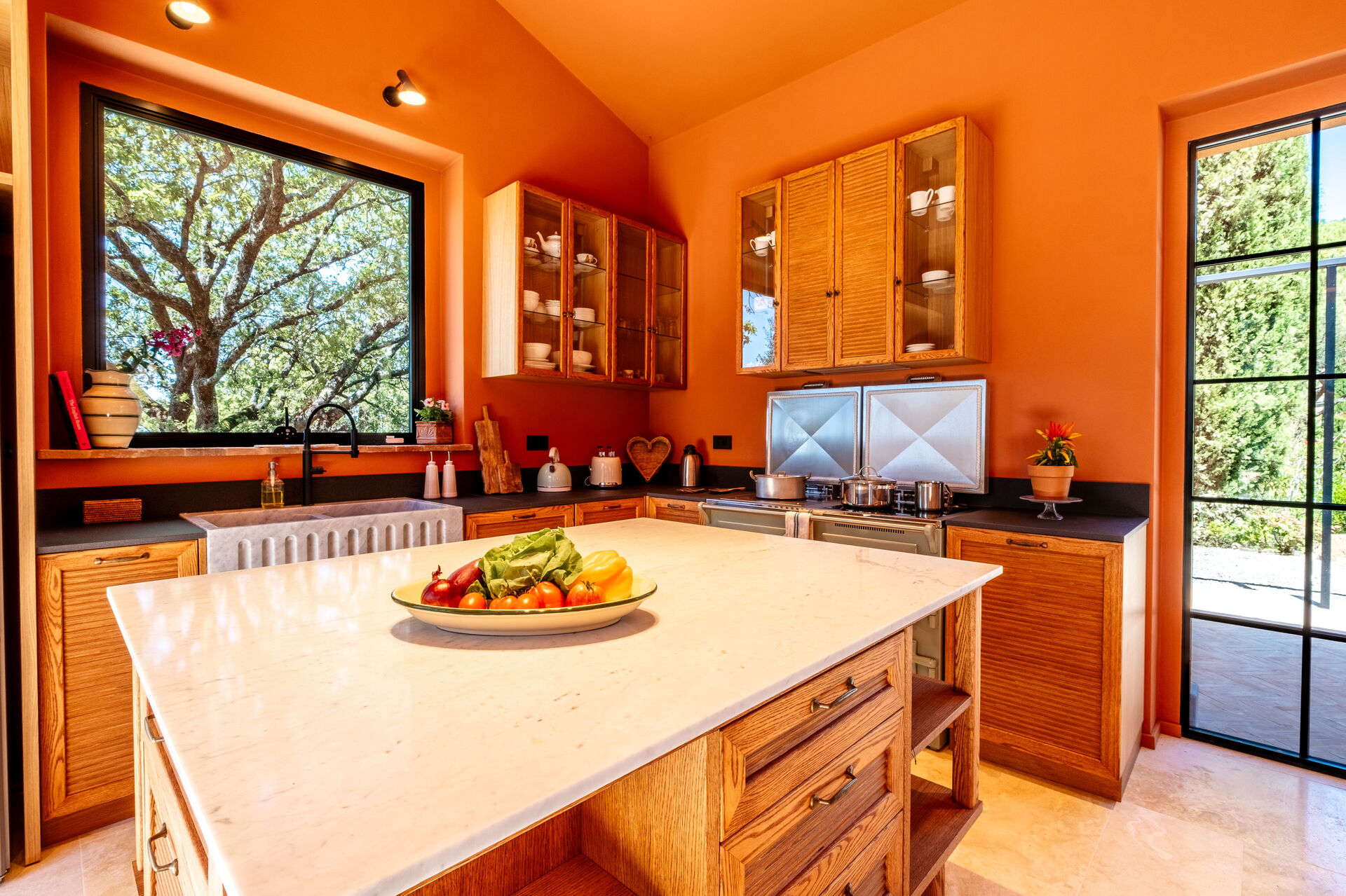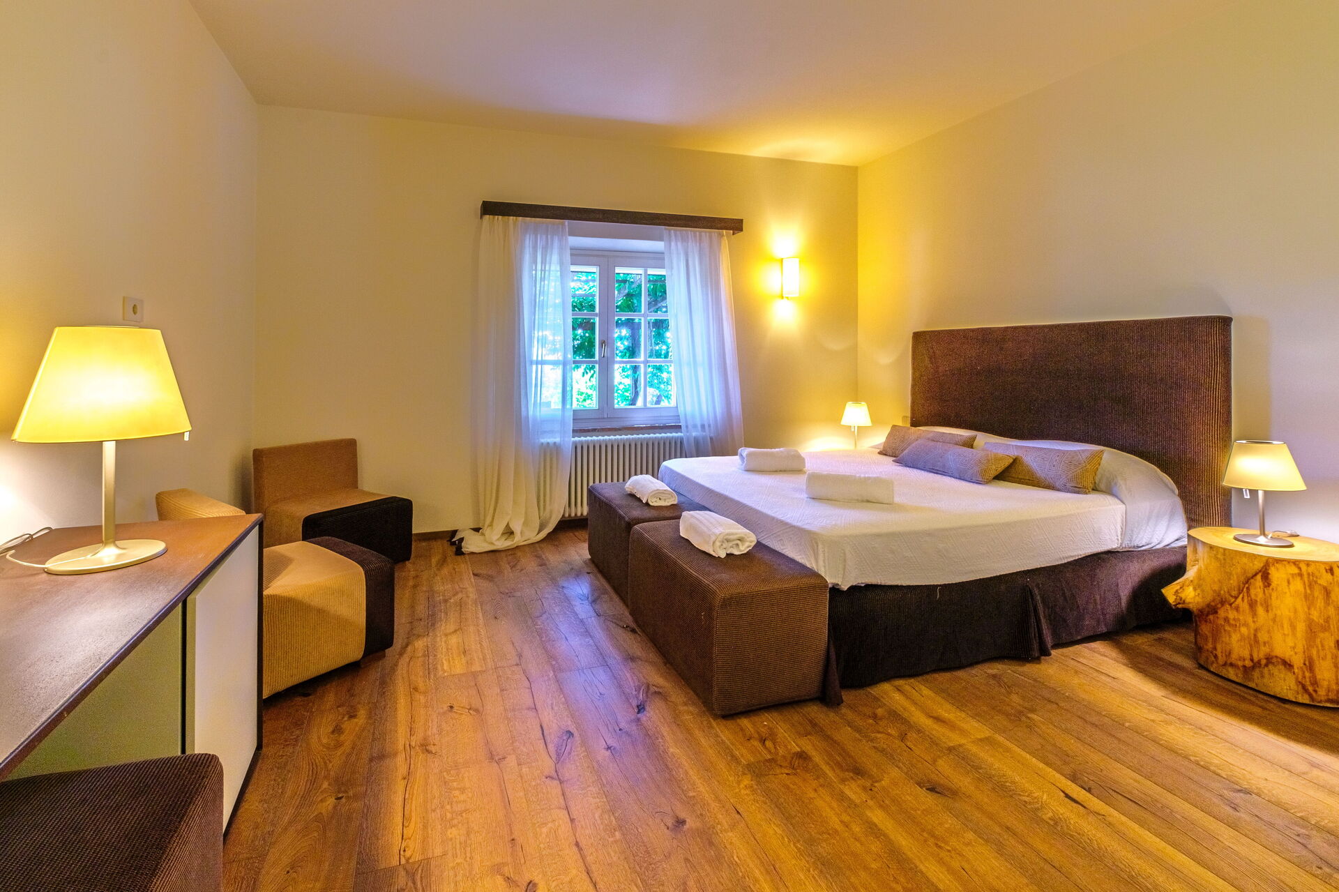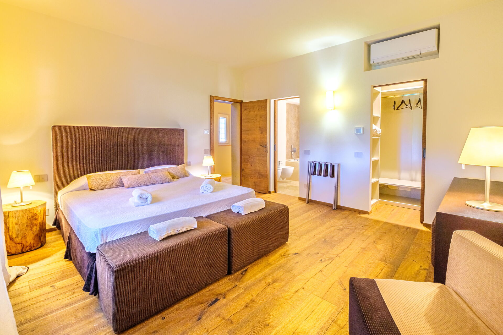 Stueetage: stor stue med pejs (smart TV), lys spisestue og køkken (induktionskogeplader, ovn, køleskab, fryser, opvaskemaskine, vinkøleskab, brødrister, espressomaskine, amerikansk kaffemaskine), vaskerum (vaskemaskine, tørretumbler og strygejern), dobbeltværelse (kan efter anmodning laves om til 2 enkeltsenge: sengemål: 90x195 cm, aircondition) med privat badeværelse med bruser; dobbeltværelse (king size seng: sengemål: 180x200 cm, aircondition) med privat badeværelse med bruser, adgang til haven; dobbeltværelse (king size seng: sengemål: 180x200 cm, aircondition) med privat badeværelse med bruser, dobbeltværelse (king size seng: sengemål: 180x200 cm, aircondition) med walk-in closet, privat badeværelse med bruser og badekar, dobbeltværelse (king size seng: sengemål: 180x200 cm, aircondition) med privat badeværelse med bruser (uden bidet, uden vindue), adgang til haven.