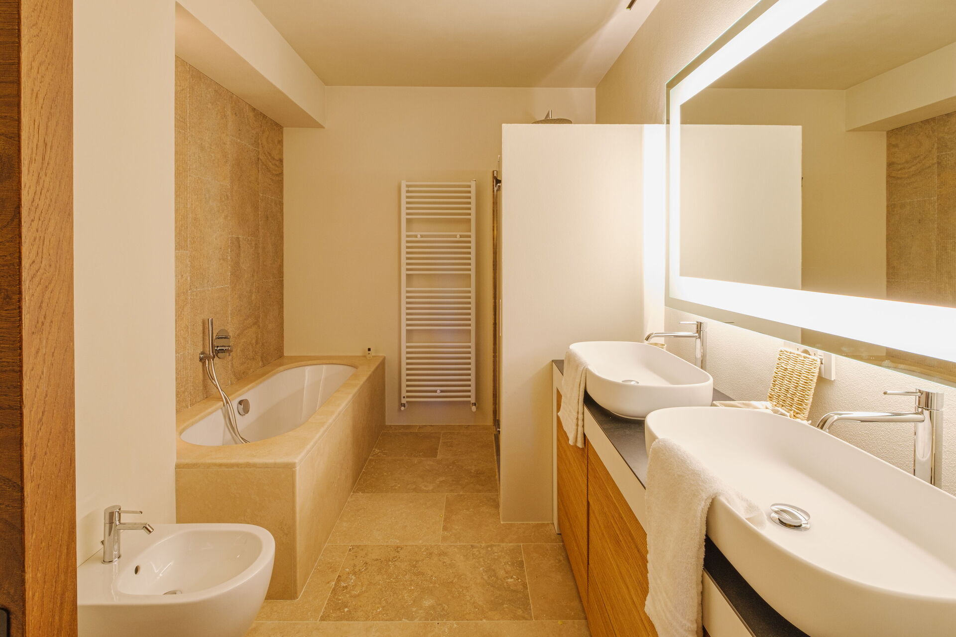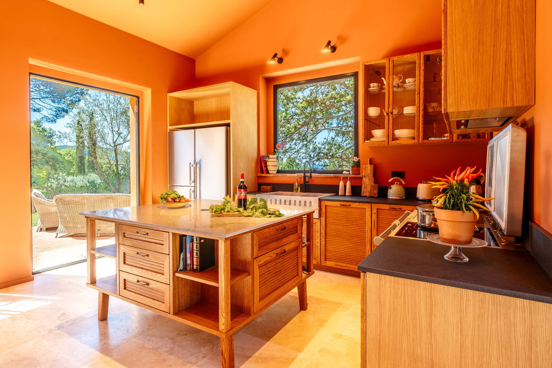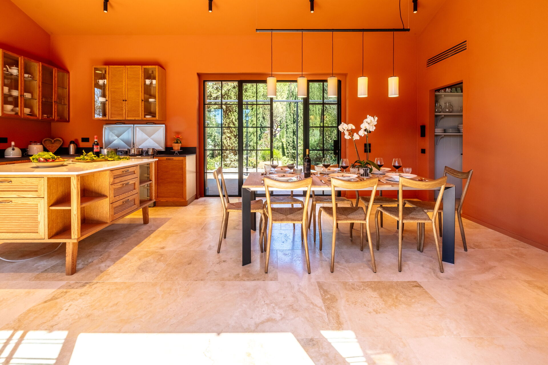 Stueetage: stor stue med pejs (smart TV), lys spisestue og køkken (induktionskogeplader, ovn, køleskab, fryser, opvaskemaskine, vinkøleskab, brødrister, espressomaskine, amerikansk kaffemaskine), vaskerum (vaskemaskine, tørretumbler og strygejern), dobbeltværelse (kan efter anmodning laves om til 2 enkeltsenge: sengemål: 90x195 cm, aircondition) med privat badeværelse med bruser; dobbeltværelse (king size seng: sengemål: 180x200 cm, aircondition) med privat badeværelse med bruser, adgang til haven; dobbeltværelse (king size seng: sengemål: 180x200 cm, aircondition) med privat badeværelse med bruser, dobbeltværelse (king size seng: sengemål: 180x200 cm, aircondition) med walk-in closet, privat badeværelse med bruser og badekar, dobbeltværelse (king size seng: sengemål: 180x200 cm, aircondition) med privat badeværelse med bruser (uden bidet, uden vindue), adgang til haven.