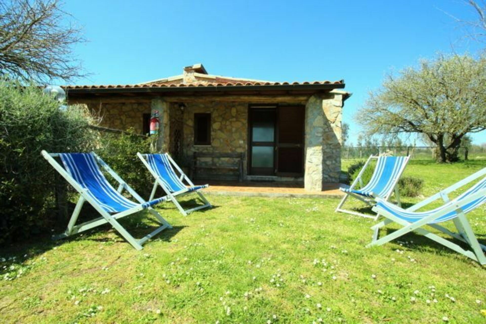 Stue med spiseplads og tekøkken (lille el-ovn, fryser, vaskemaskine), dobbeltværelse med udgang til det fri, badeværelse med bruser, dobbeltværelse med ekstra enkeltseng og udgang til det fri