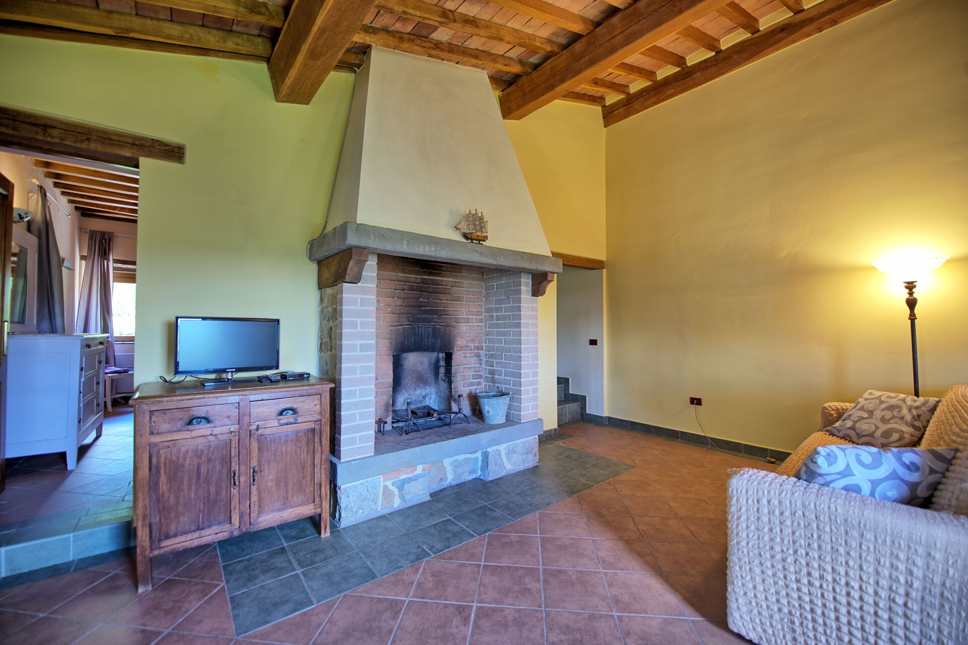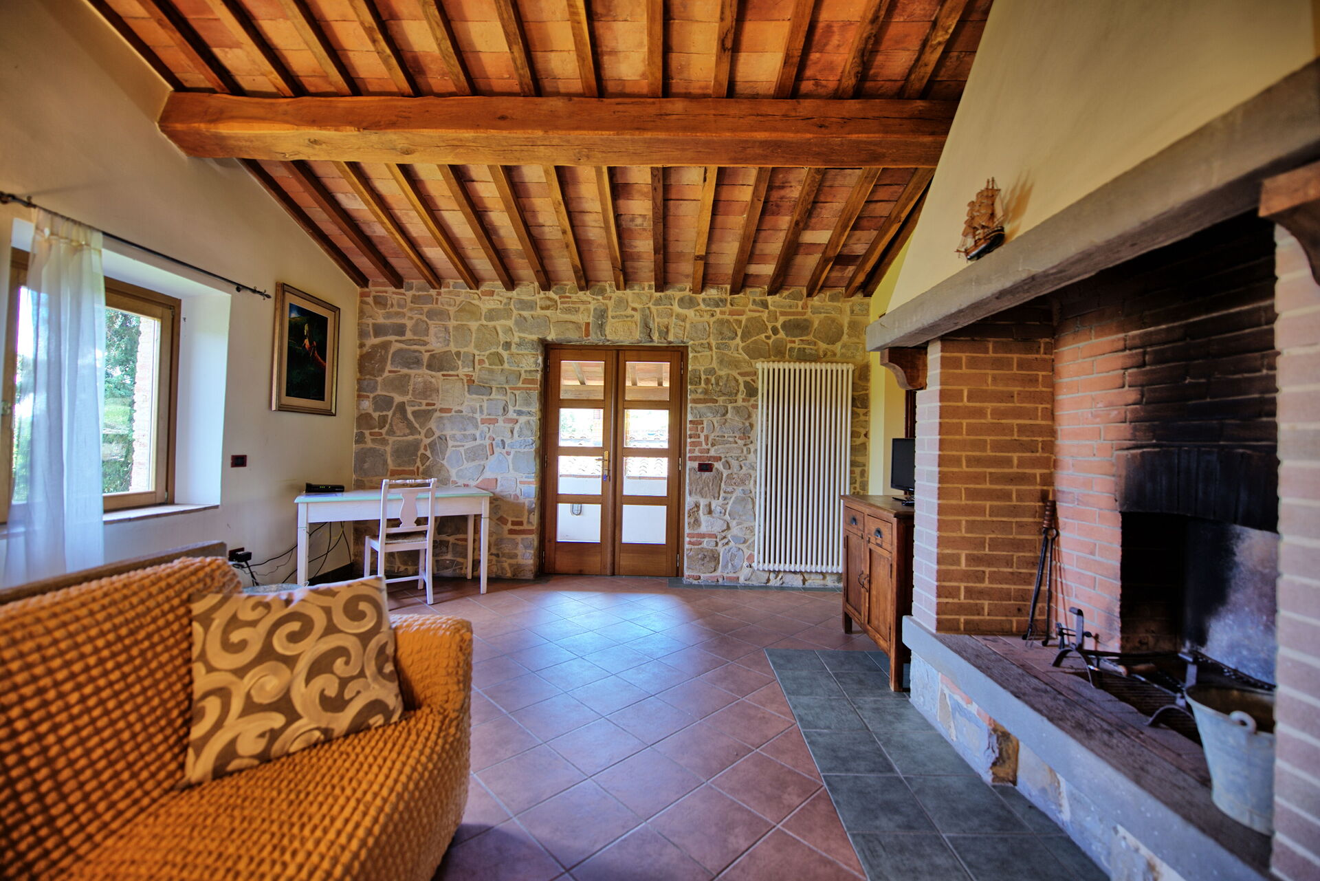 1st Floor: living room (Satellite TV) with fireplace and access to a small, private furnished terrace, bedroom with 2 single beds (air conditioning)