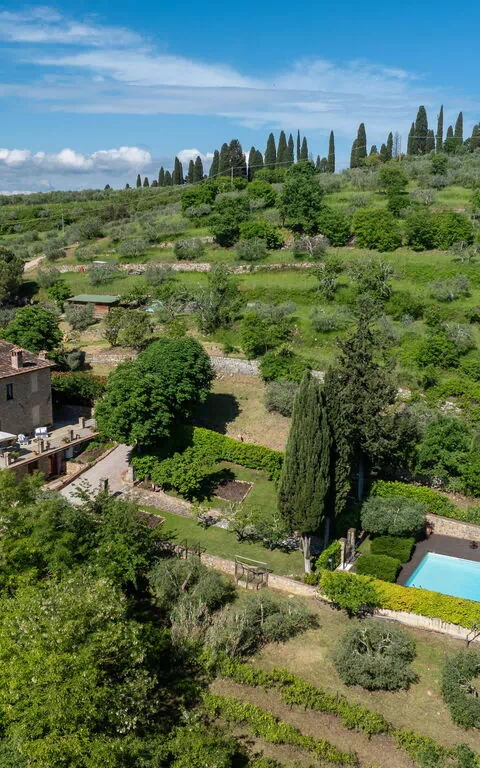 Tenuta Macericca er et smukt feriehus med privat pool og panoramaudsigt over det grønne toscanske landskab, beliggende midt mellem Firenze og Siena.