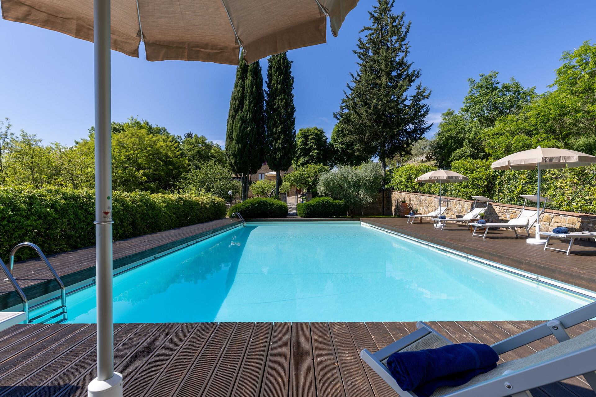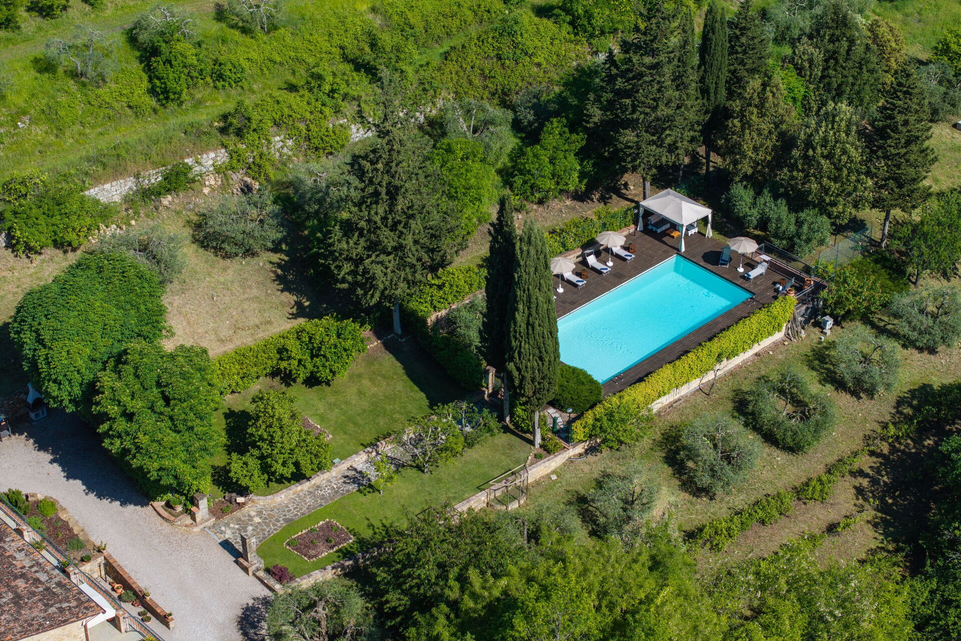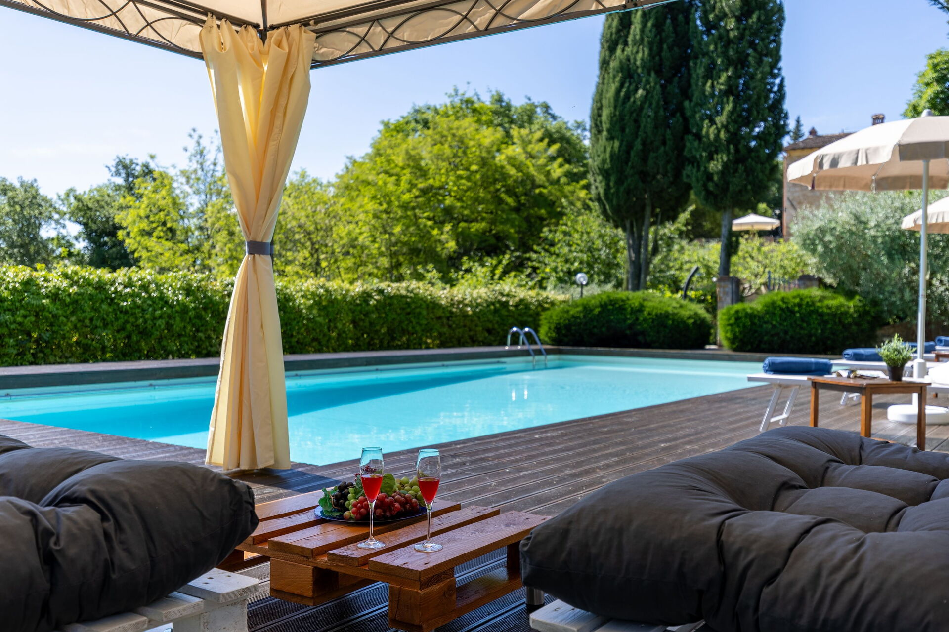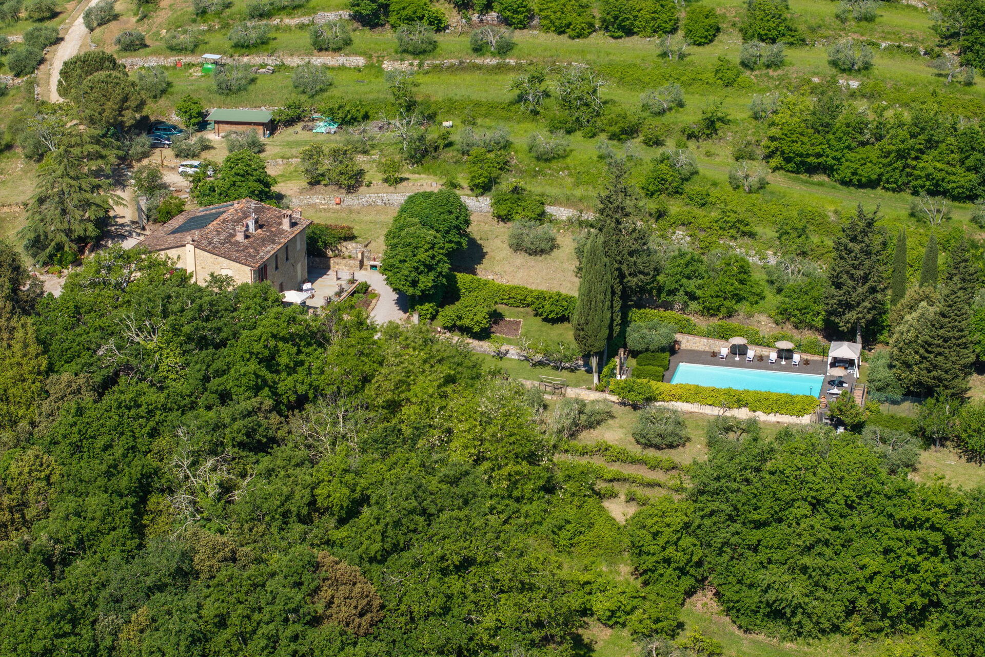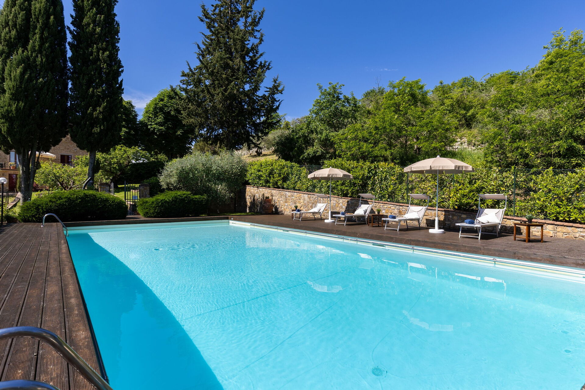 Udendørs er der en terrasse med borde og stole, så gæsterne kan nyde måltider under åben himmel med smuk udsigt over landskabet. Den velholdte have, med en fuldt indhegnet pool og liggestole, er det perfekte sted at slappe af på solrige sommerdage i Toscana.