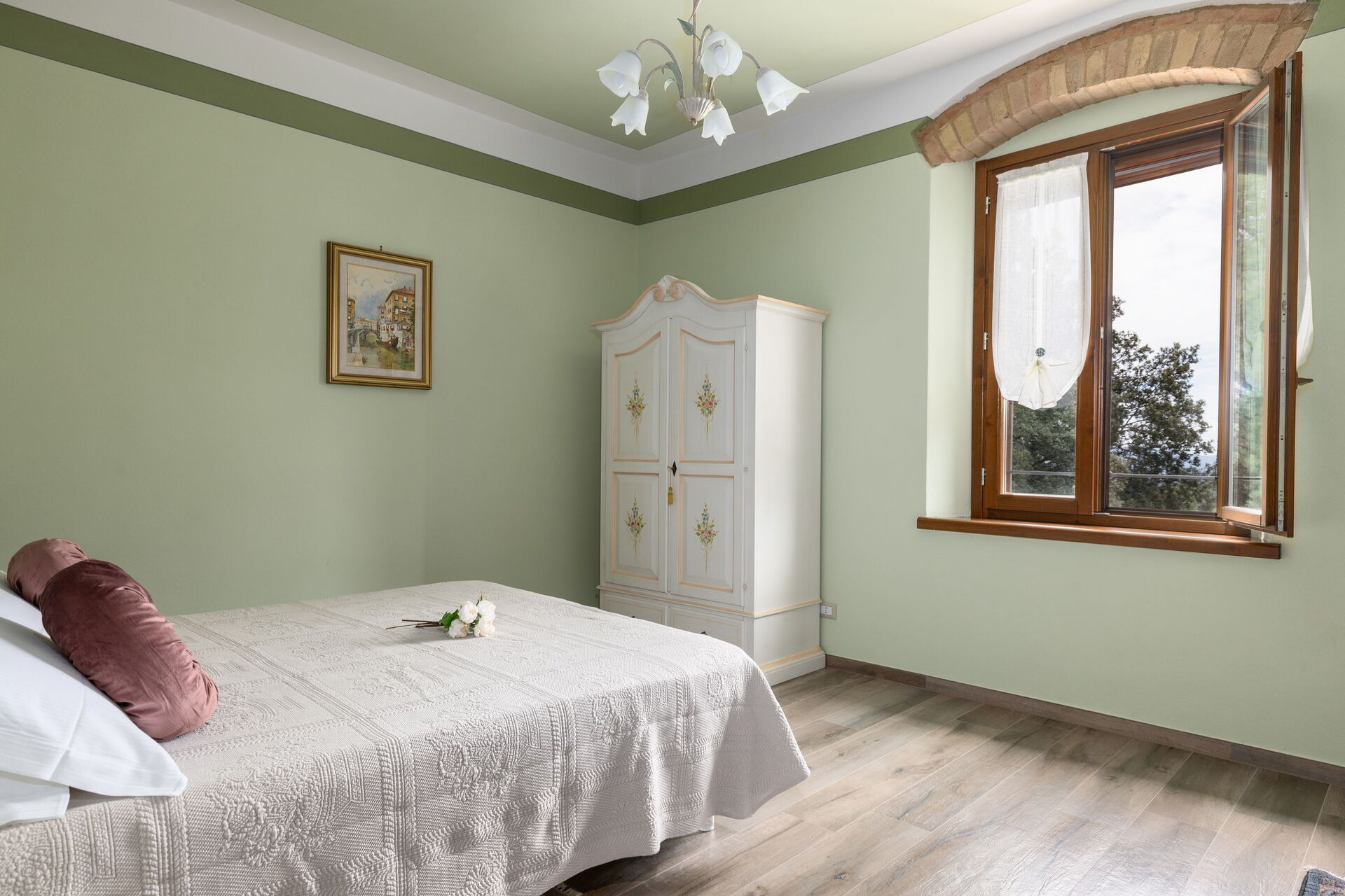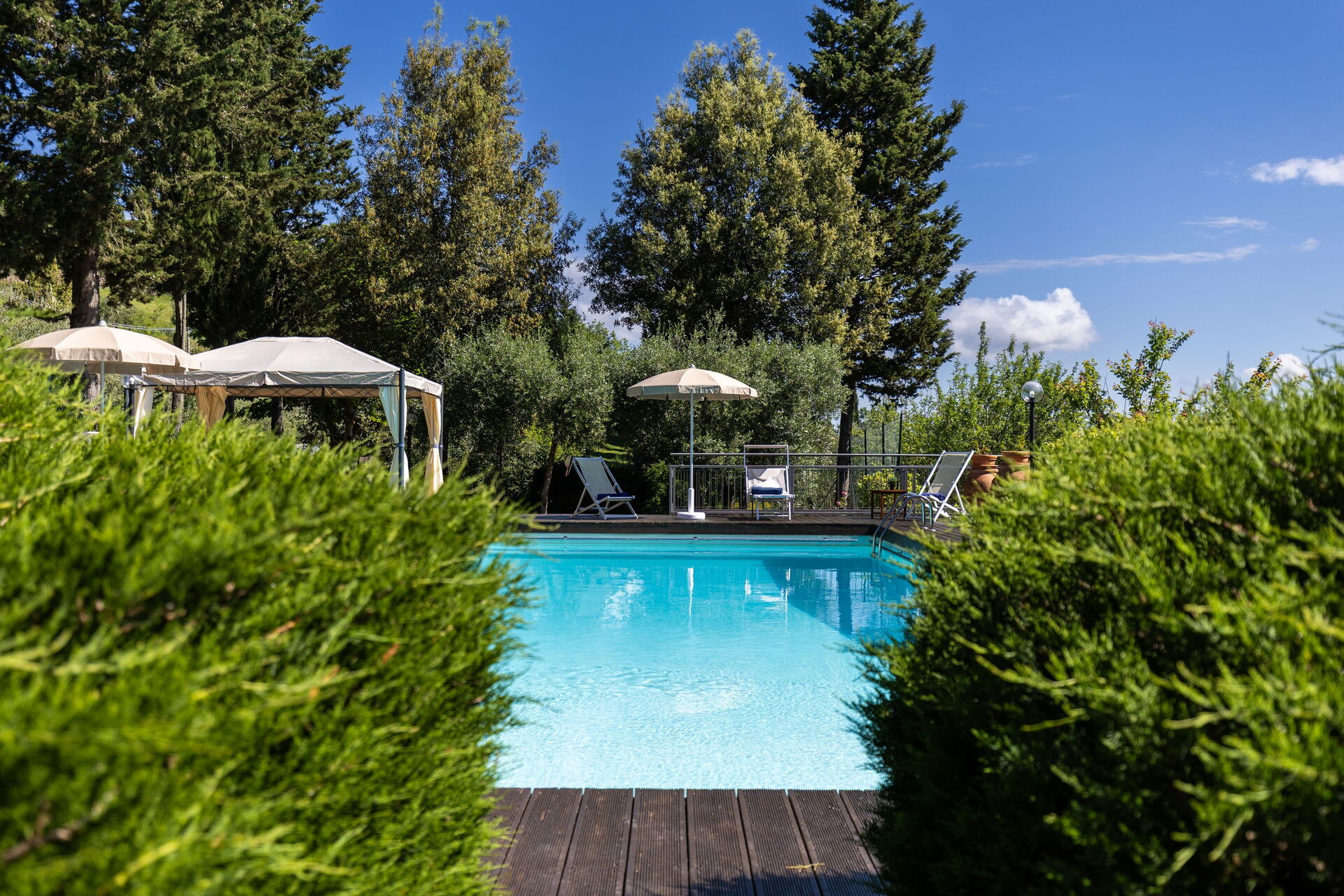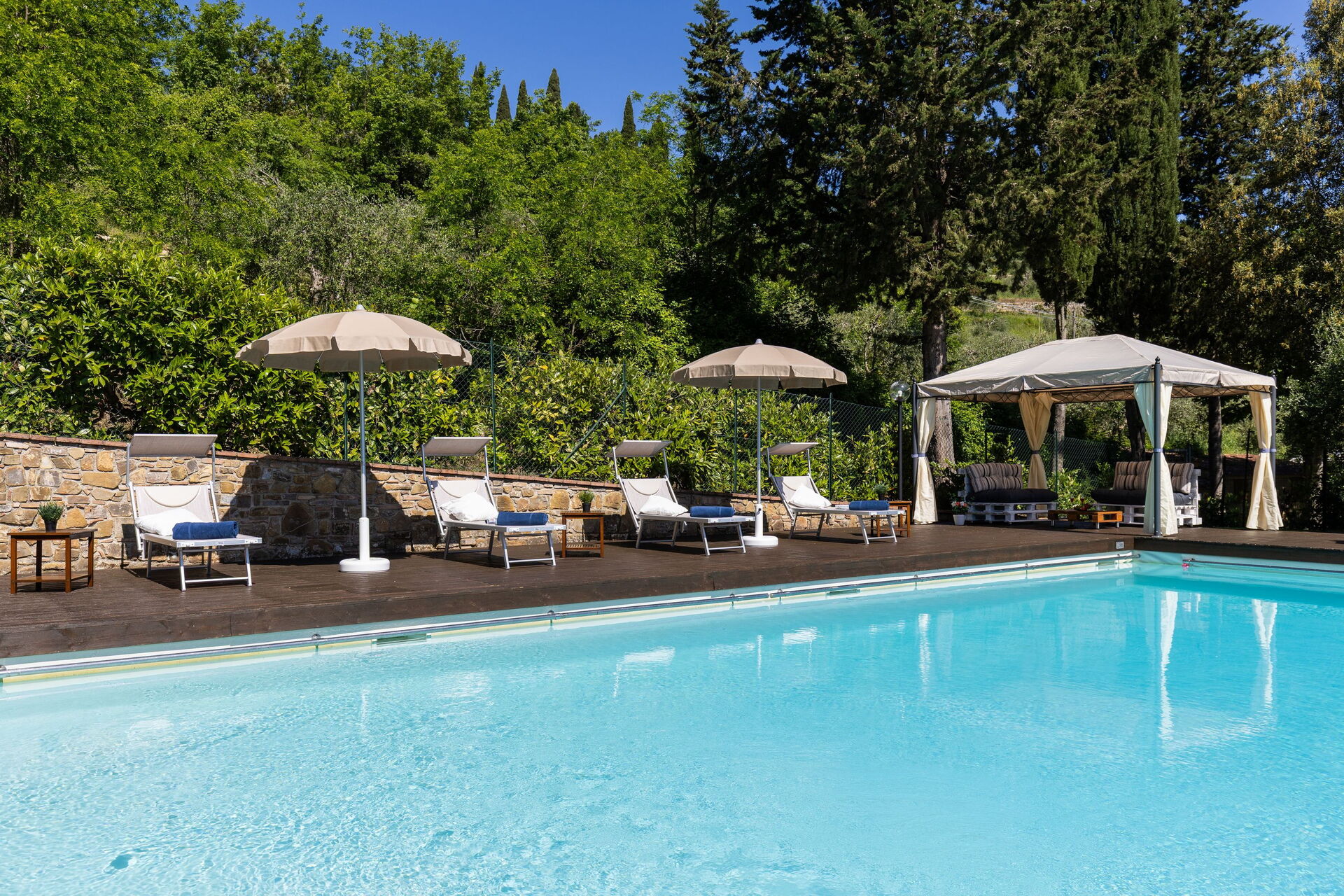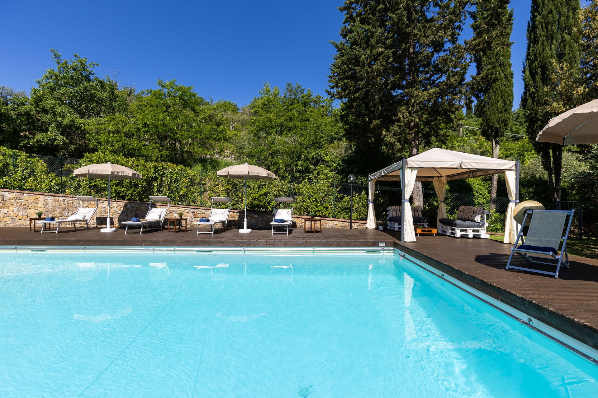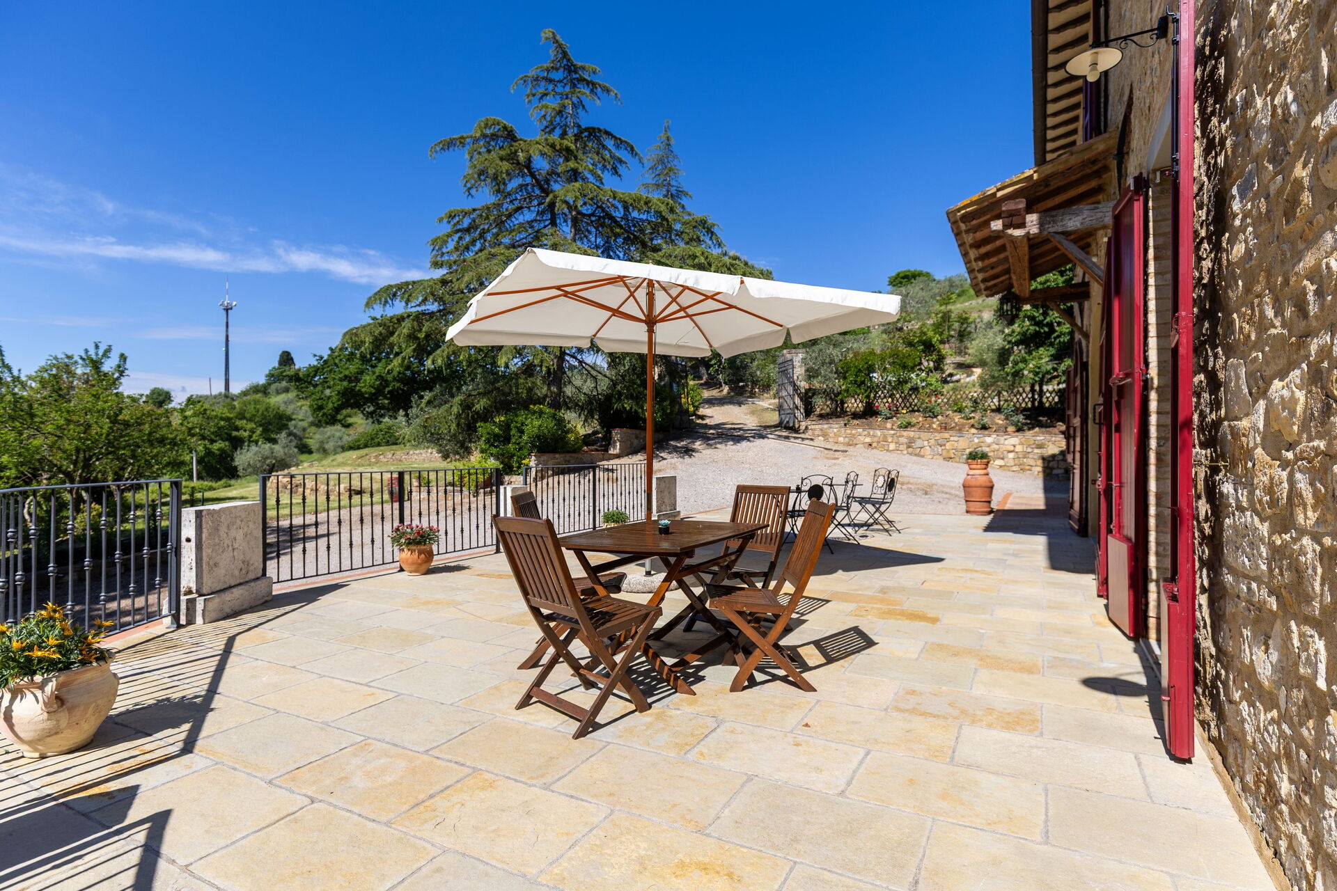 Udendørs er der en terrasse med borde og stole, så gæsterne kan nyde måltider under åben himmel med smuk udsigt over landskabet. Den velholdte have, med en fuldt indhegnet pool og liggestole, er det perfekte sted at slappe af på solrige sommerdage i Toscana.