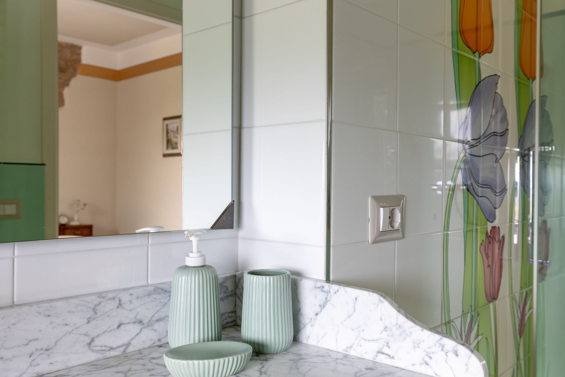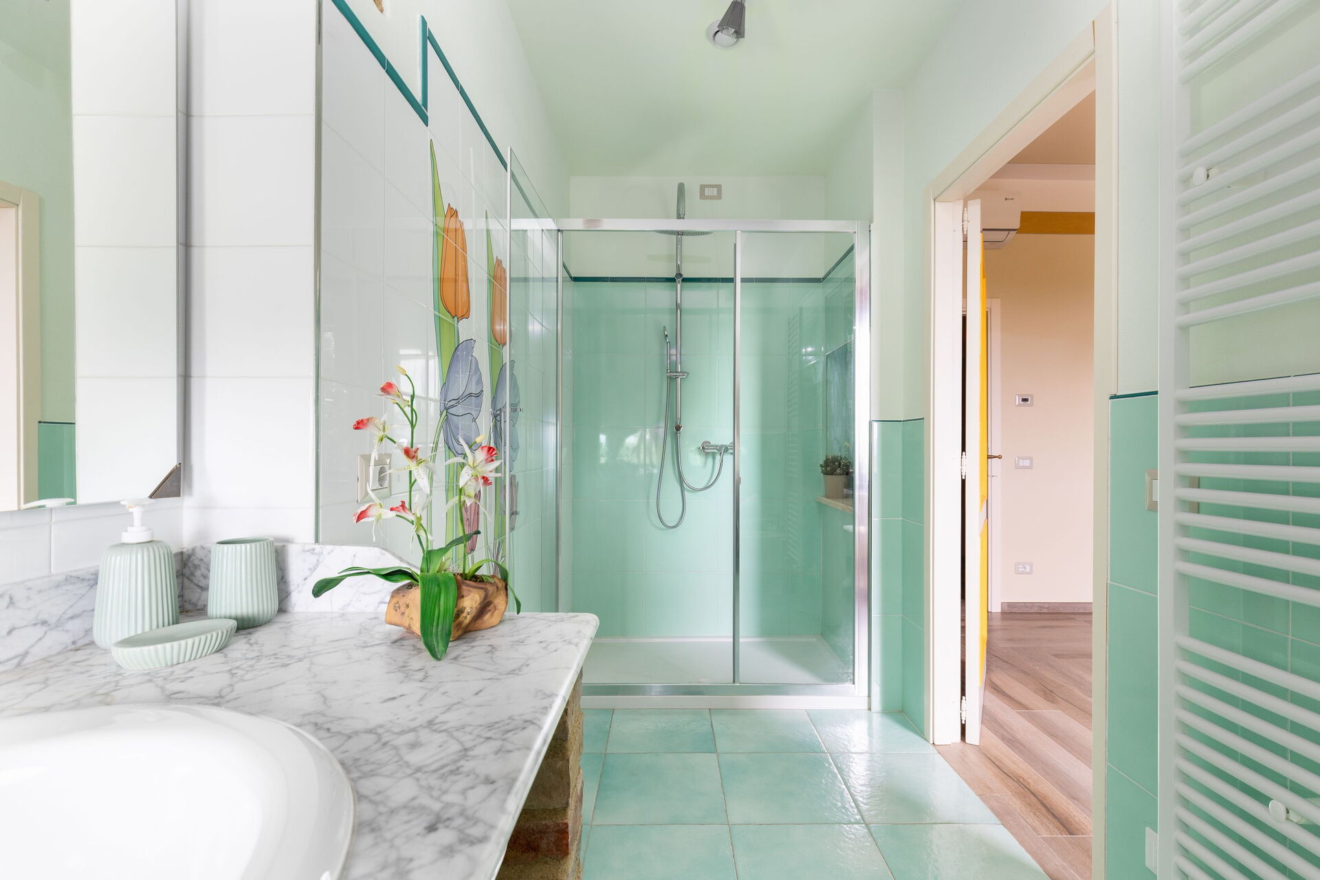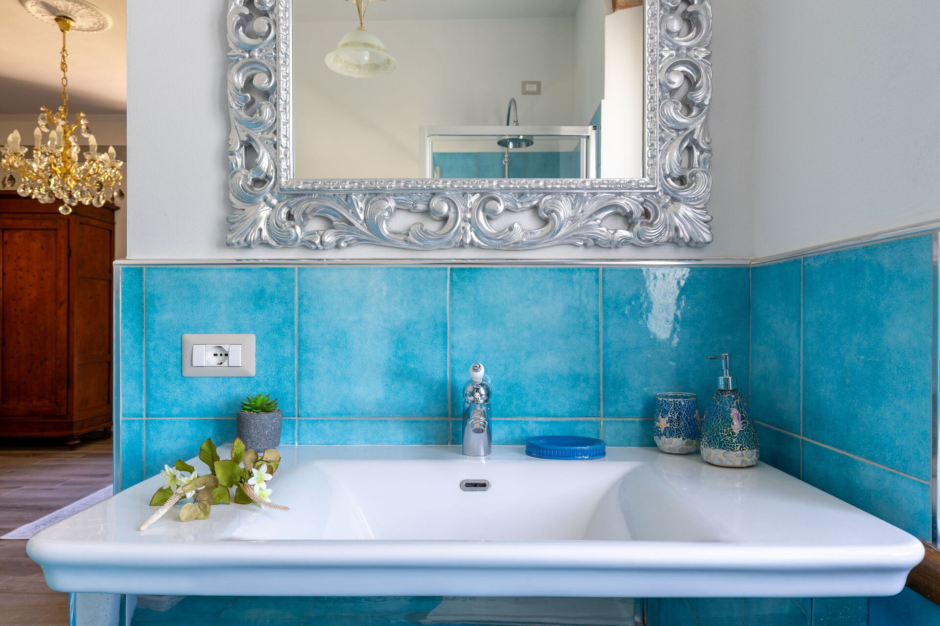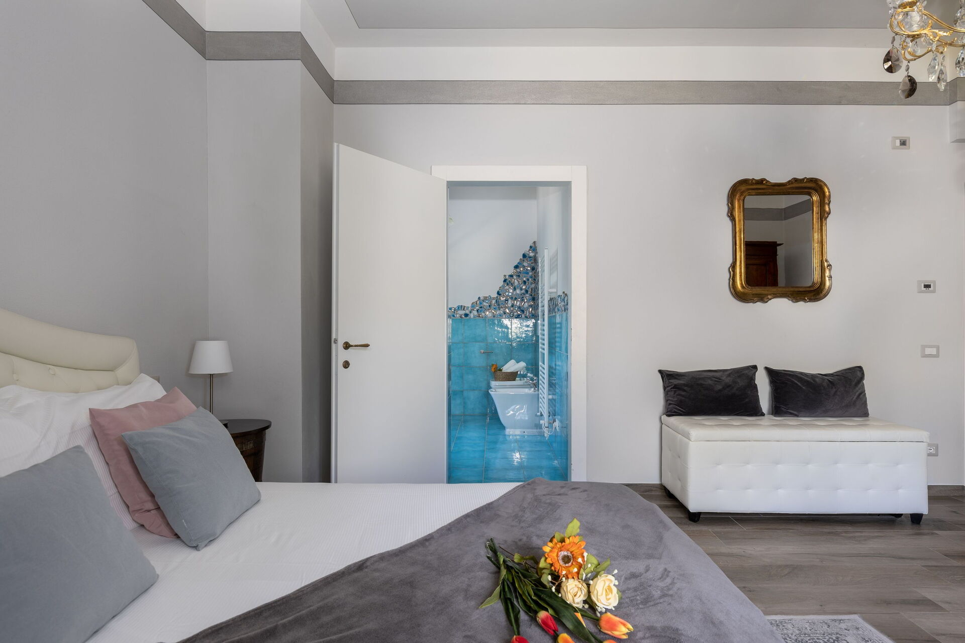 Første sal: 2 dobbeltværelser med privat badeværelse med bruser, dobbeltværelse med privat badeværelse med multifunktionel bruser med farveterapi og dampfunktion, dobbeltværelse (seng kan opdeles i 2 enkeltsenge efter anmodning) med privat badeværelse med badekar med jacuzzi, dobbeltværelse med privat badeværelse med badekar.