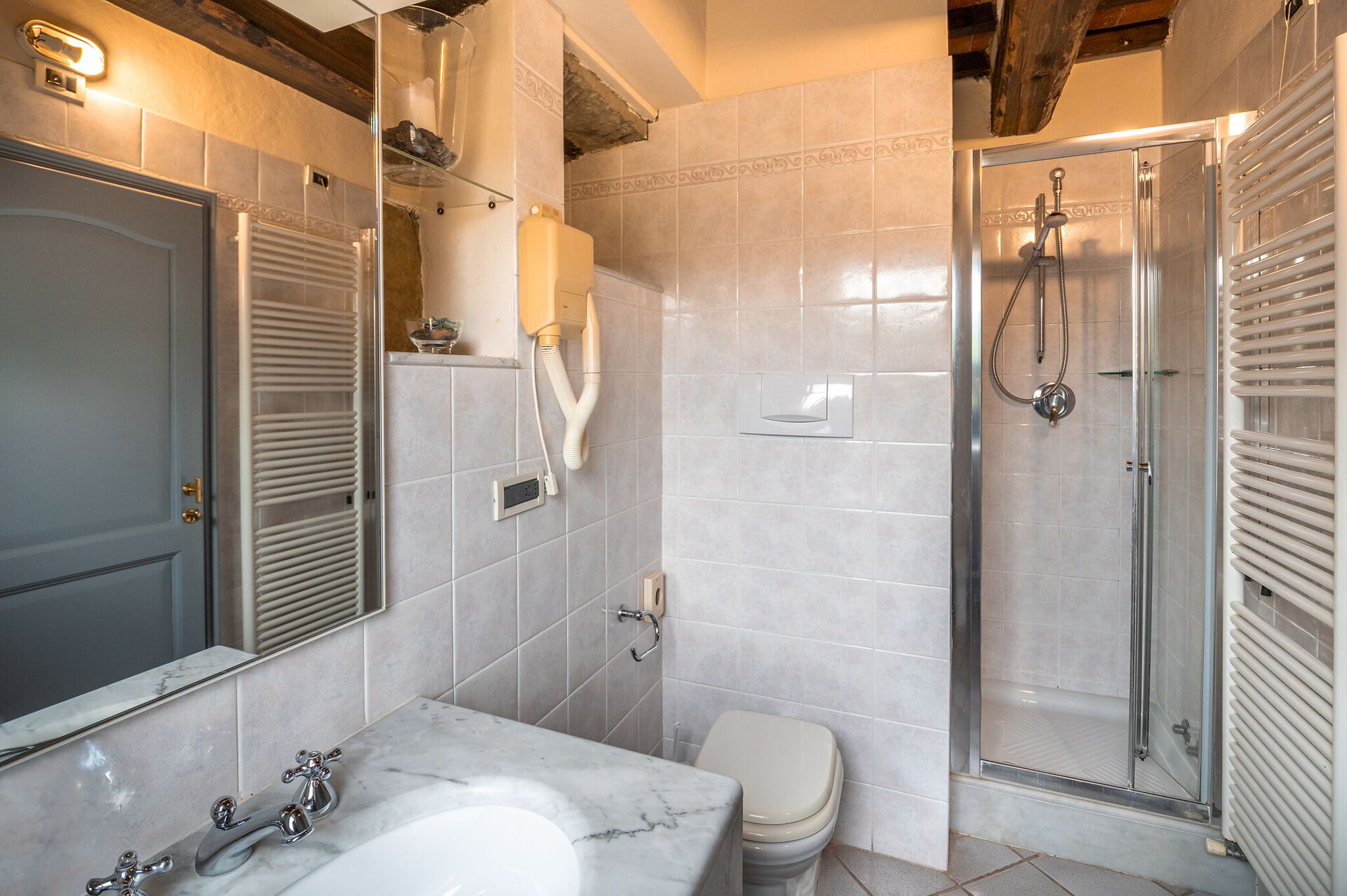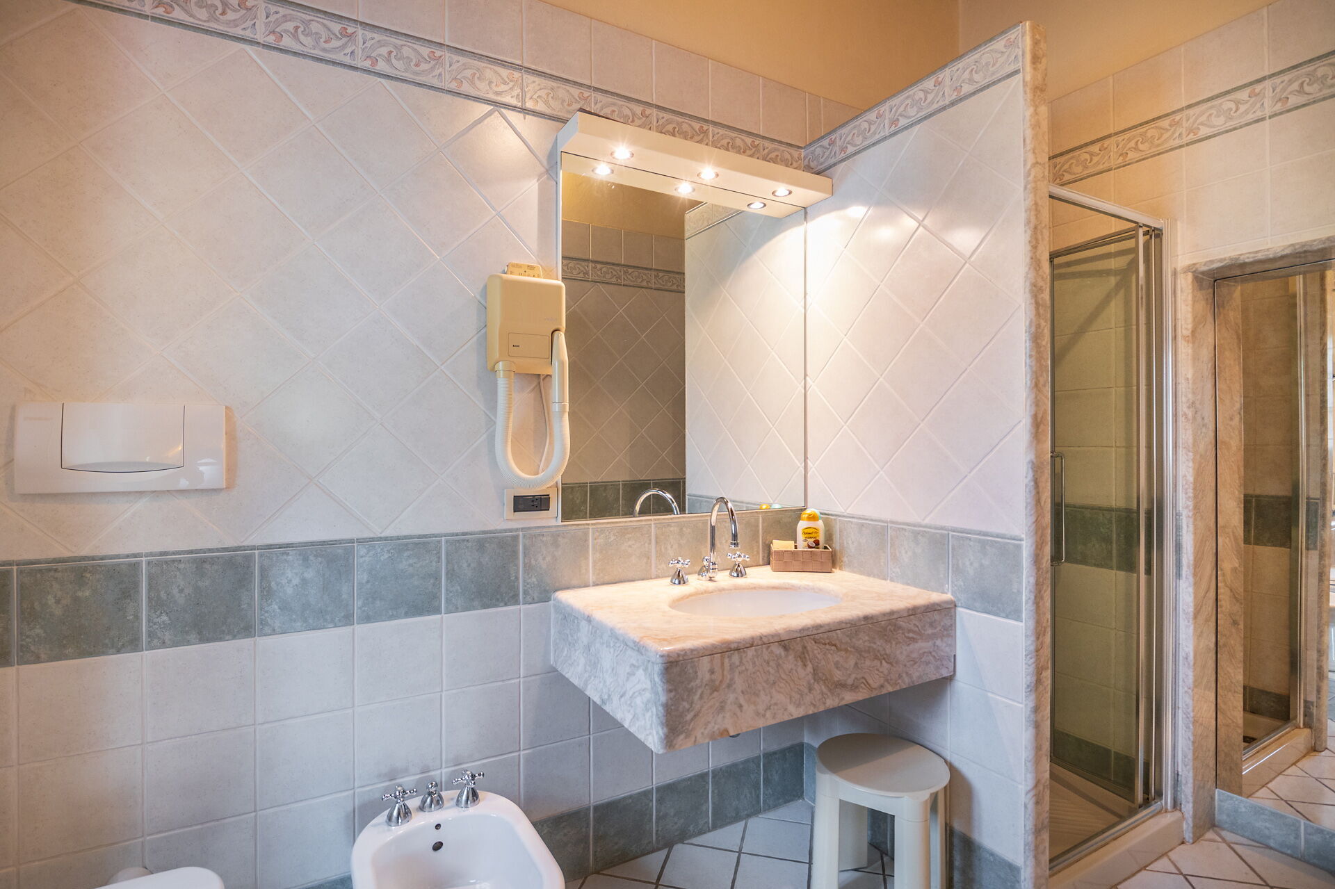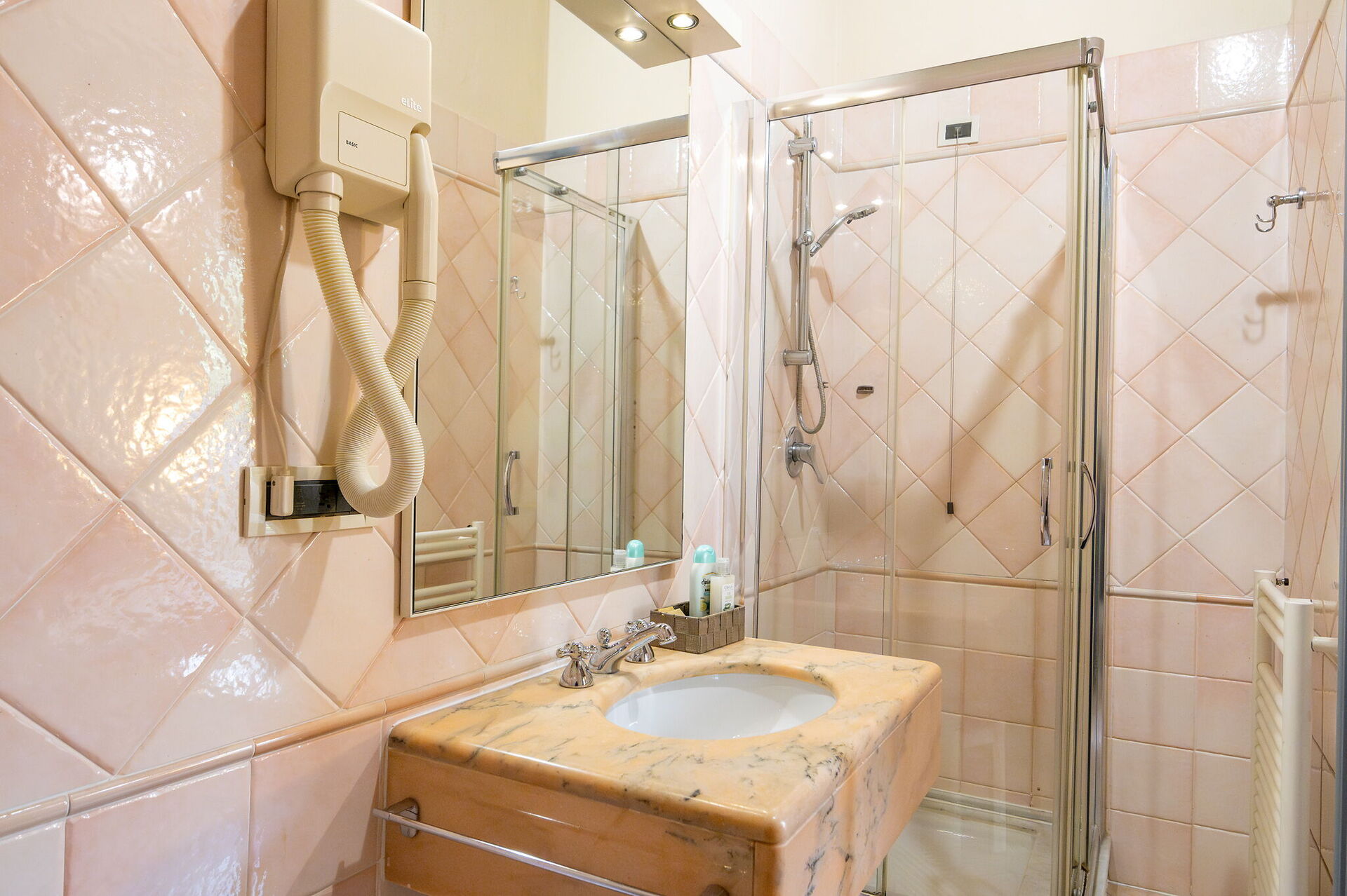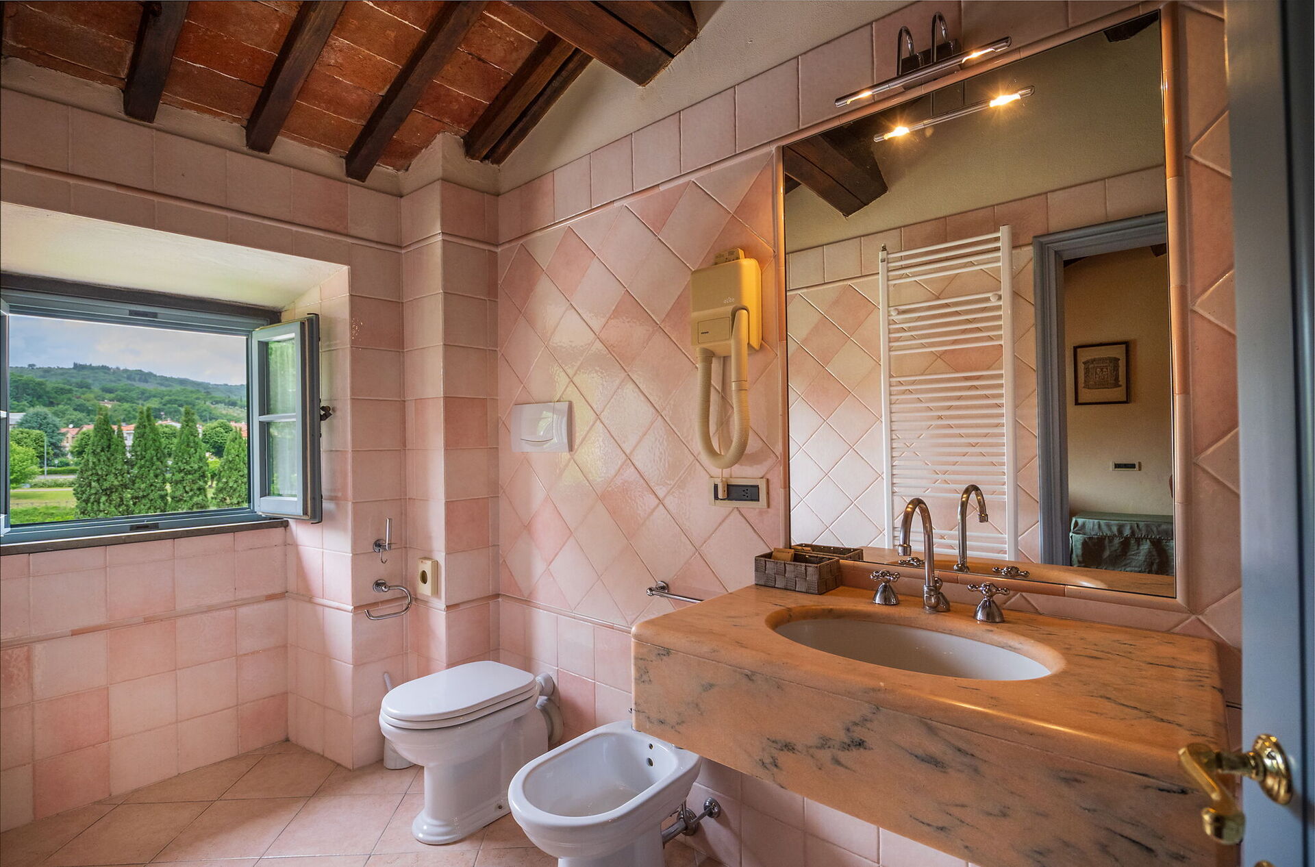 Stueetage: suite med indgang fra en panoramaterrasse med udsigt over Arno. Denne suite består af et soveværelse med dobbeltseng og eget badeværelse med badekar og bruser.