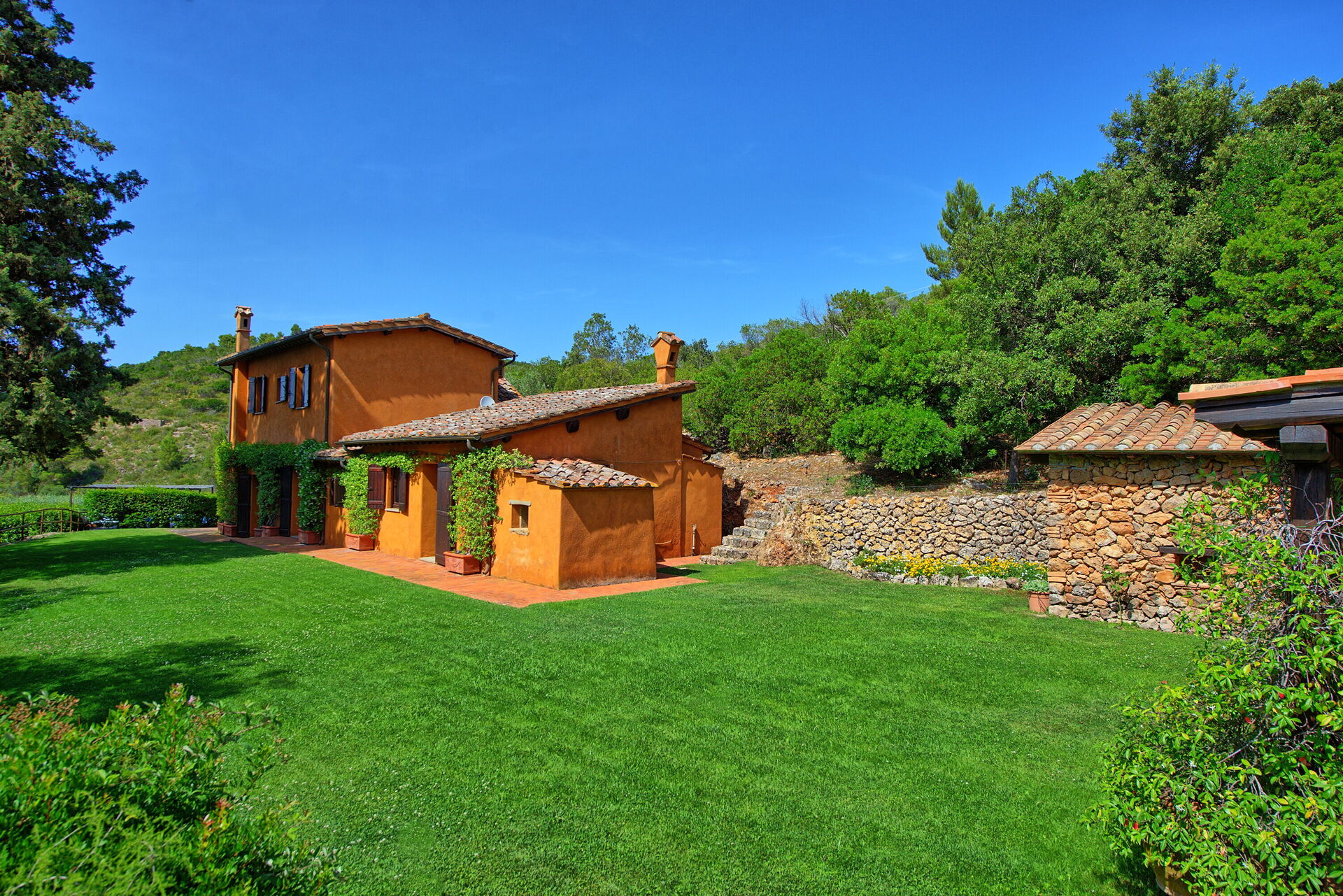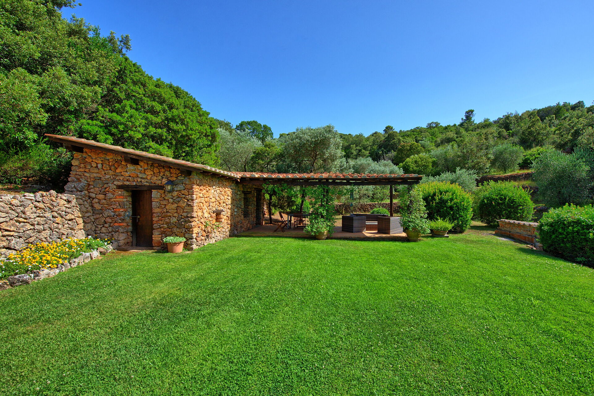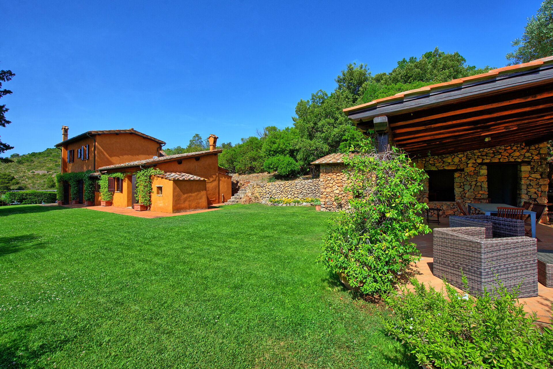 Sommerhuset ligger kun 1 km fra Porto Santo Stefano, på det berømte forbjerg Monte Argentario. Området er kendt for sin smukke kystlinje og Maremma-regionens mediterrane kratvegetation og charmerende byer.