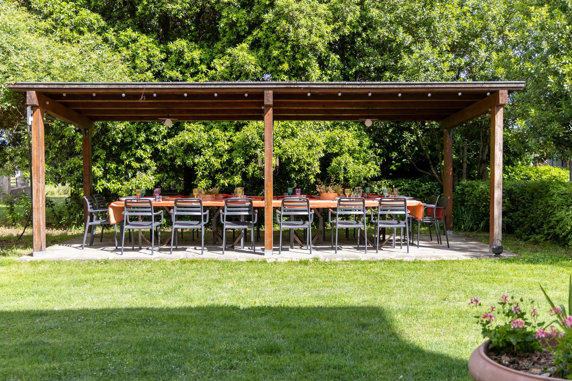 Udenfor enhed (tilgængelig fra haven) med køkken beliggende ved siden af ?? en møbleret havepavillon med bord og stole.