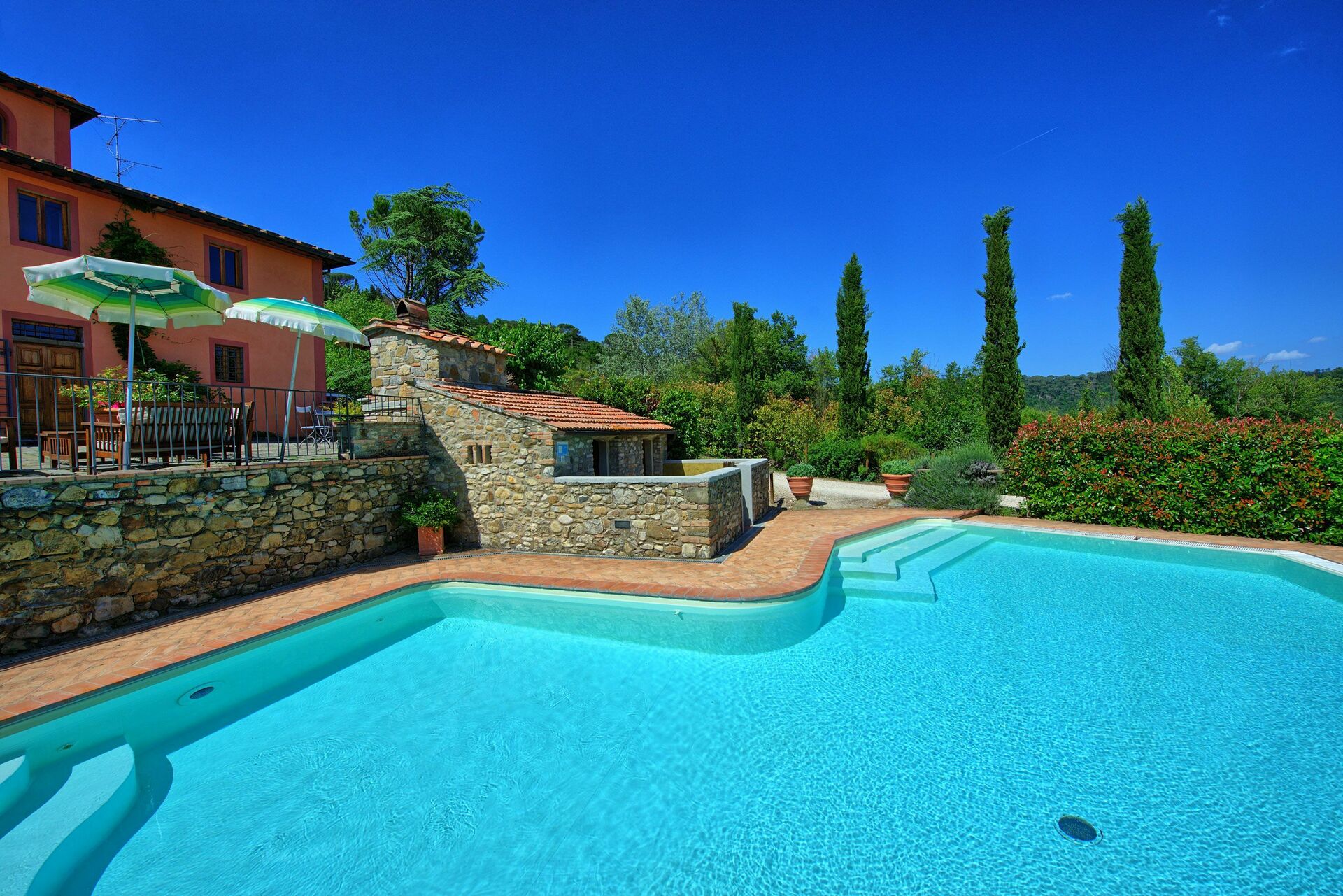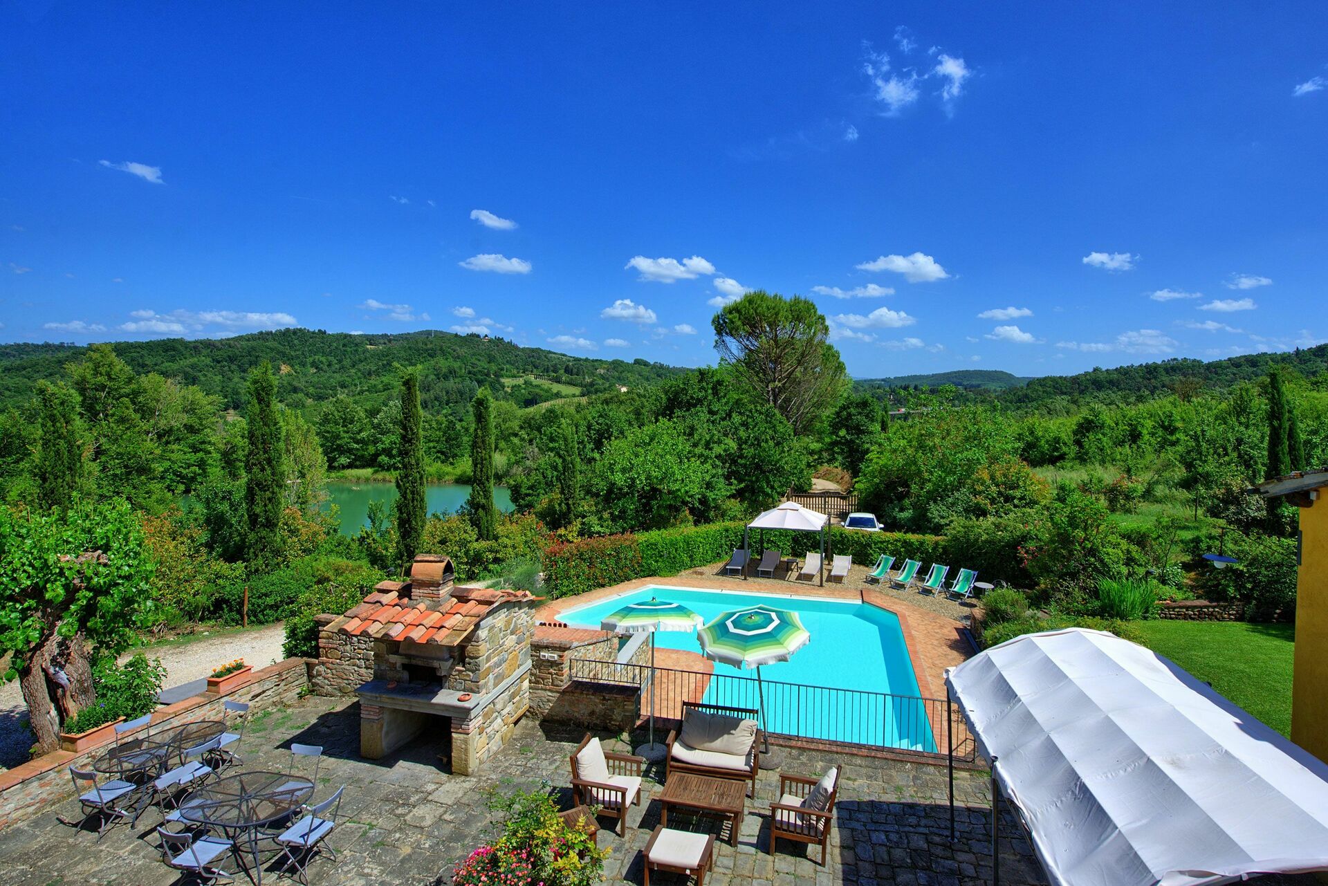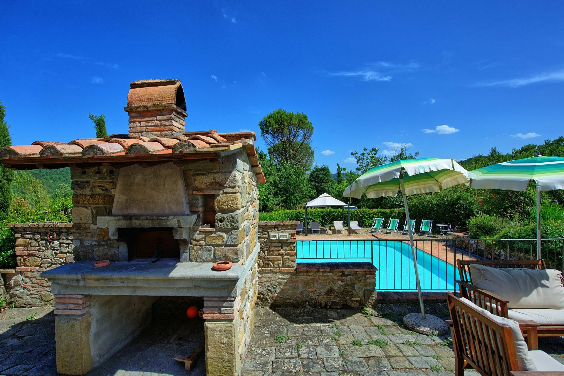Udenfor tilbyder denne pragtfulde villa en betagende panoramaudsigt over bakkerne og det omkringliggende landskab. En velholdt have omgiver ejendommen og tilbyder en stor privat swimmingpool med liggestole og parasoller: det ideelle sted at tilbringe uforglemmelige øjeblikke med dine venner og familie. En grillplads udstyret med borde og stole er perfekt til at spise udendørs, nyde udsigten over naturen og landluften.