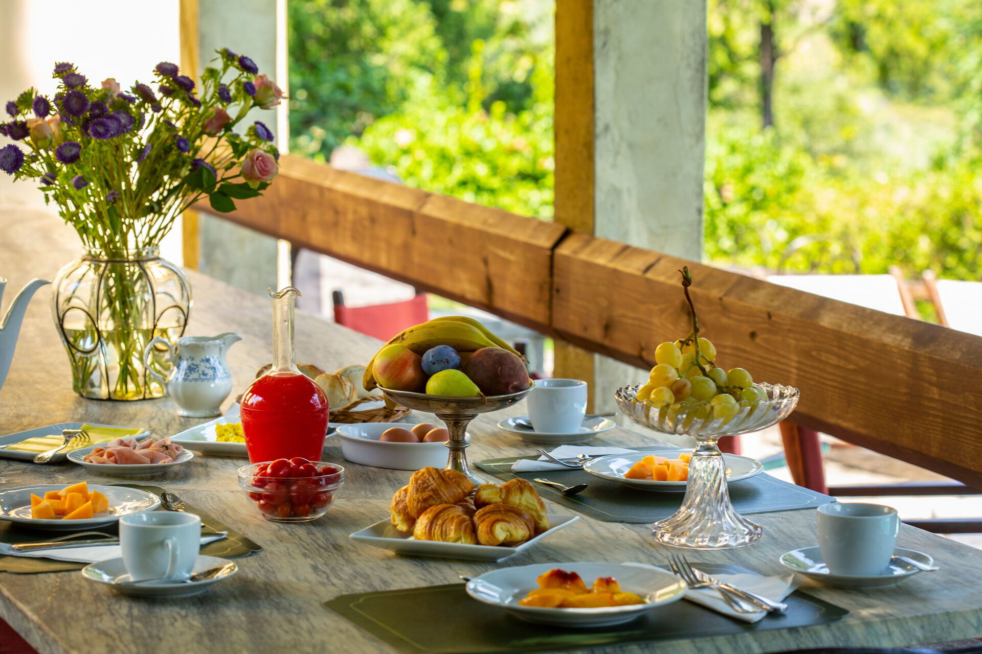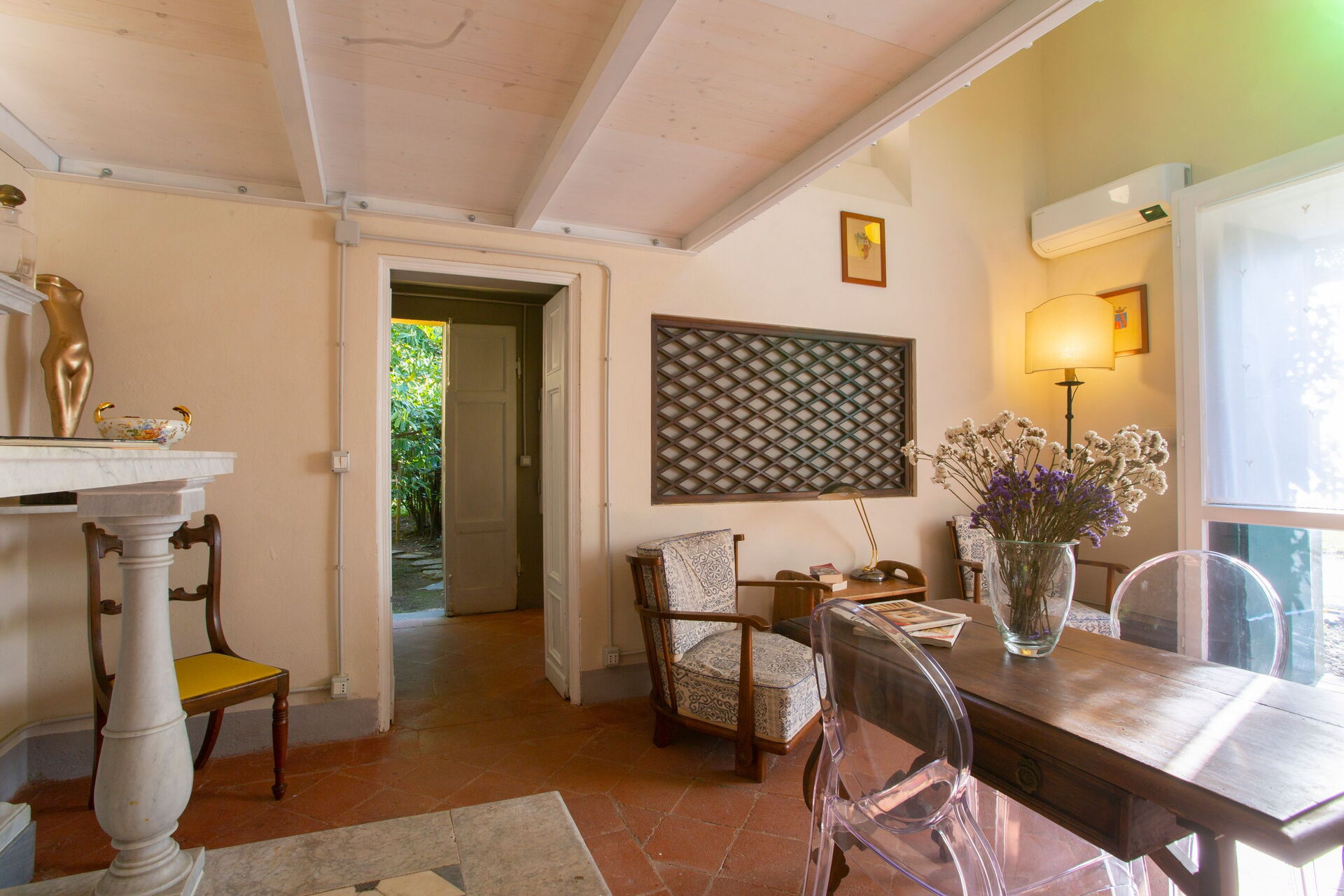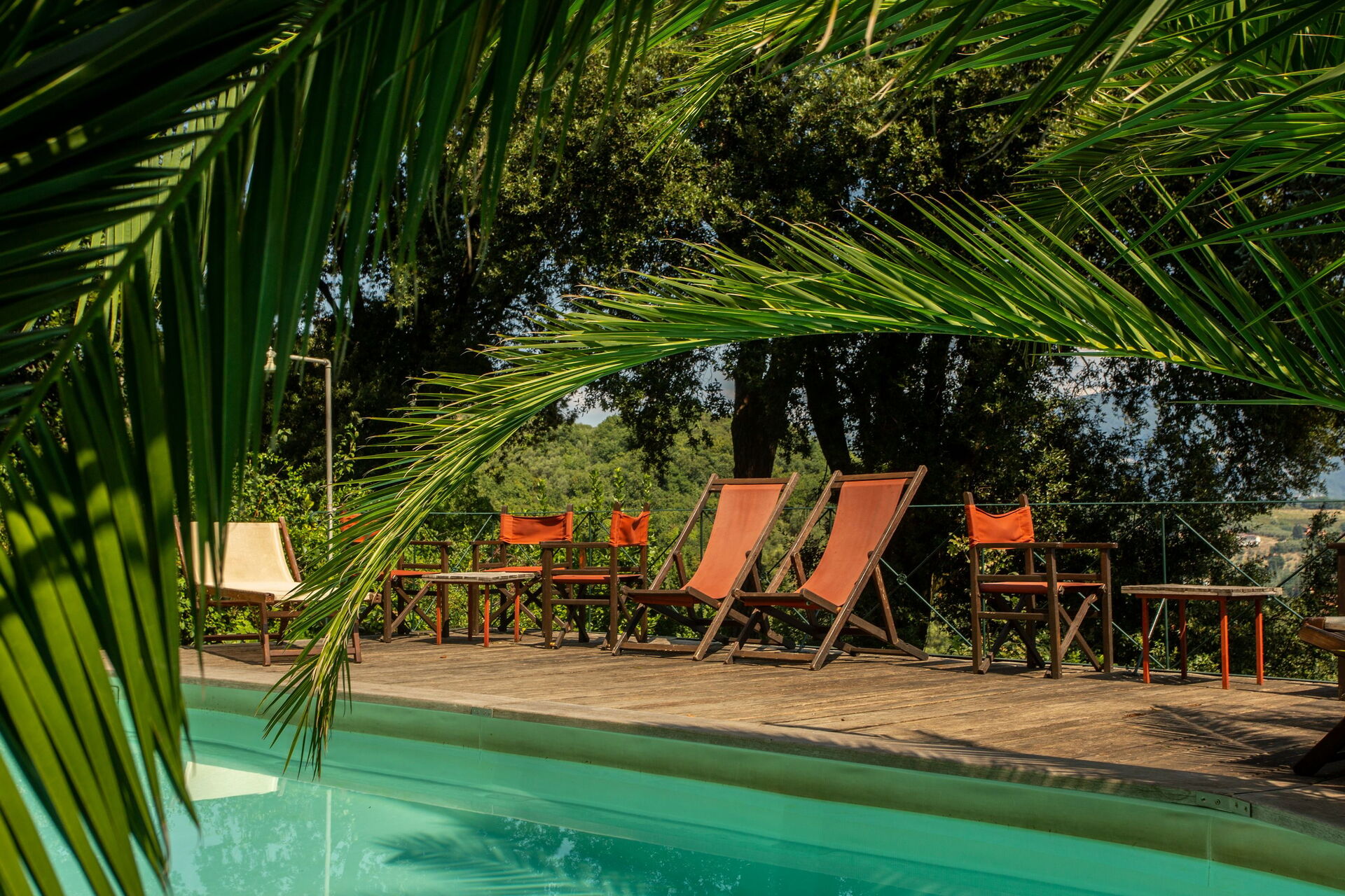 Haven omkring ejendommen er afgrænset af en 2m høj mur, som omkranser tre sider af palæet. Den fjerde side er omkranset af et lavt hegn for at give udsigt over de lavere bakker, vinmarker og olivenlunde. Swimmingpoolen og udendørs spisning er på denne side.