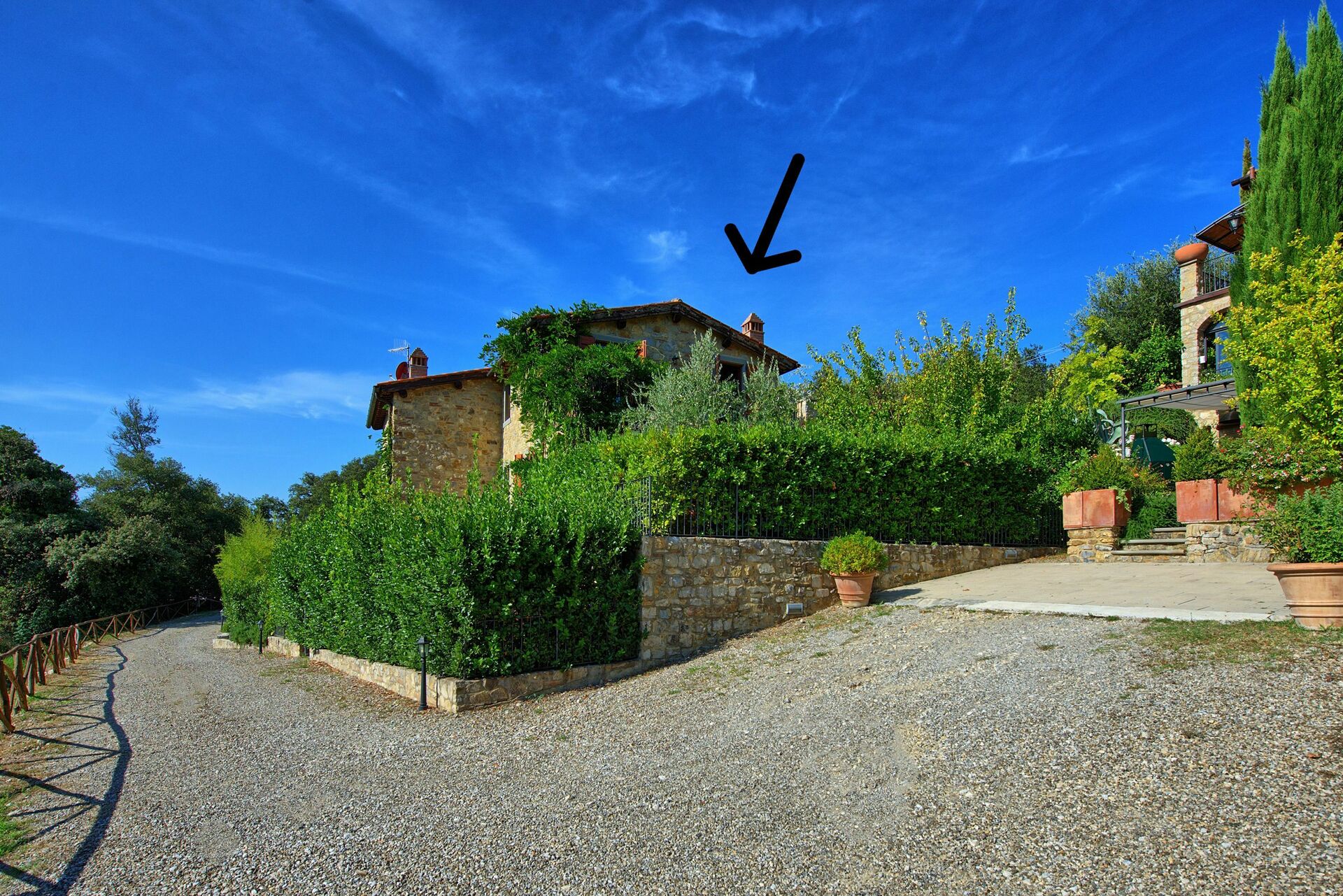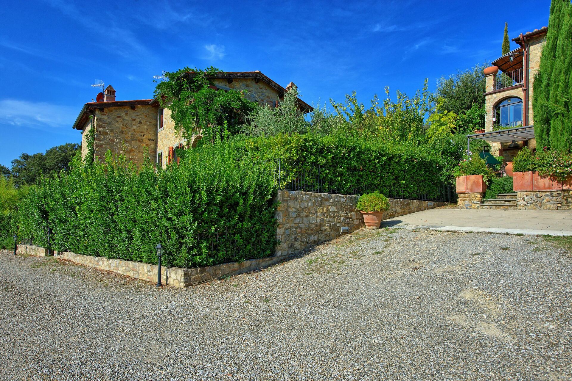 Ferielejligheden er smagfuldt indrettet med materialer fra Toscana. Uden for et privat udstyret område til udendørs spisning og nyde det smukke omkringliggende landskab. En smuk swimmingpool ligger få meter væk og deles med gæsterne i de andre enheder på ejendommen. Foran huset er der en rummelig asfalteret terrasse, indrettet med et bord, seks klapstole, en stor parasol og en grill. Terrassen er omgivet af et indhegnet hegn og høje planter, der giver noget privatliv. Ved siden af huset i stueetagen er en møbleret loggia med udsigt over en velholdt indhegnet have.