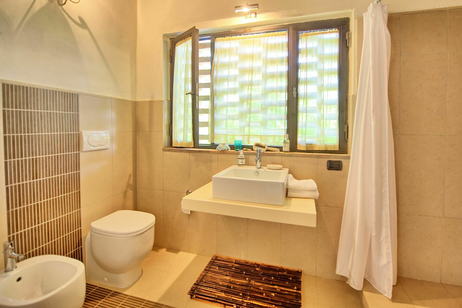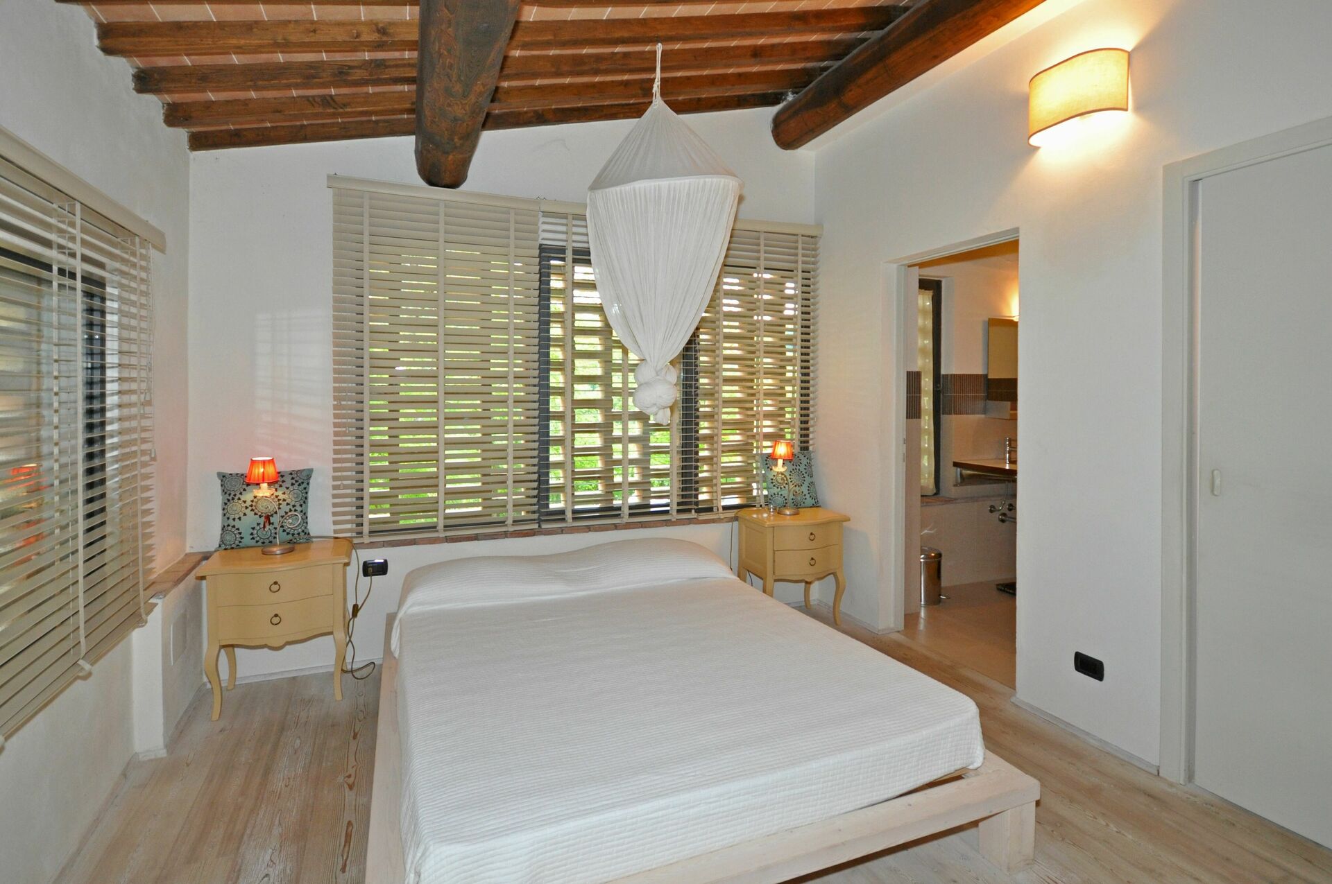Første sal : soveværelse med dobbeltseng (airconditioning; efter anmodning kan dobbeltsengen konverteres til 2 enkeltsenge), soveværelse med dobbeltseng (airconditioning) med eget badeværelse med jacuzzi, opholdsstue (airconditionering), badeværelse med bruser.